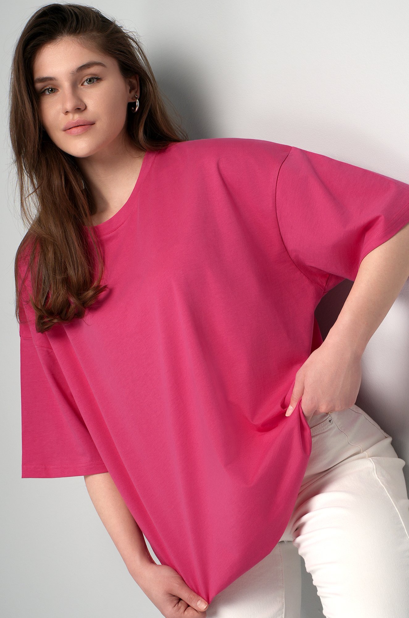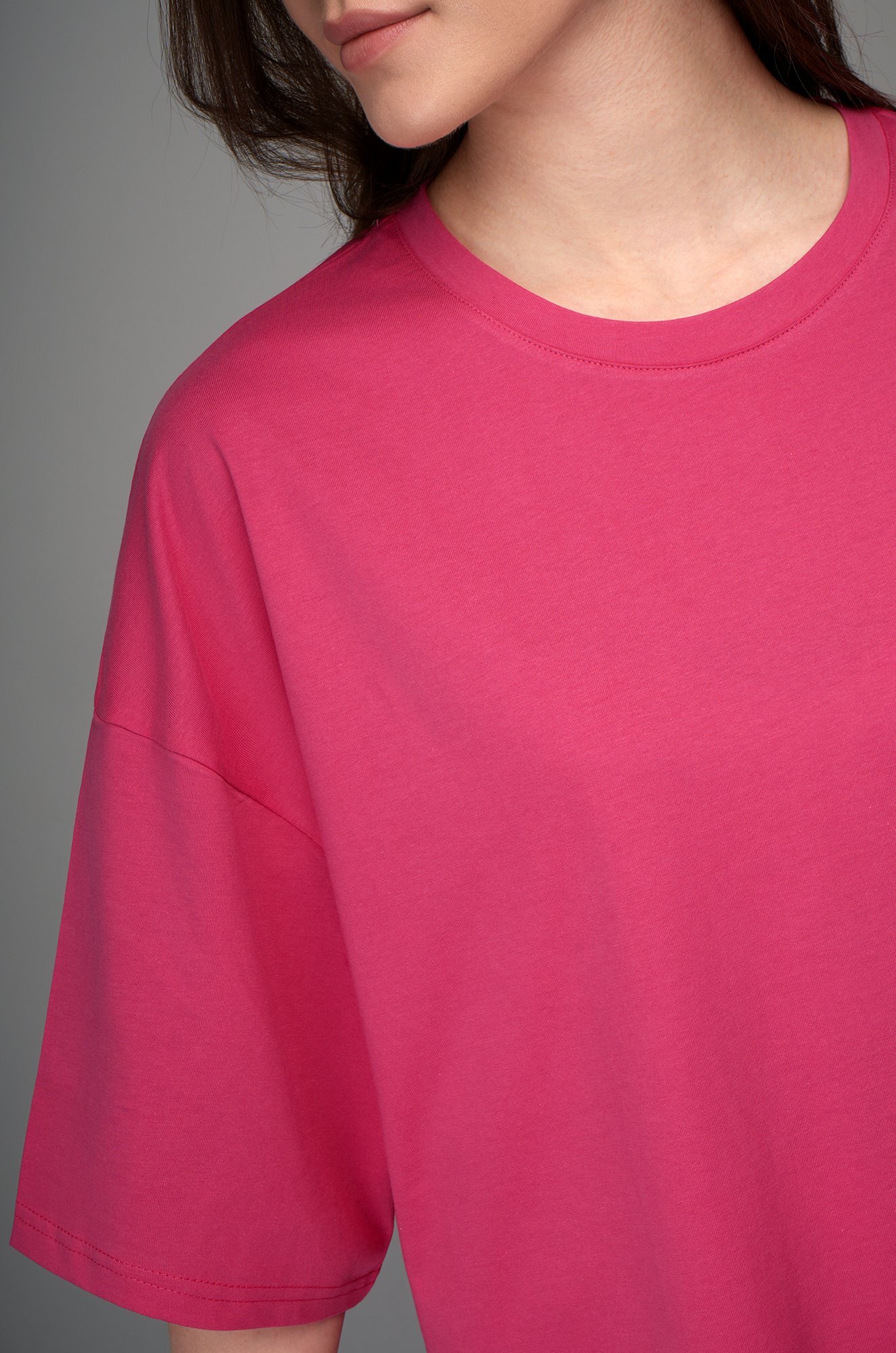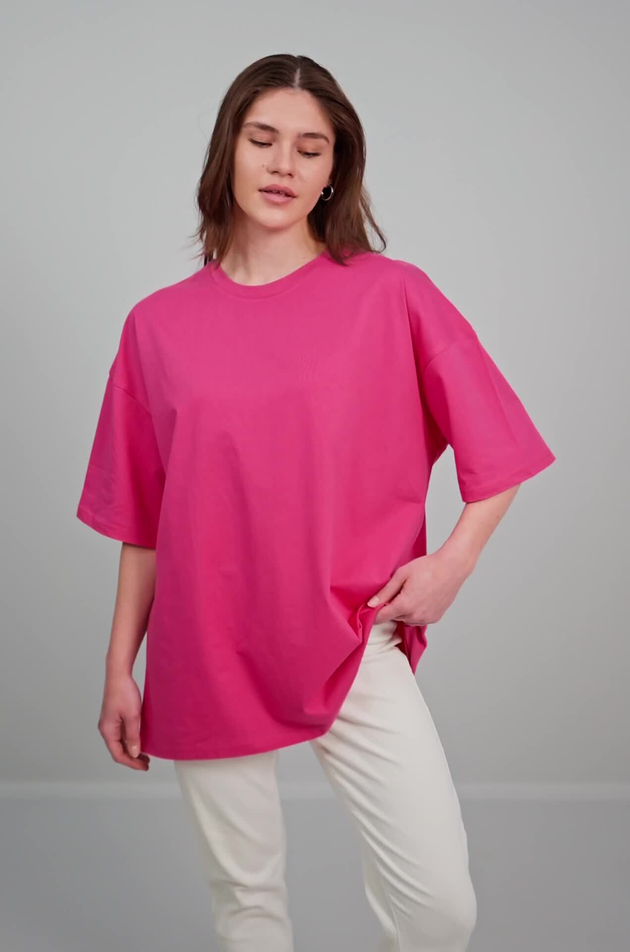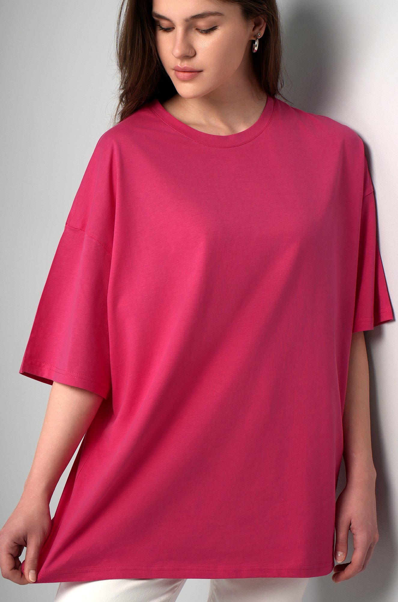 Трикотажная ярко-розовая футболка для женщин отлично подойдёт для образов в уличном стиле.