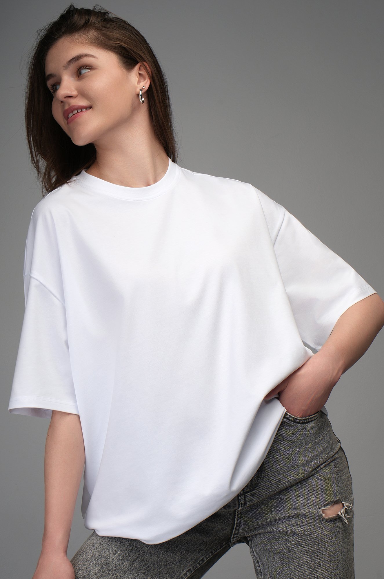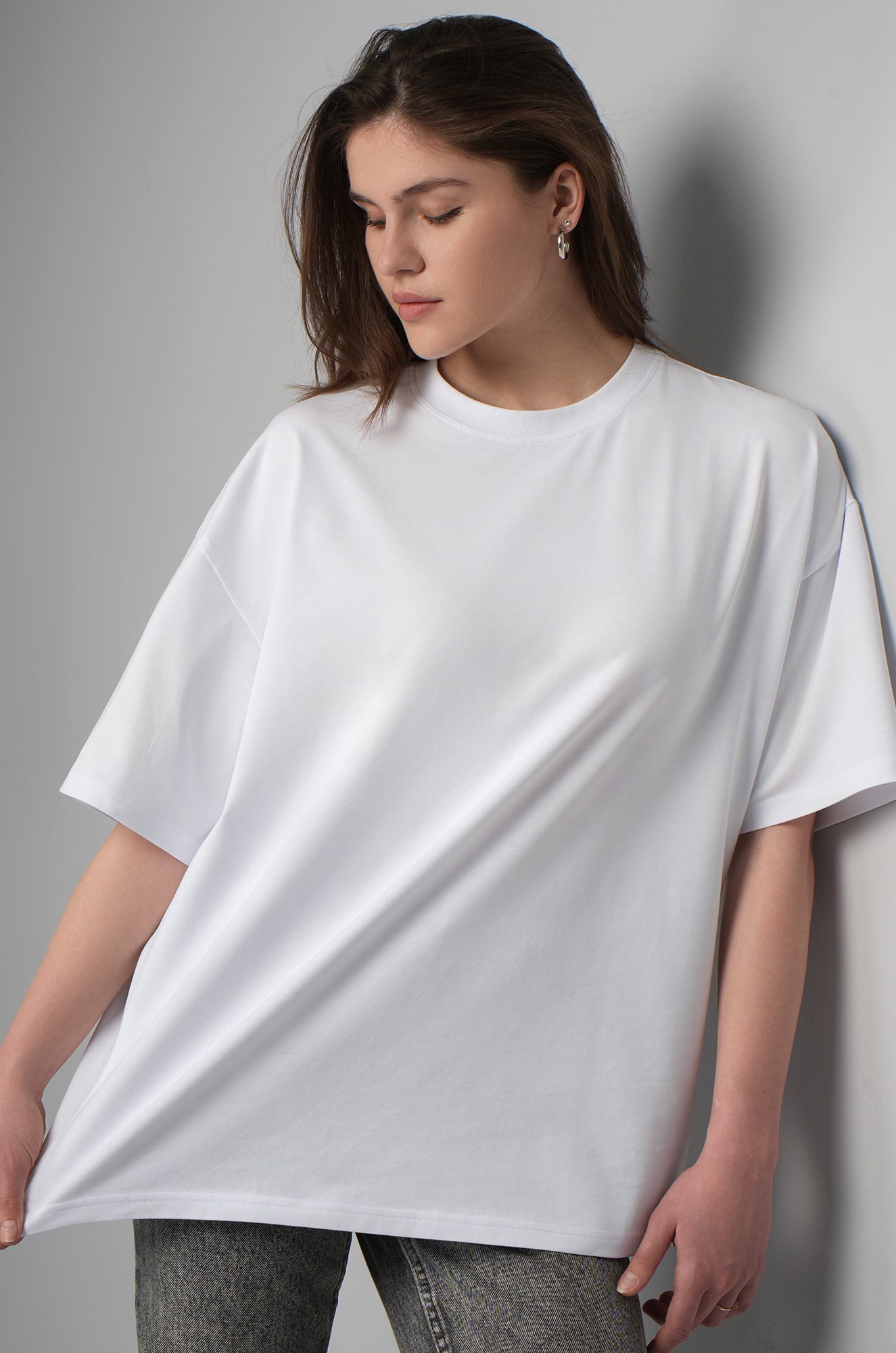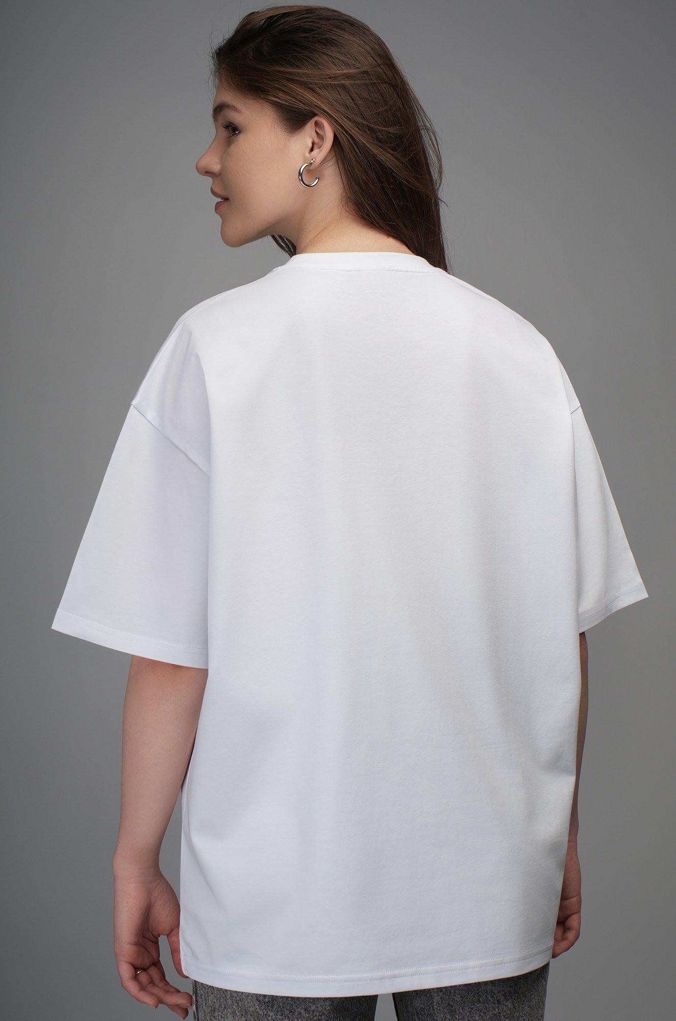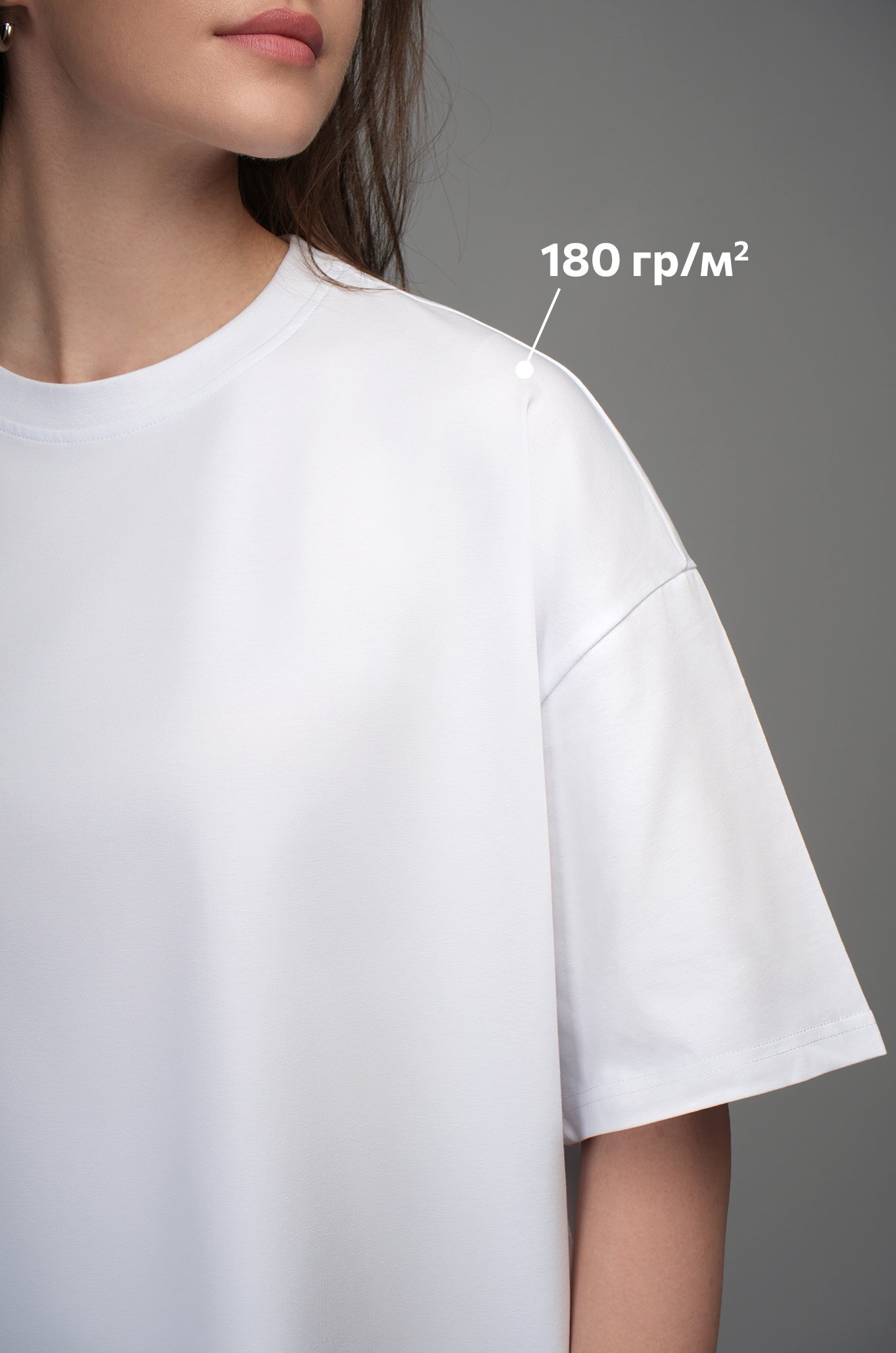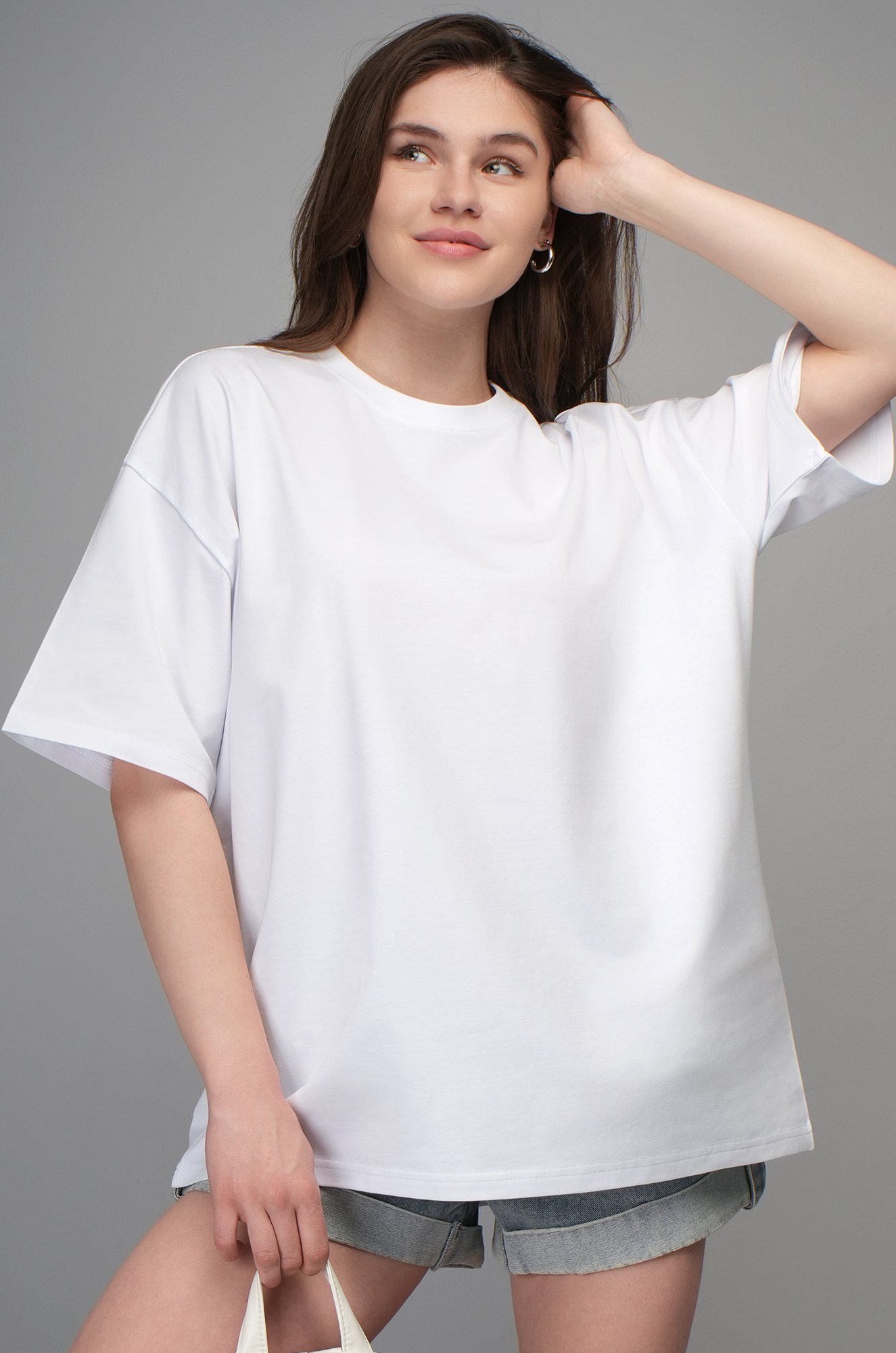 Крой oversize и спущенная линия плеча подарит комфортную посадку. Удобная круглая горловина мягко облегает шею, аккуратные плоские швы не ощущаются в течение дня. Светлая хлопковая футболка станет идеальной основой для повседневного образа в любом стиле: smart casual (смарт кэжуал), спортивном и уличном.