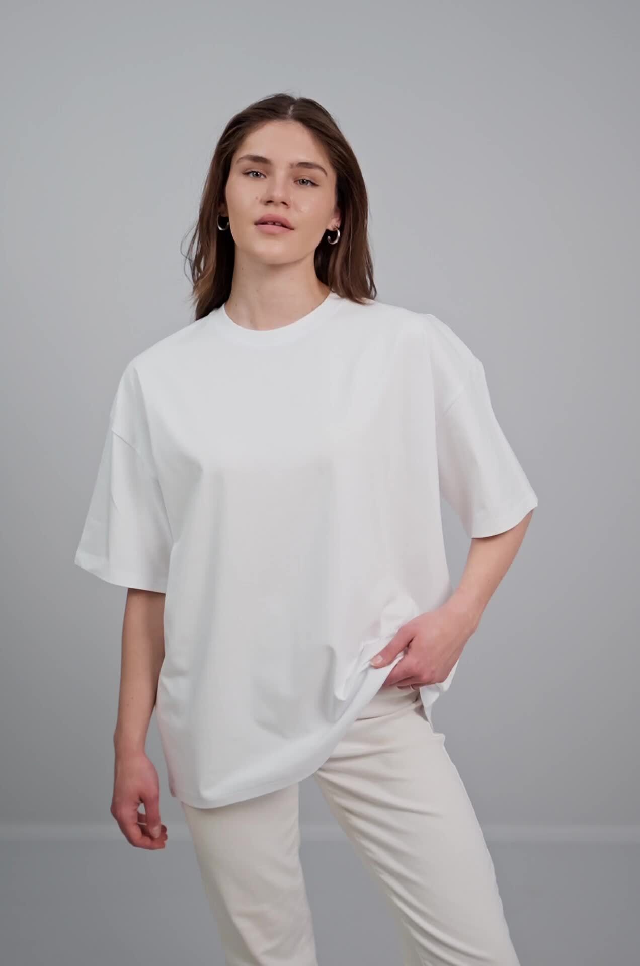 Однотонная женская футболка оверсайз с коротким рукавом выполнена из трикотажа с высоким содержанием хлопка. Стильная футболка белого цвета легко сочетается с любым низом. Трендовый крой оверсайз уже не один сезон находится на пике популярности, свободная футболка – это современная база.