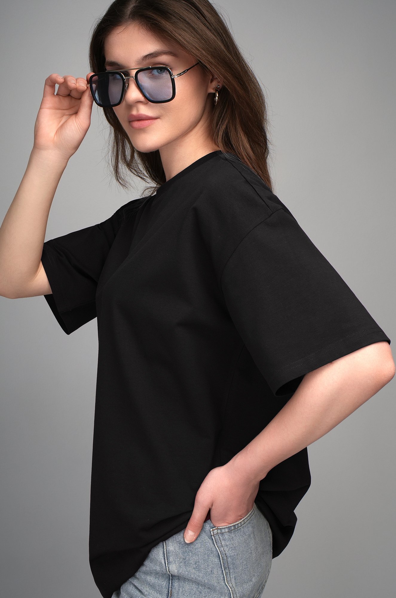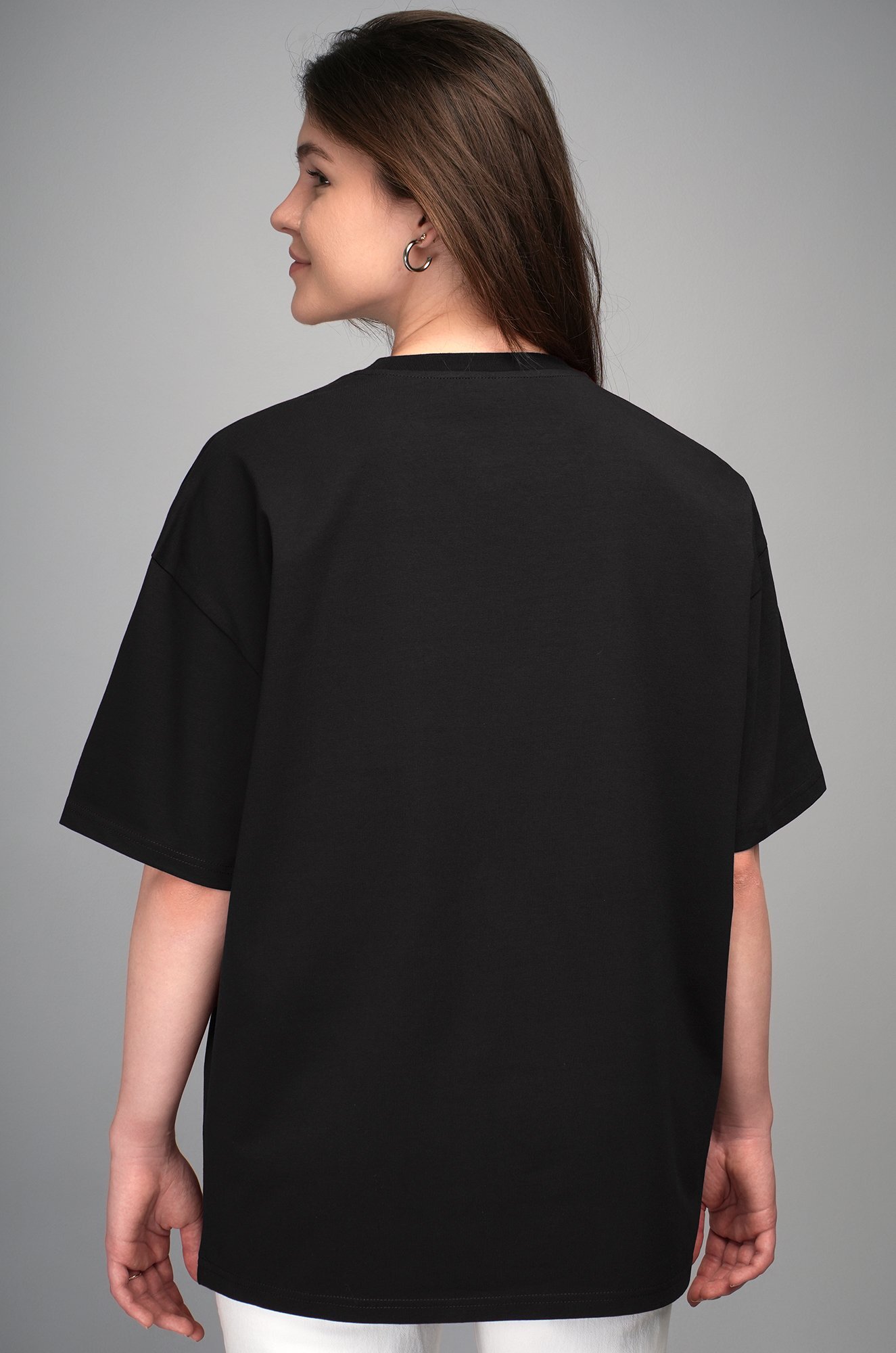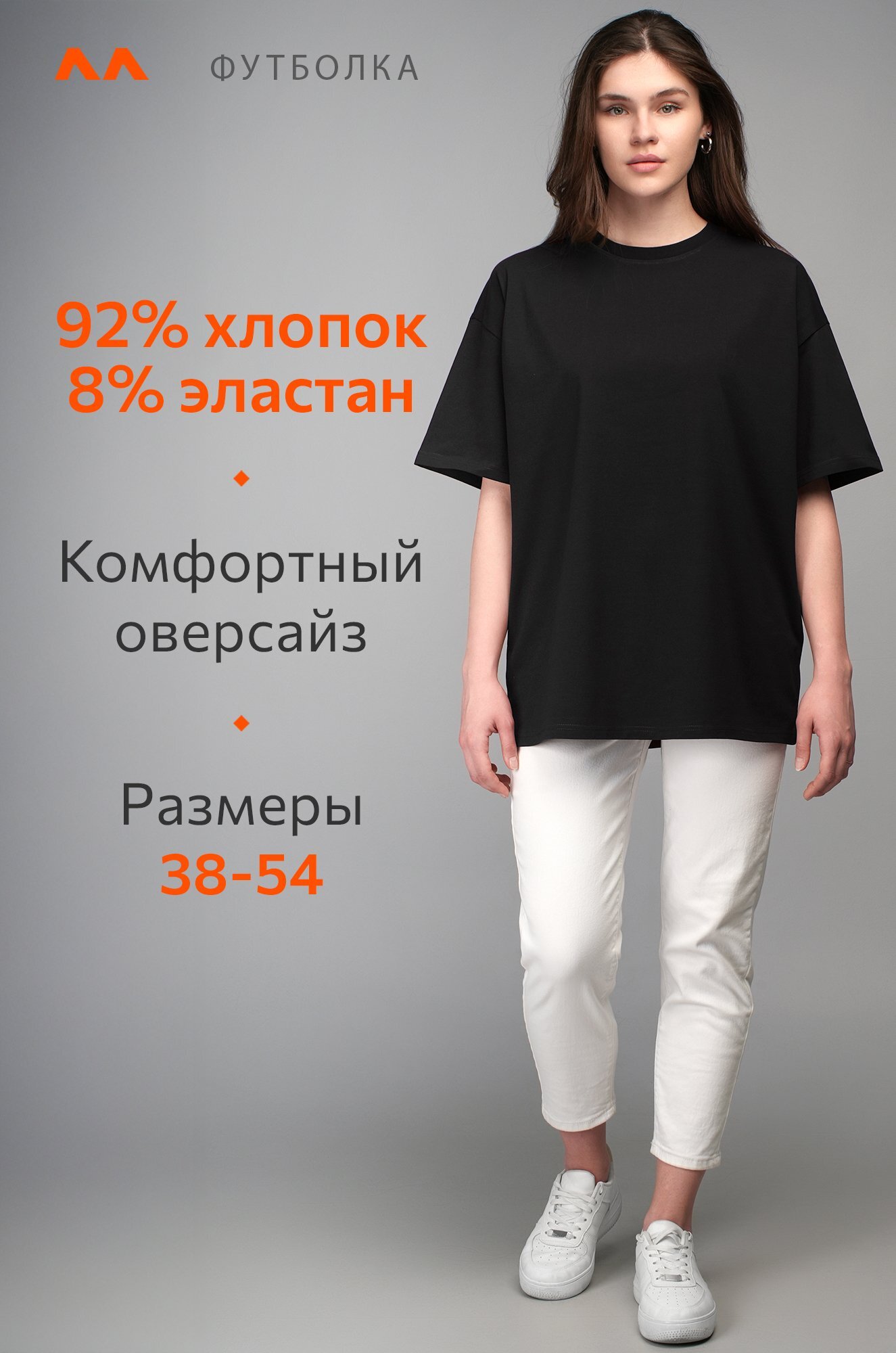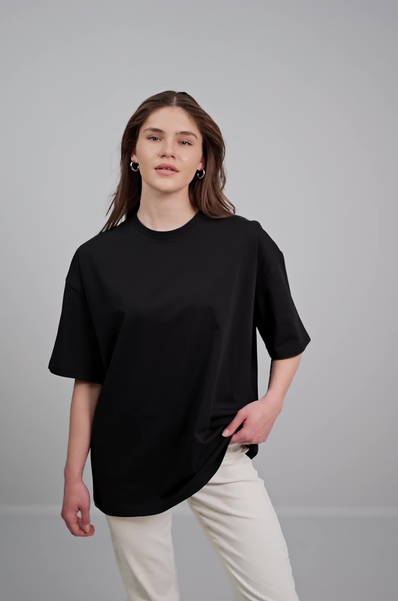 Женская футболка оверсайз выполнена из трикотажа с высоким содержанием хлопка. Черная футболка легко сочетается с любым низом. Трендовый крой оверсайз уже не один сезон находится на пике популярности, свободная футболка с коротким рукавом – это современная база.