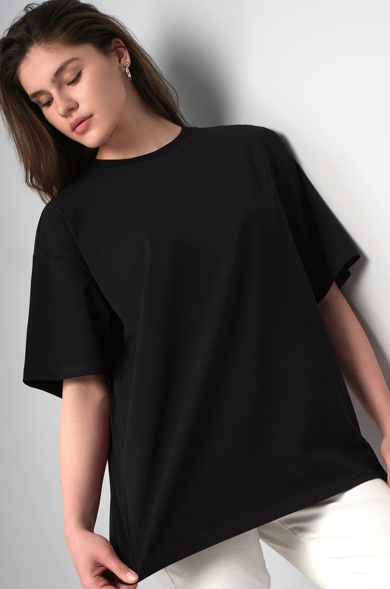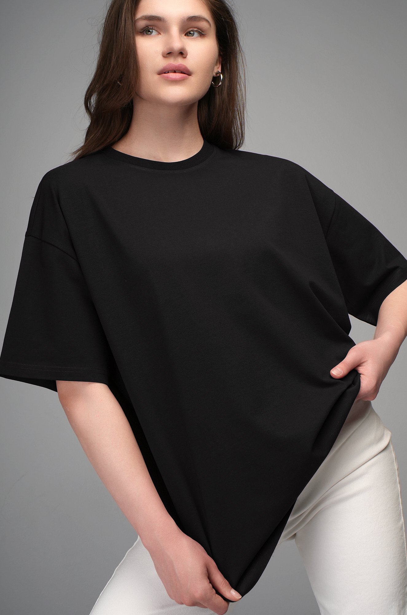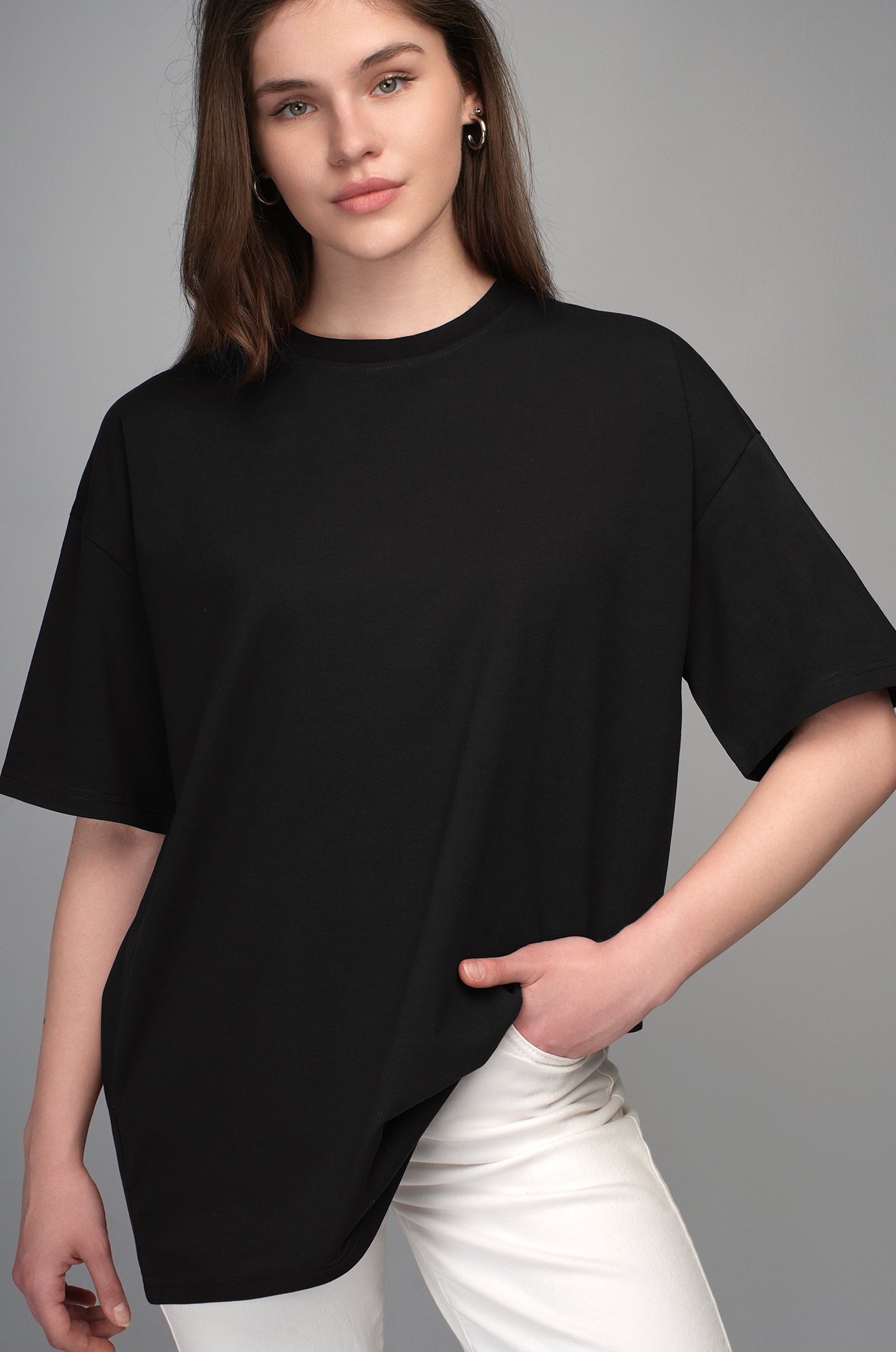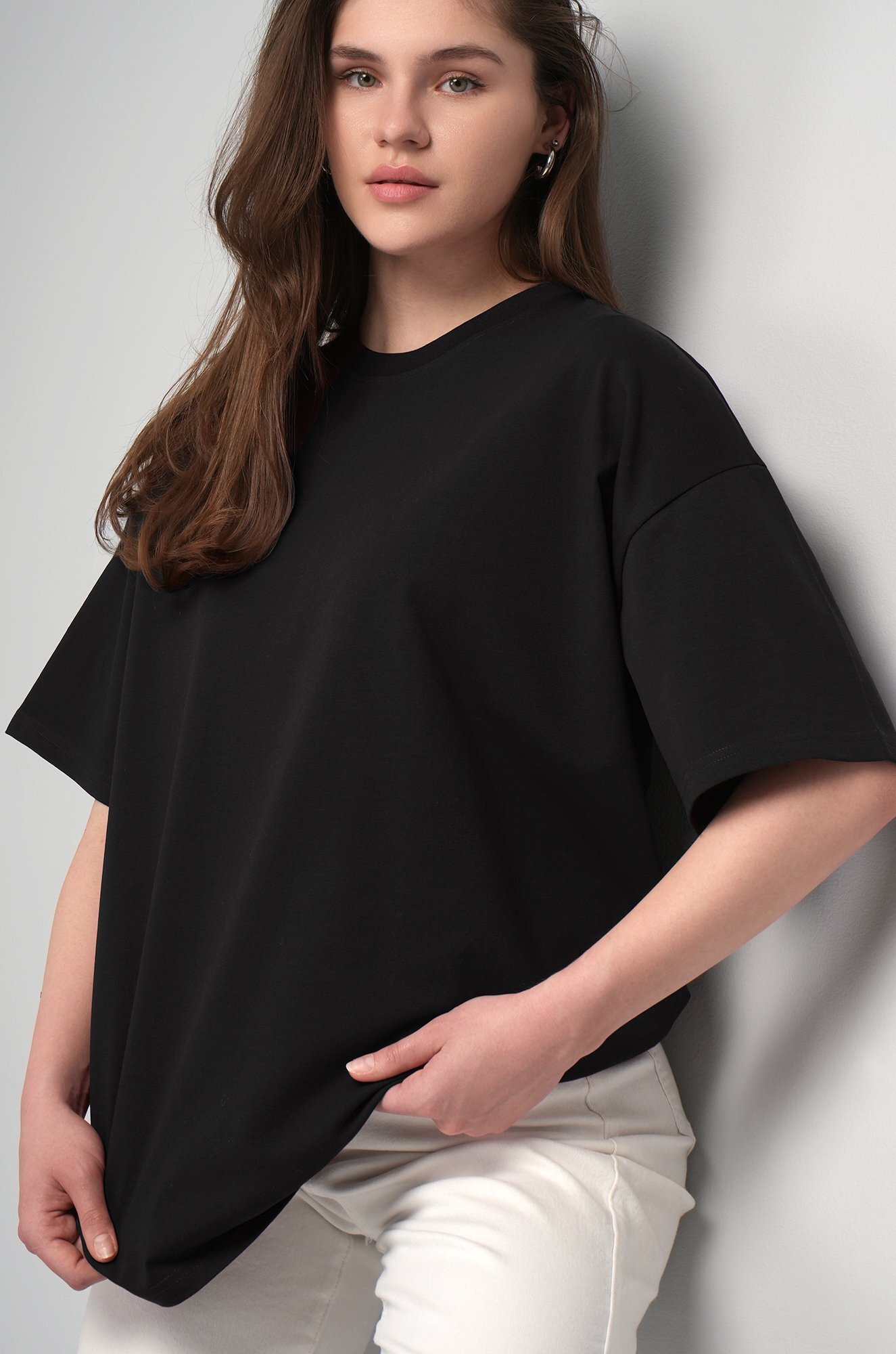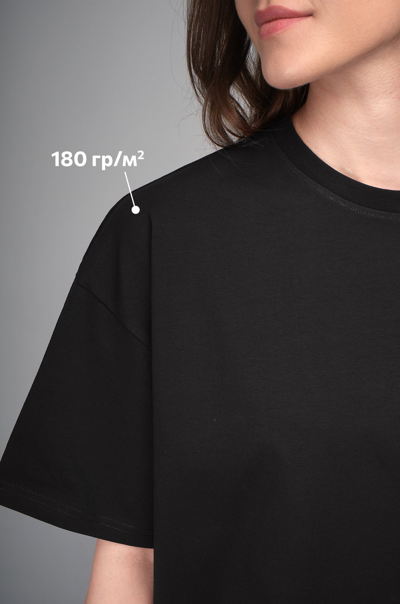 Женская футболка оверсайз выполнена из трикотажа с высоким содержанием хлопка. Черная футболка легко сочетается с любым низом. Трендовый крой оверсайз уже не один сезон находится на пике популярности, свободная футболка с коротким рукавом – это современная база.