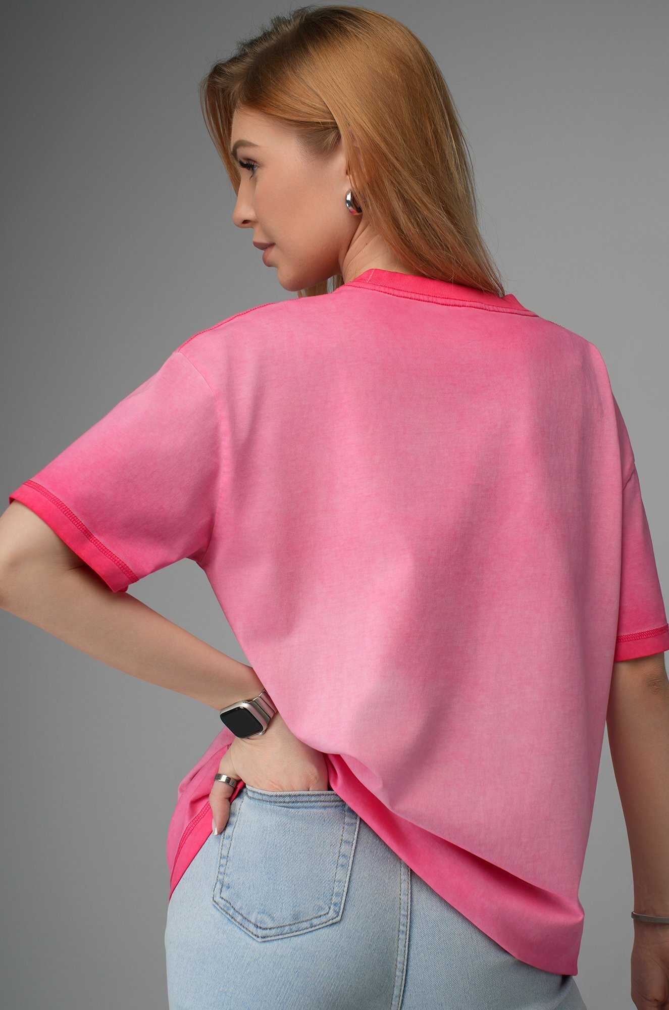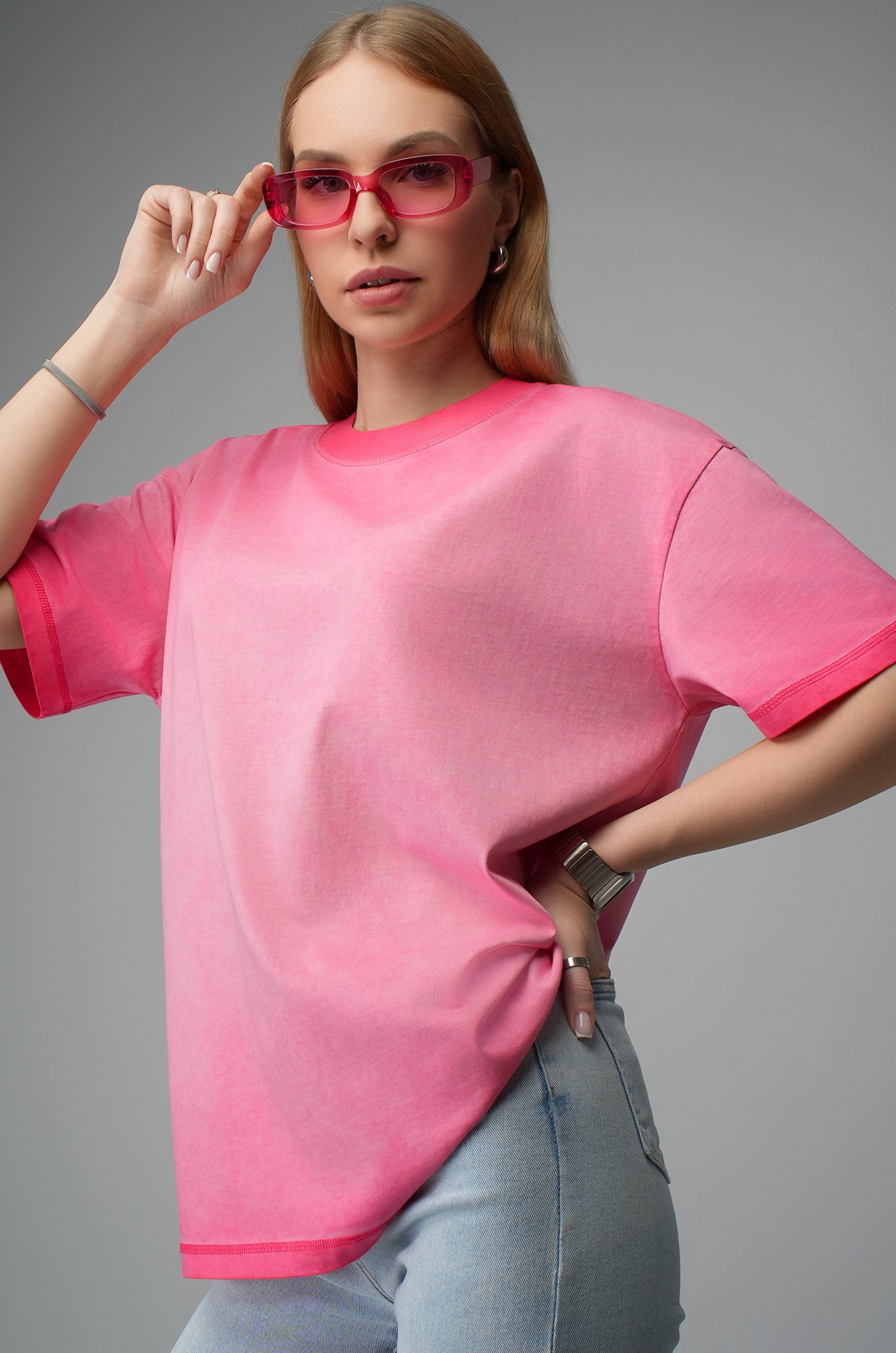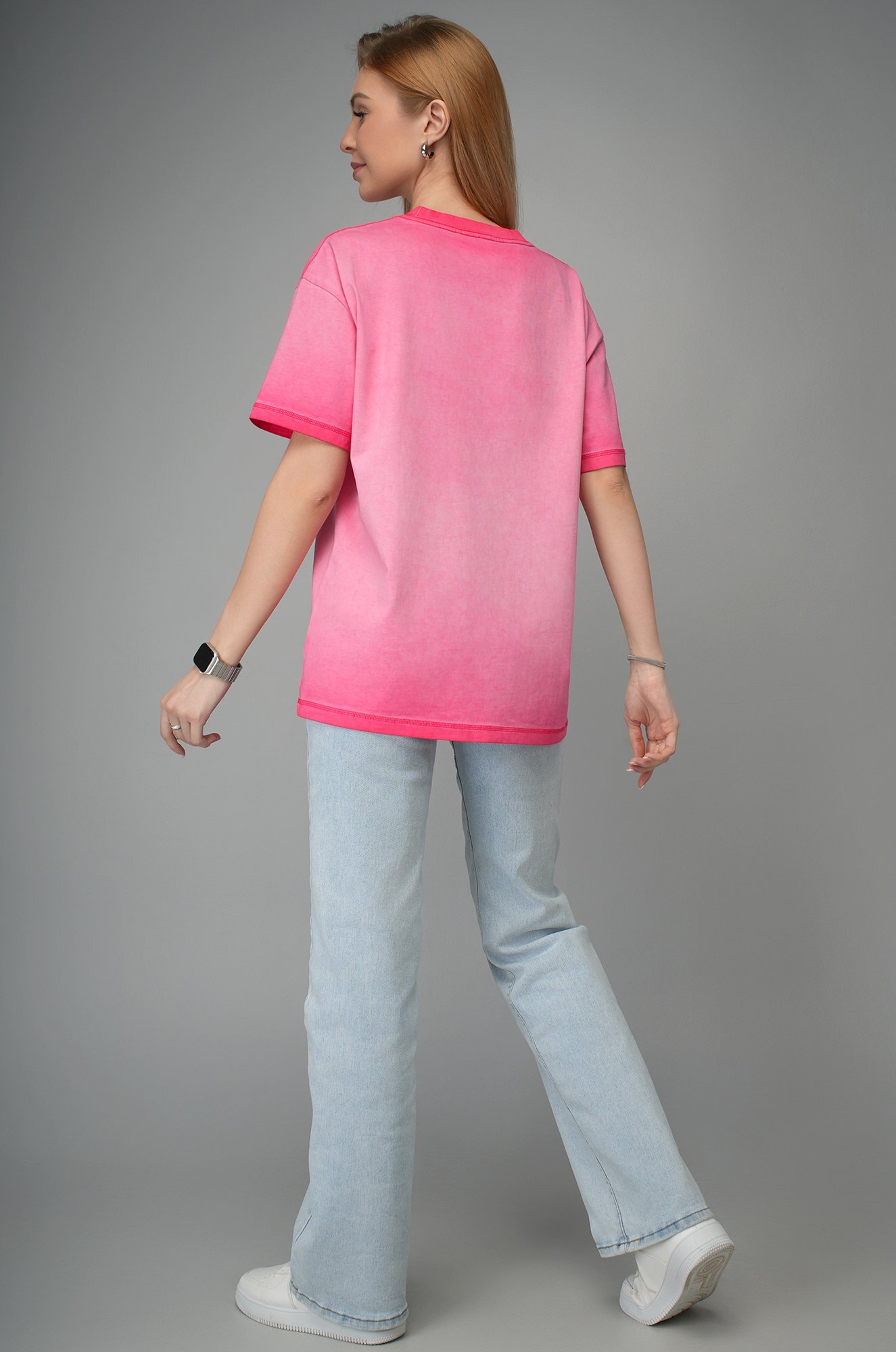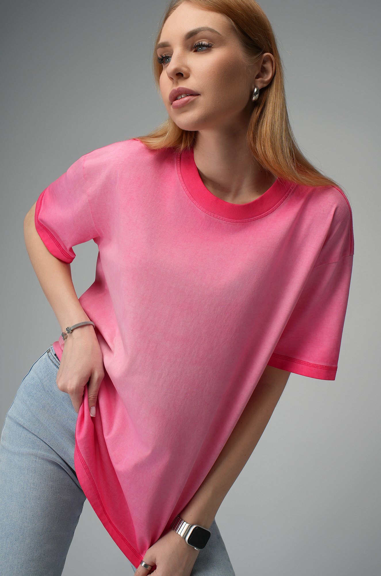 Розовая футболка с градиентом для женщин станет стильным акцентом на прогулке, встрече с друзьями или отдыхе.
