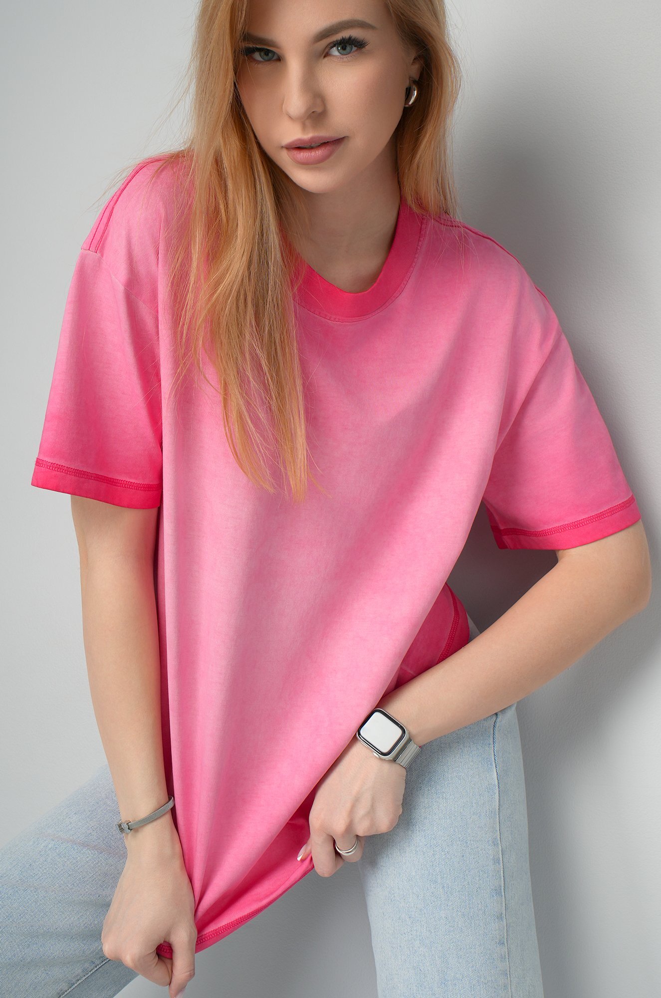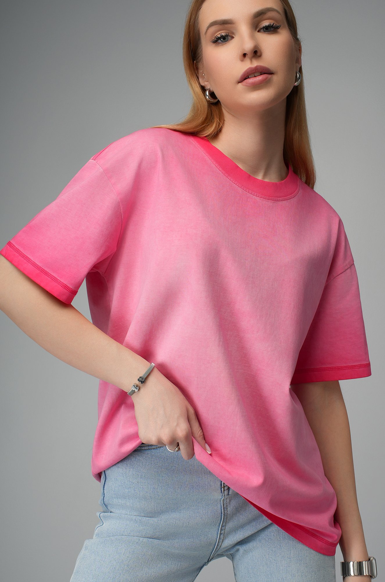 Женская футболка оверсайз с варёным эффектом омбре — яркое и удобное решение для повседневных образов с настроением свободы. Плотная футболка выполнена из 100% хлопка — мягкого, дышащего и приятного к телу трикотажа.