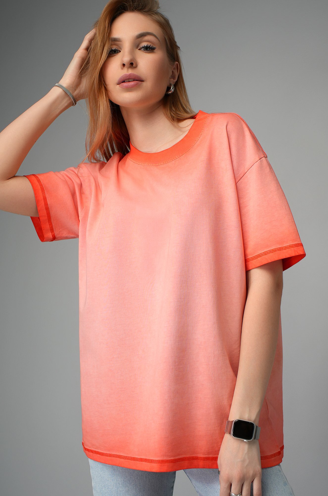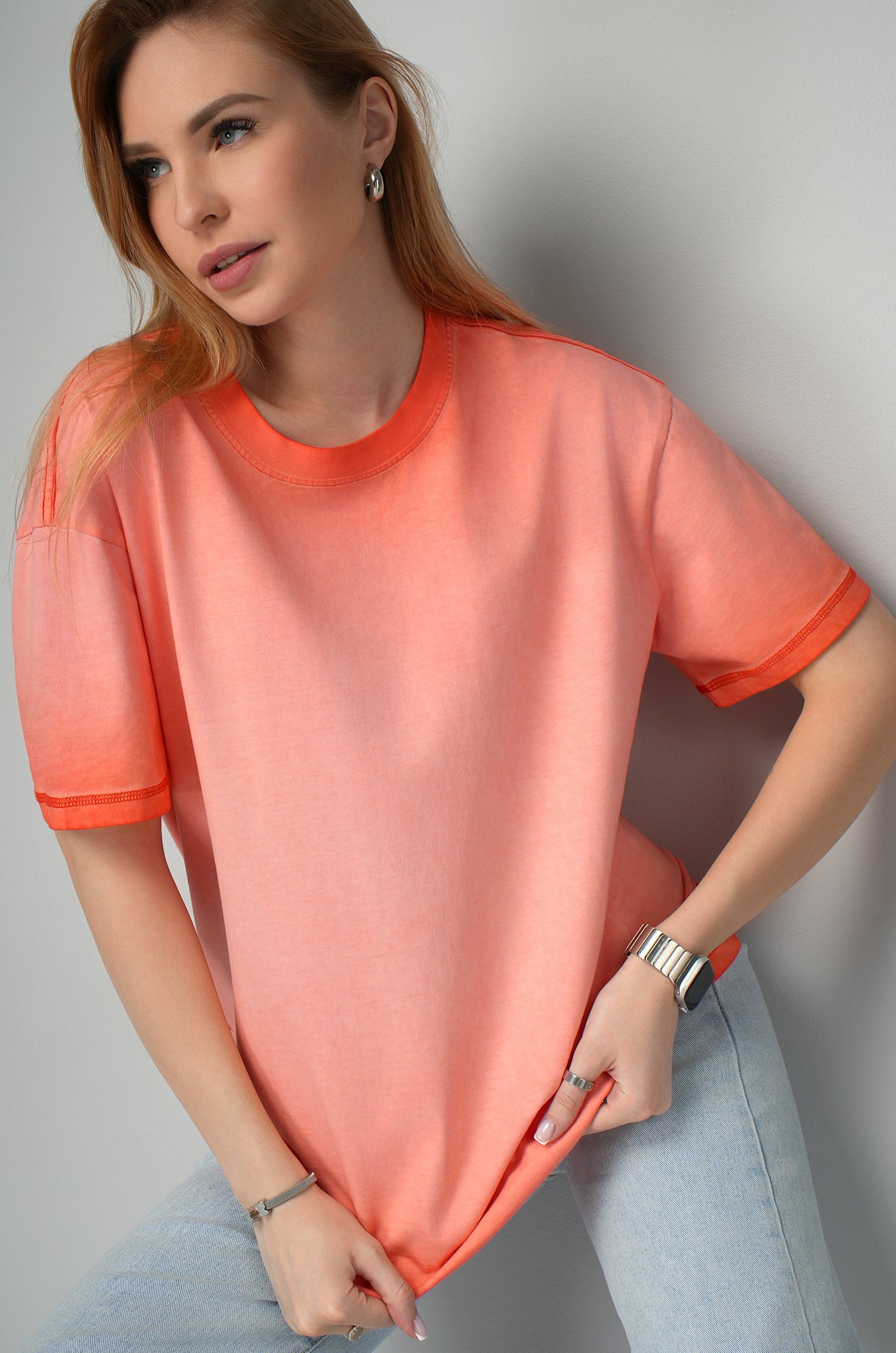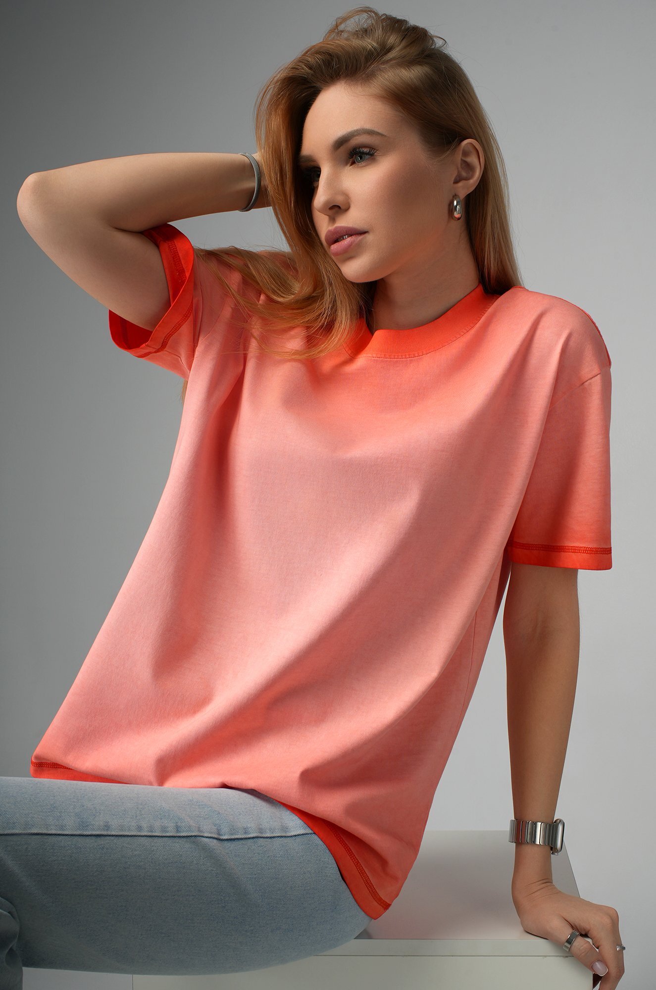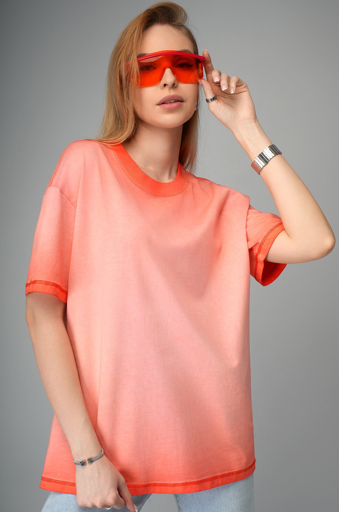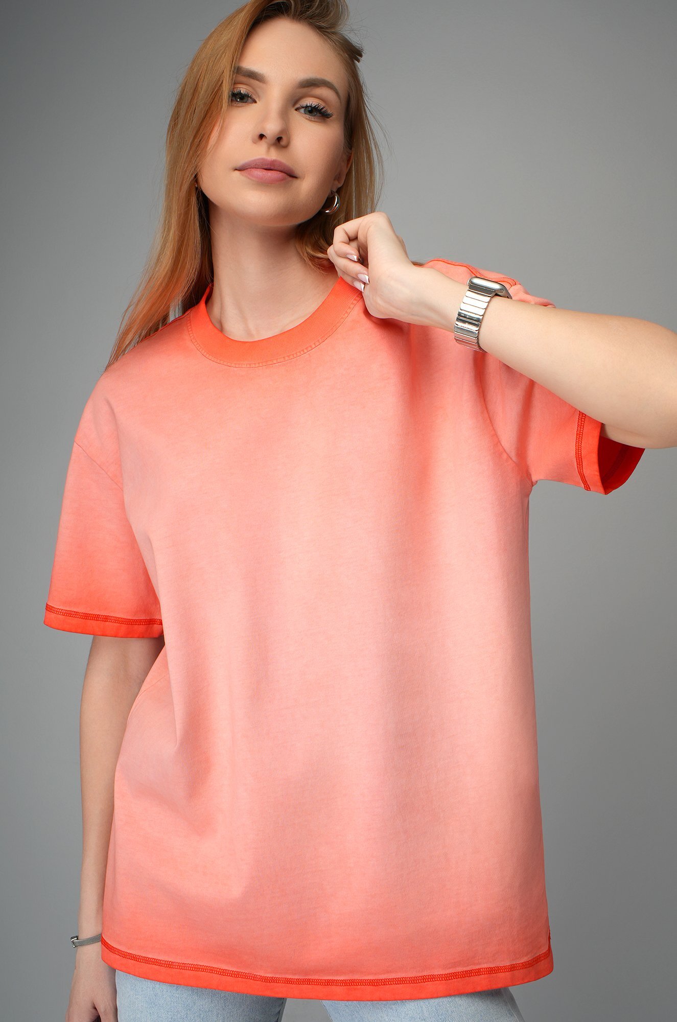 Женская футболка оверсайз с варёным эффектом омбре — яркое и удобное решение для повседневных образов с настроением свободы. Плотная футболка выполнена из 100% хлопка — мягкого, дышащего и приятного к телу трикотажа.