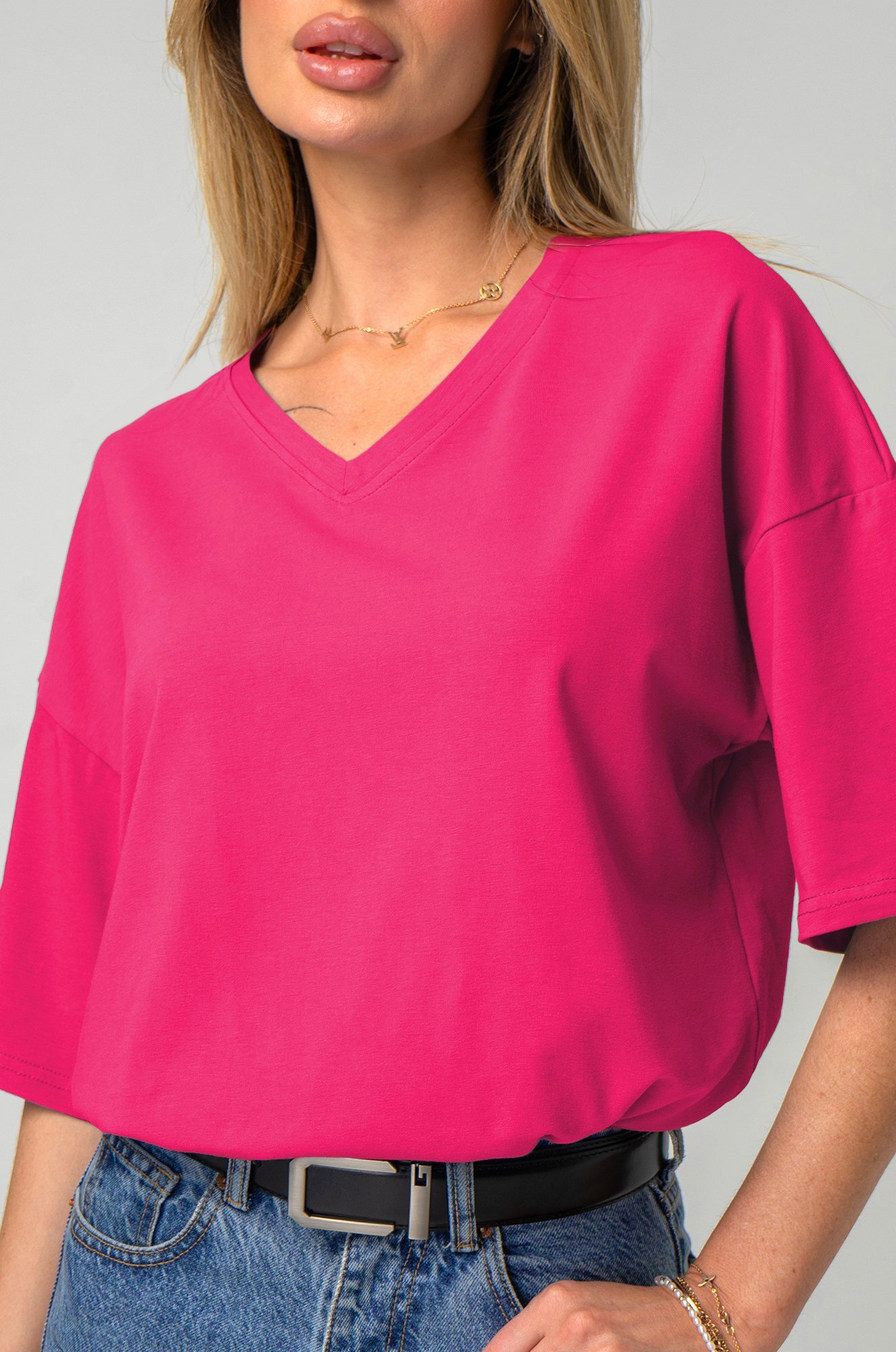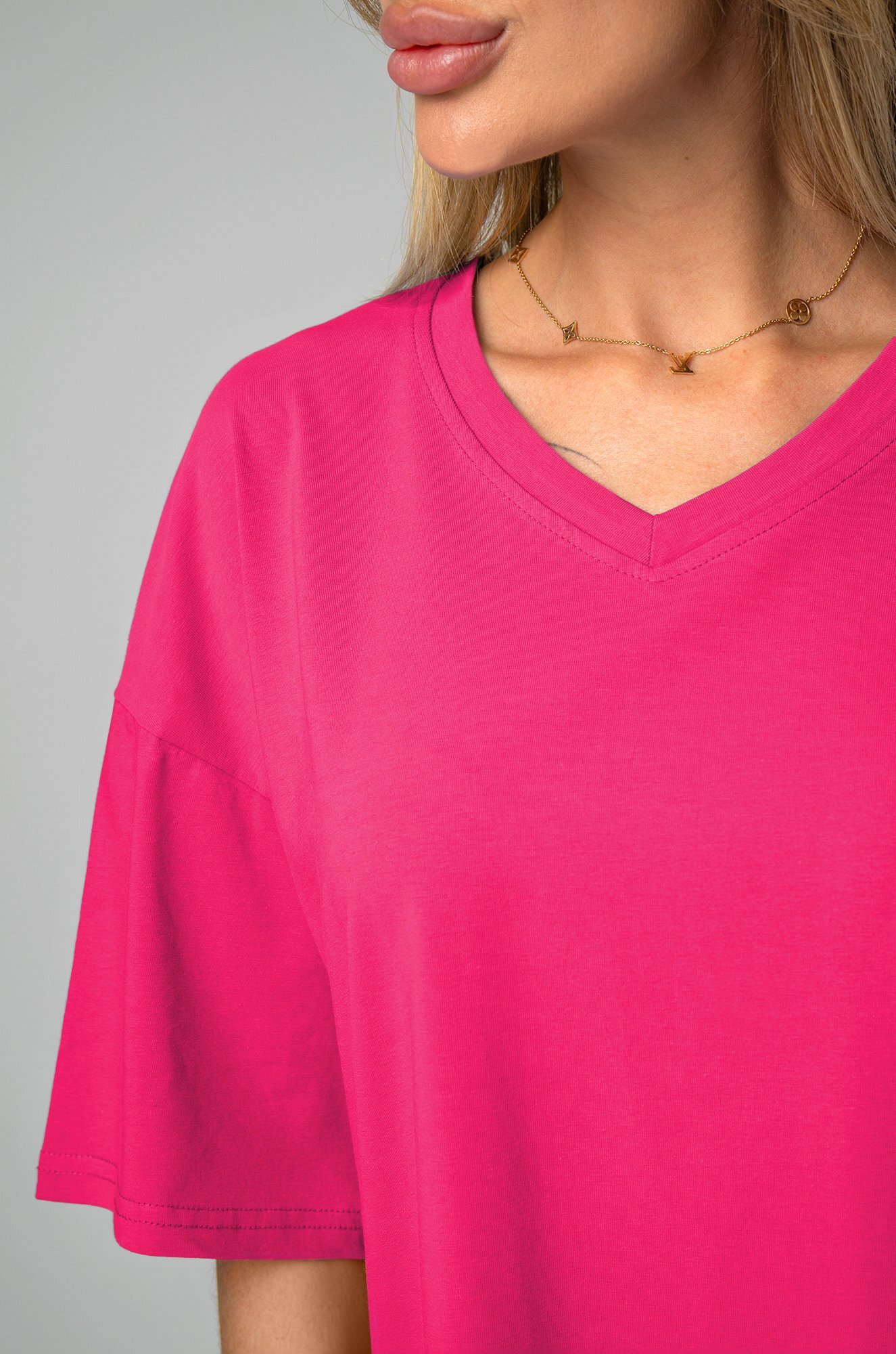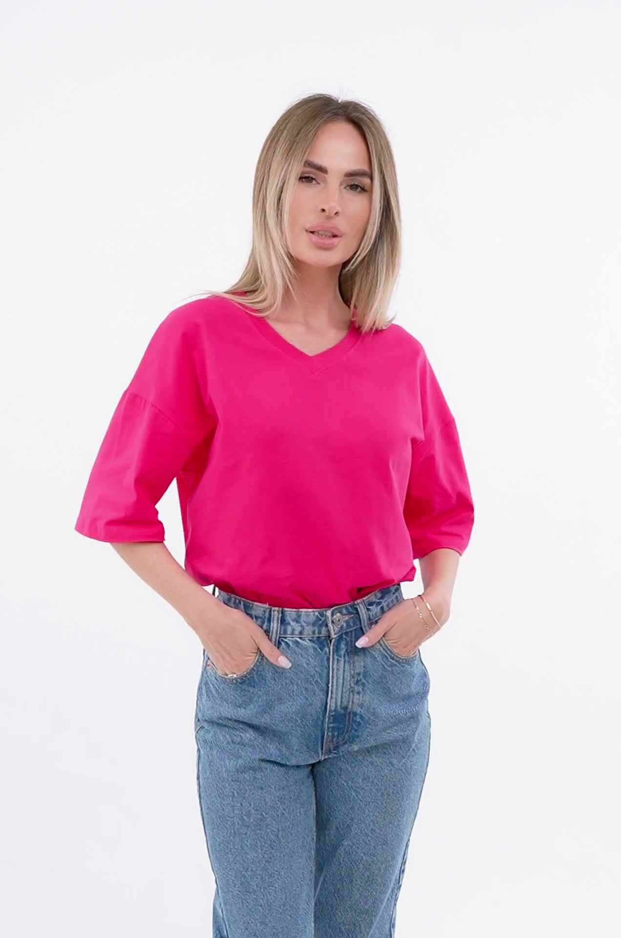 Женская футболка с v-вырезом добавит комфорта в любой день. Однотонная футболка оверсайз малинового цвета выполнена из хлопка с эластаном. Oversize-крой дарит свободу и расслабленный силуэт. Спущенная линия плеча не стесняет движений и создаёт чувство лёгкости.