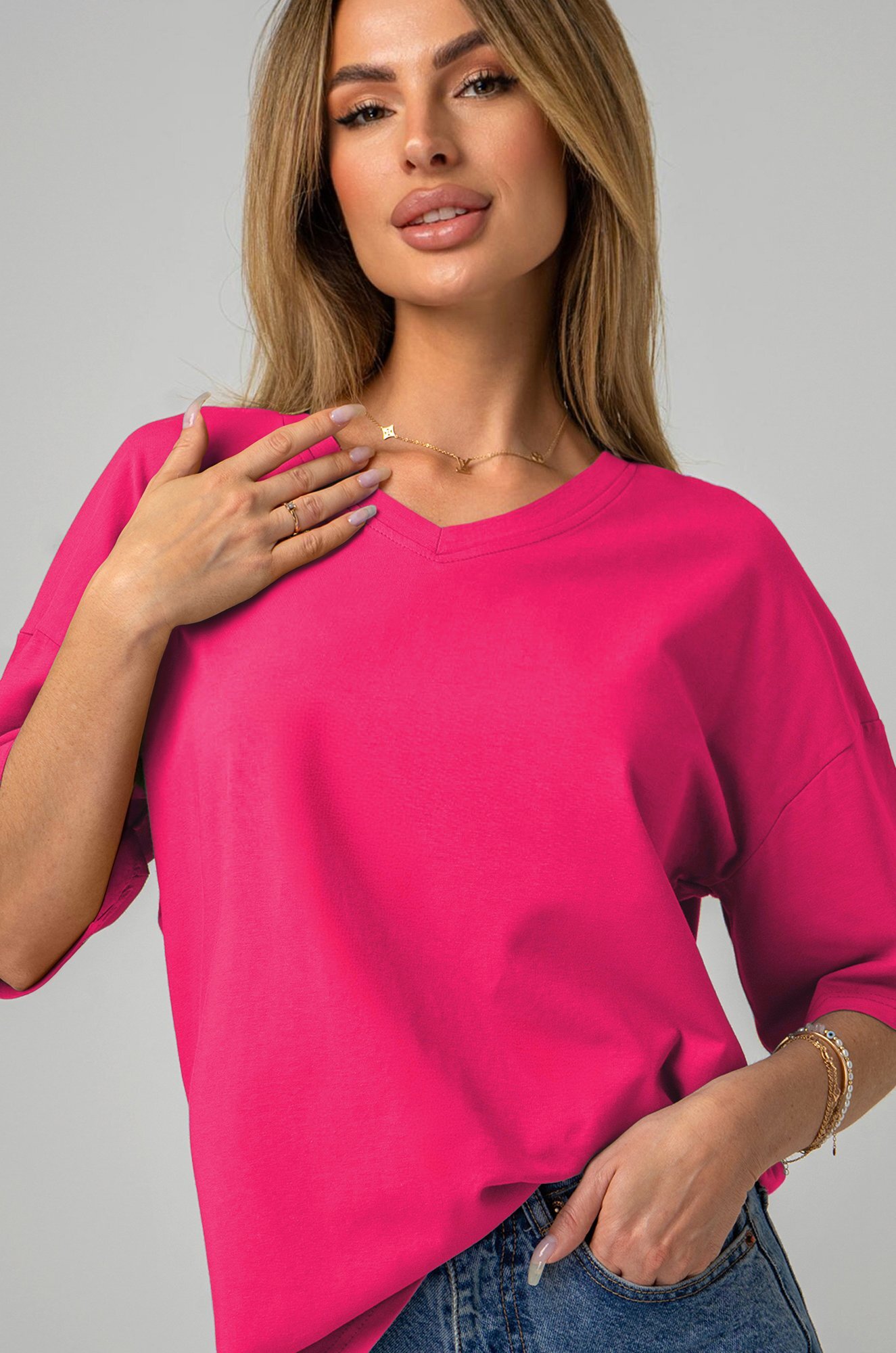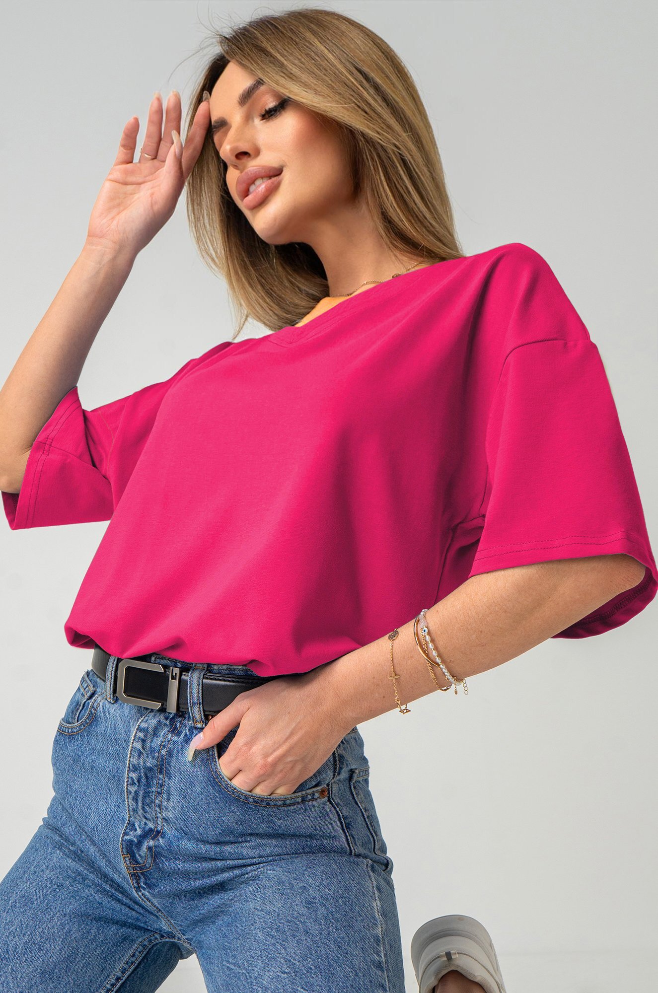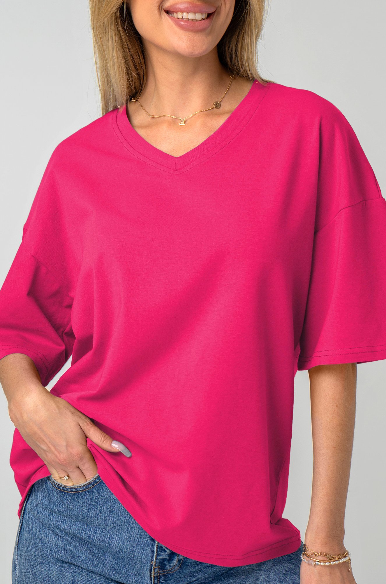 Женская футболка с v-вырезом добавит комфорта в любой день. Однотонная футболка оверсайз малинового цвета выполнена из хлопка с эластаном. Oversize-крой дарит свободу и расслабленный силуэт. Спущенная линия плеча не стесняет движений и создаёт чувство лёгкости.