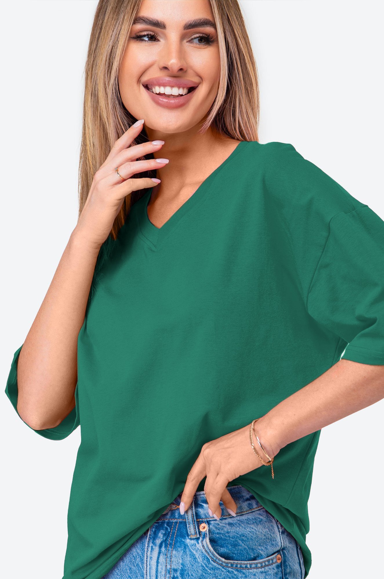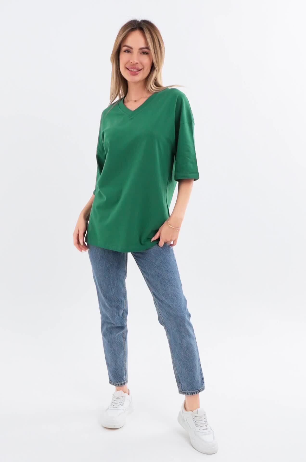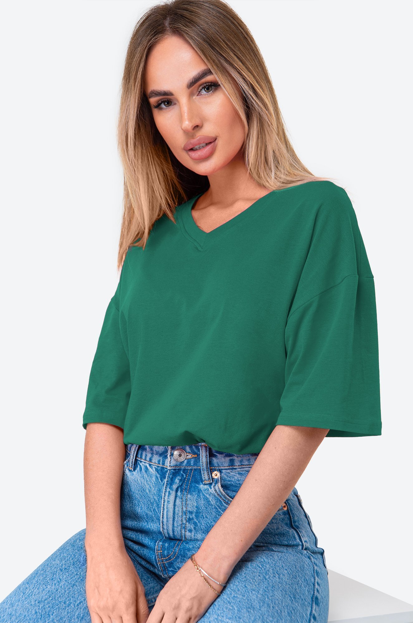 Женская футболка с v-вырезом добавит комфорта в любой день. Однотонная футболка оверсайз изумрудного цвета выполнена из хлопка с эластаном. Oversize-крой дарит свободу и расслабленный силуэт. Спущенная линия плеча не стесняет движений и создаёт чувство лёгкости.