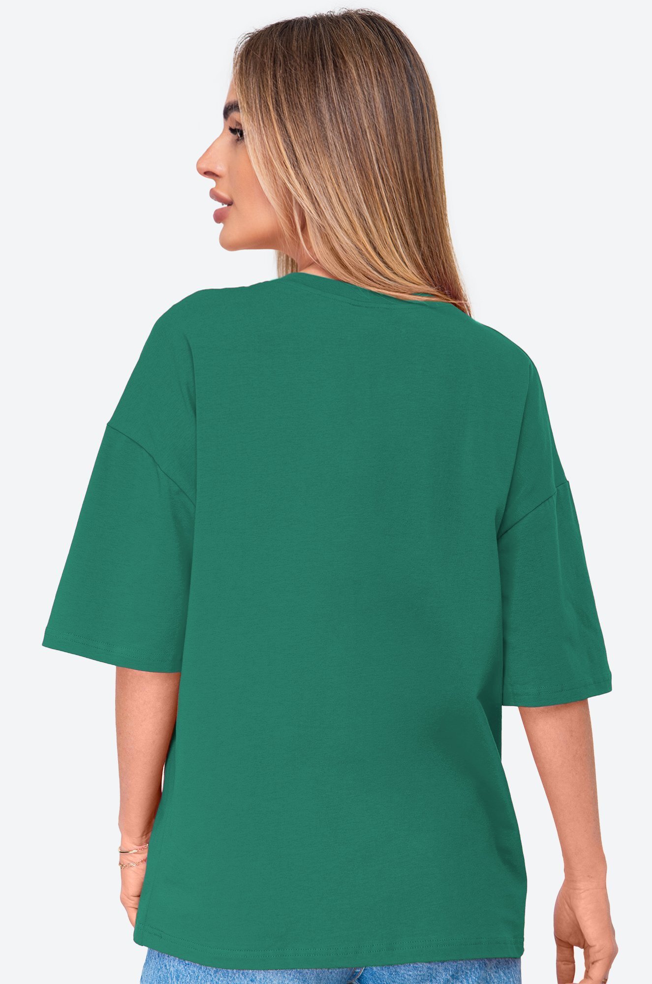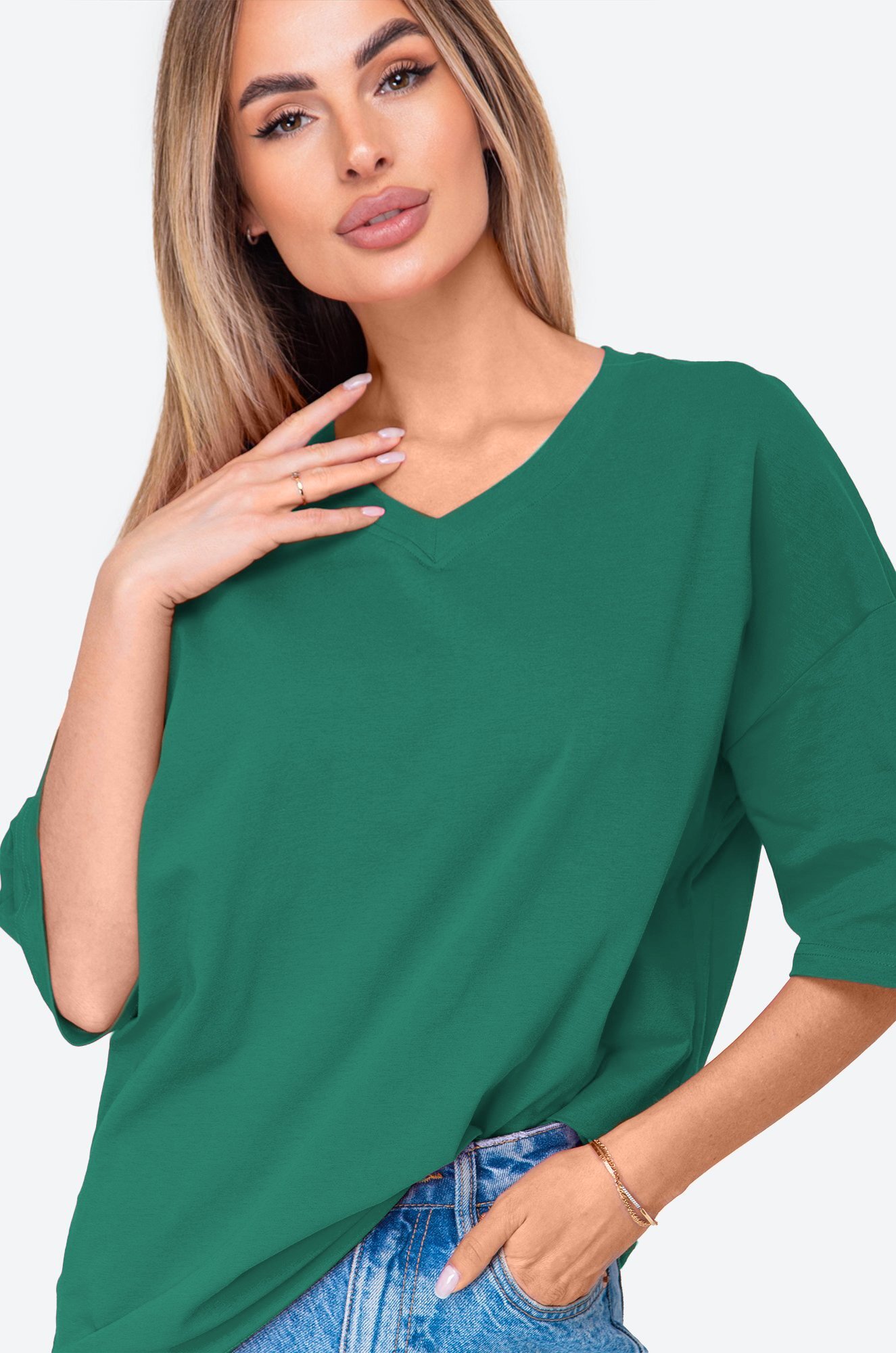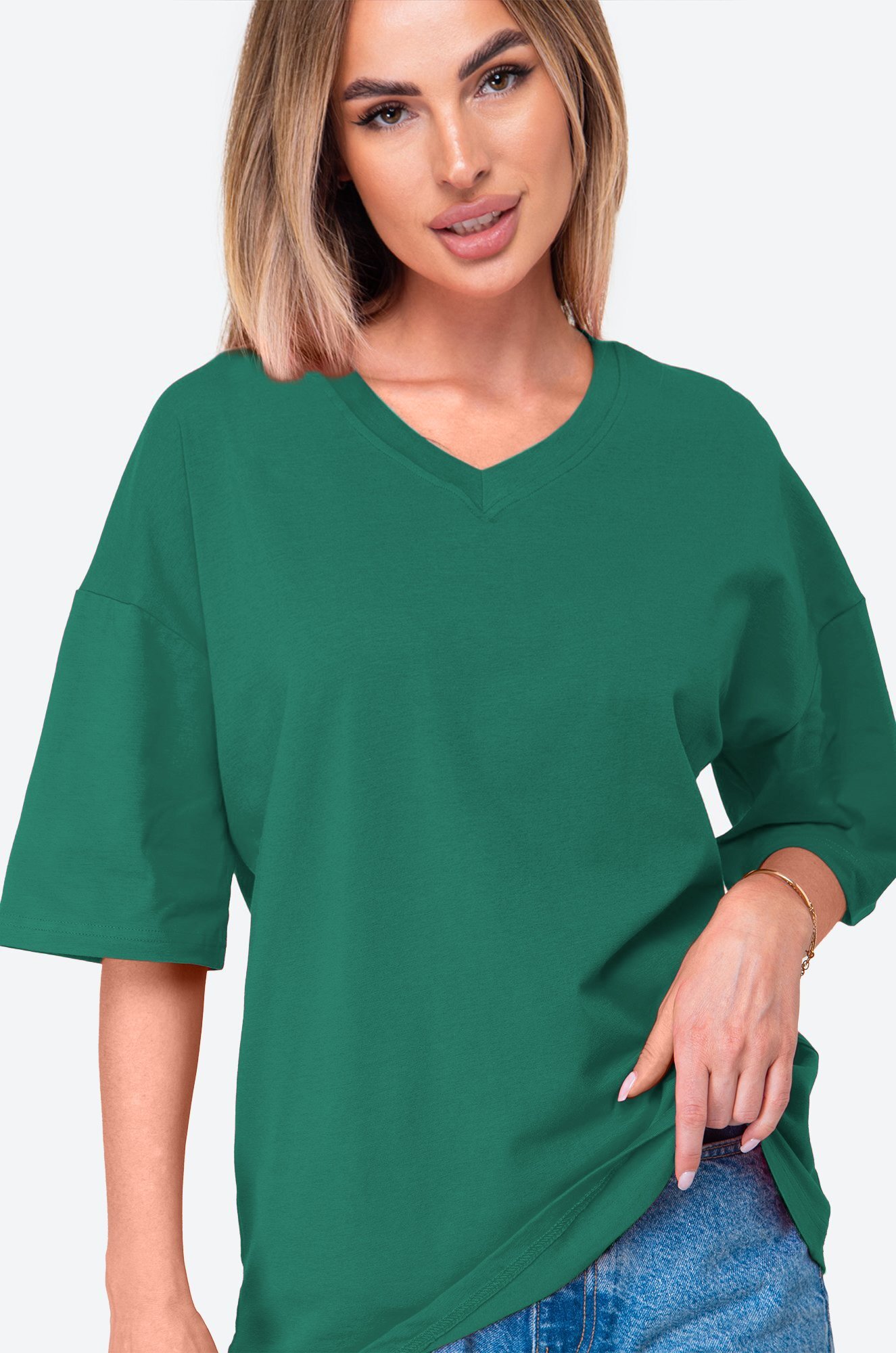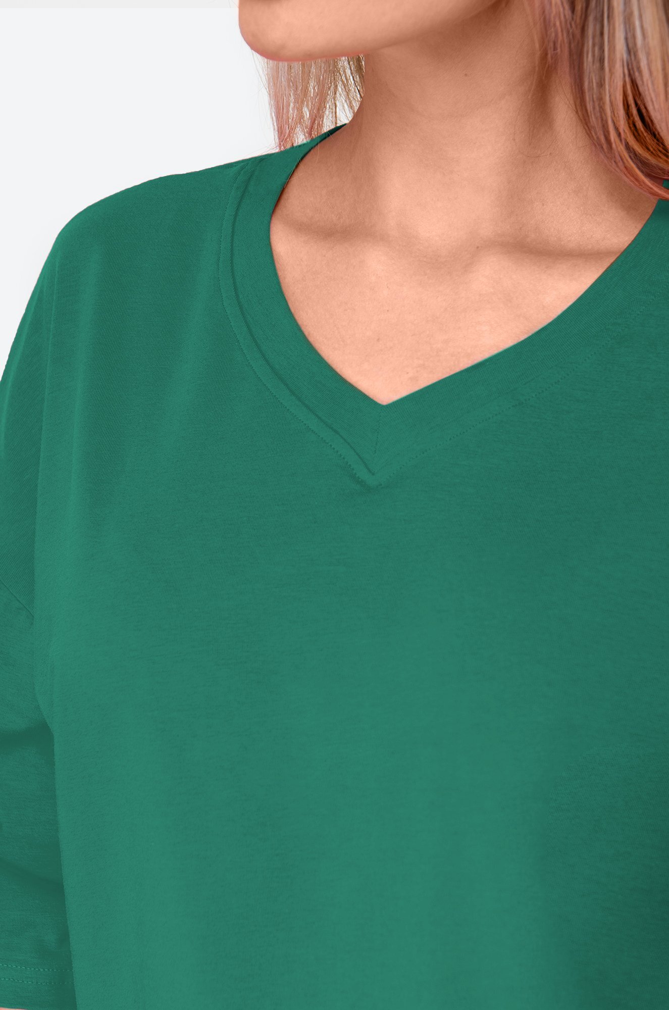 Женская футболка с v-вырезом добавит комфорта в любой день. Однотонная футболка оверсайз изумрудного цвета выполнена из хлопка с эластаном. Oversize-крой дарит свободу и расслабленный силуэт. Спущенная линия плеча не стесняет движений и создаёт чувство лёгкости.