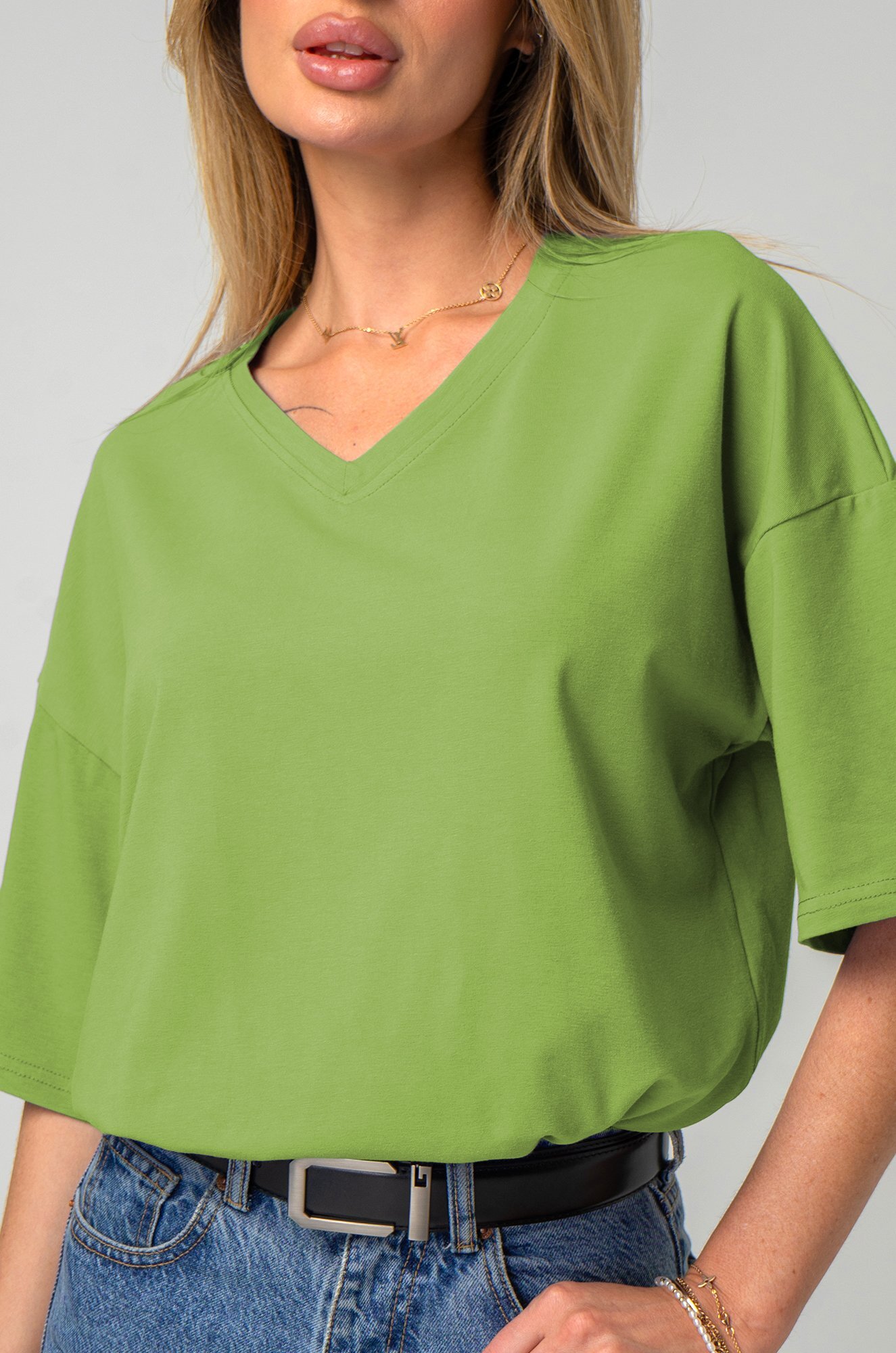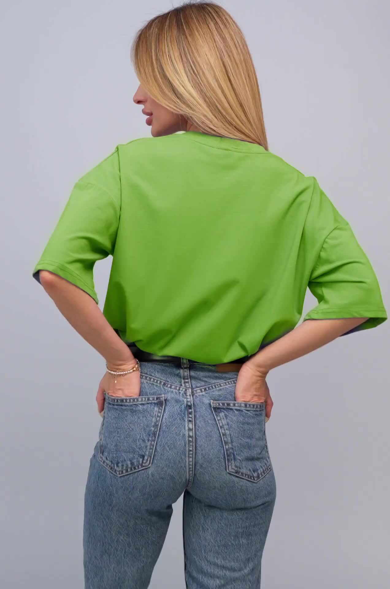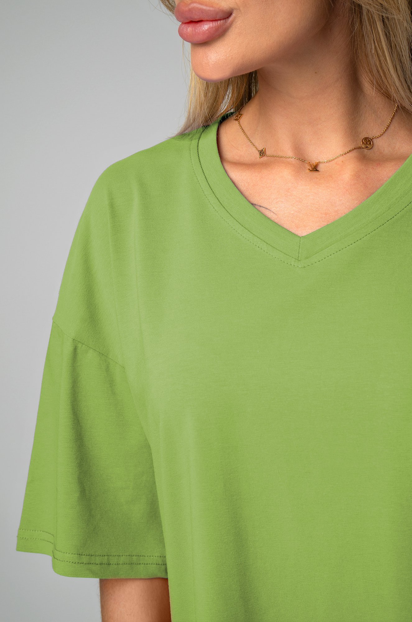 Женская футболка с v-вырезом добавит комфорта в любой день. Однотонная футболка оверсайз ярко-зеленого цвета выполнена из хлопка с эластаном. Oversize-крой дарит свободу и расслабленный силуэт. Спущенная линия плеча не стесняет движений и создаёт чувство лёгкости.