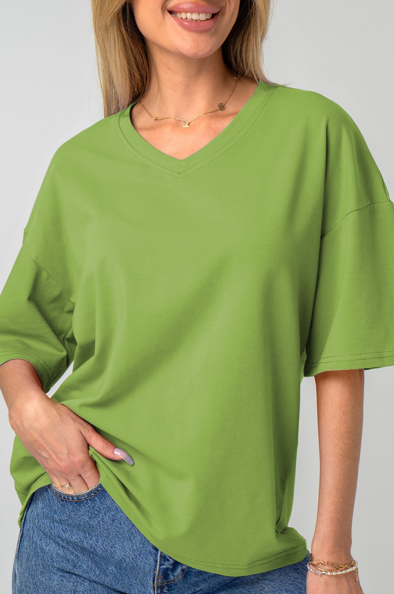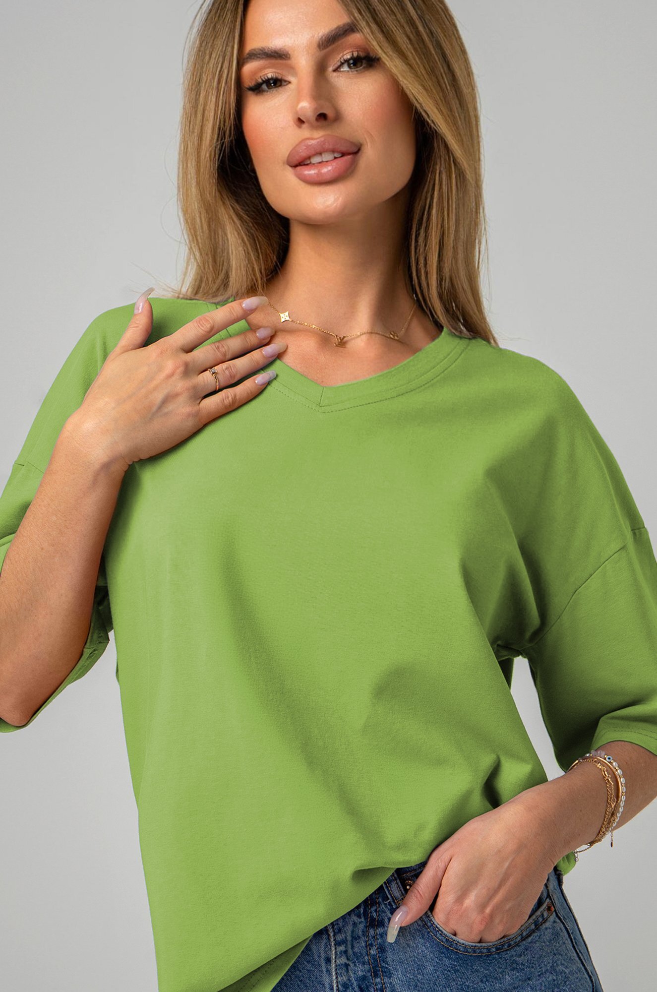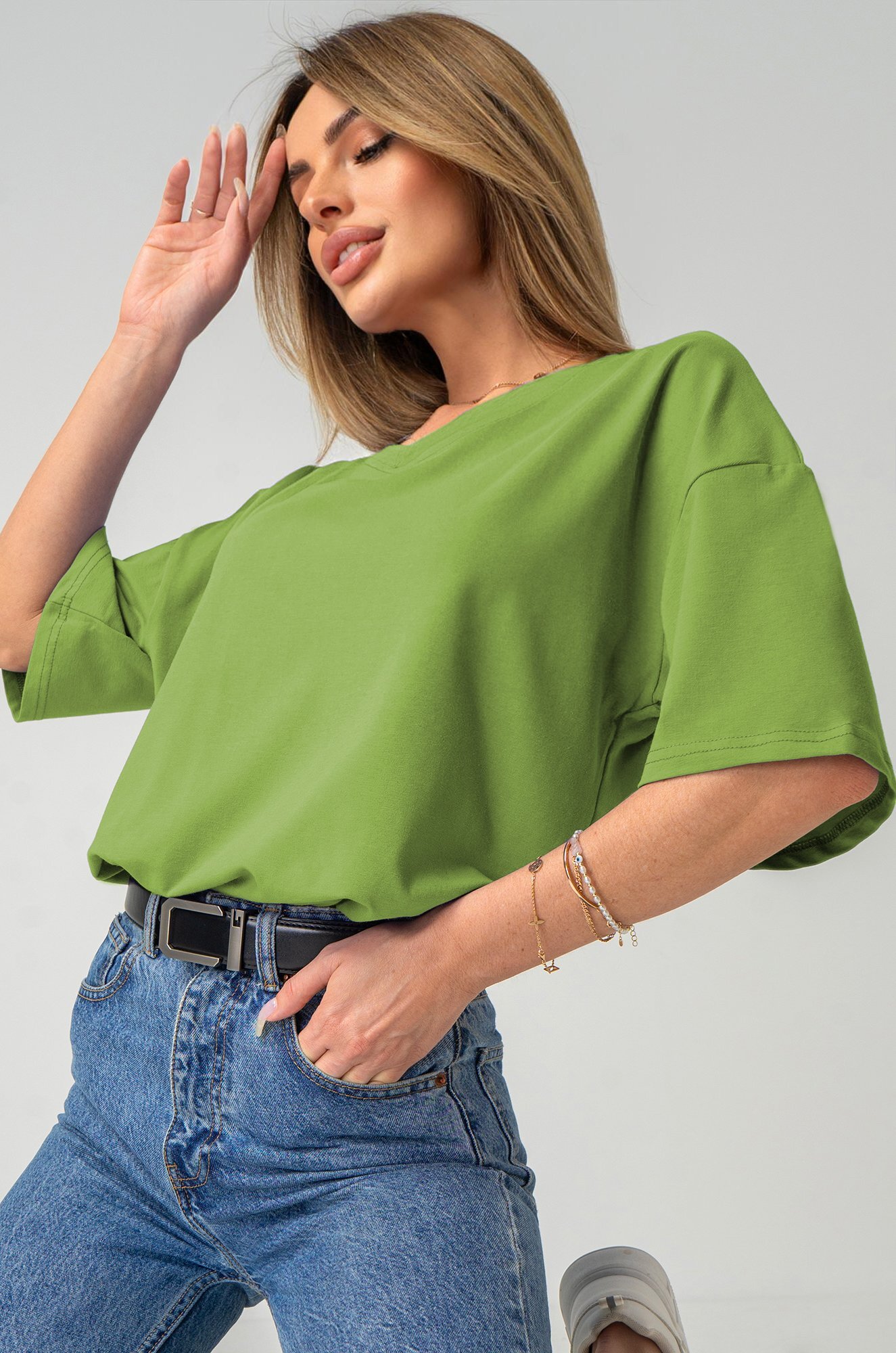 Женская футболка с v-вырезом добавит комфорта в любой день. Однотонная футболка оверсайз ярко-зеленого цвета выполнена из хлопка с эластаном. Oversize-крой дарит свободу и расслабленный силуэт. Спущенная линия плеча не стесняет движений и создаёт чувство лёгкости.