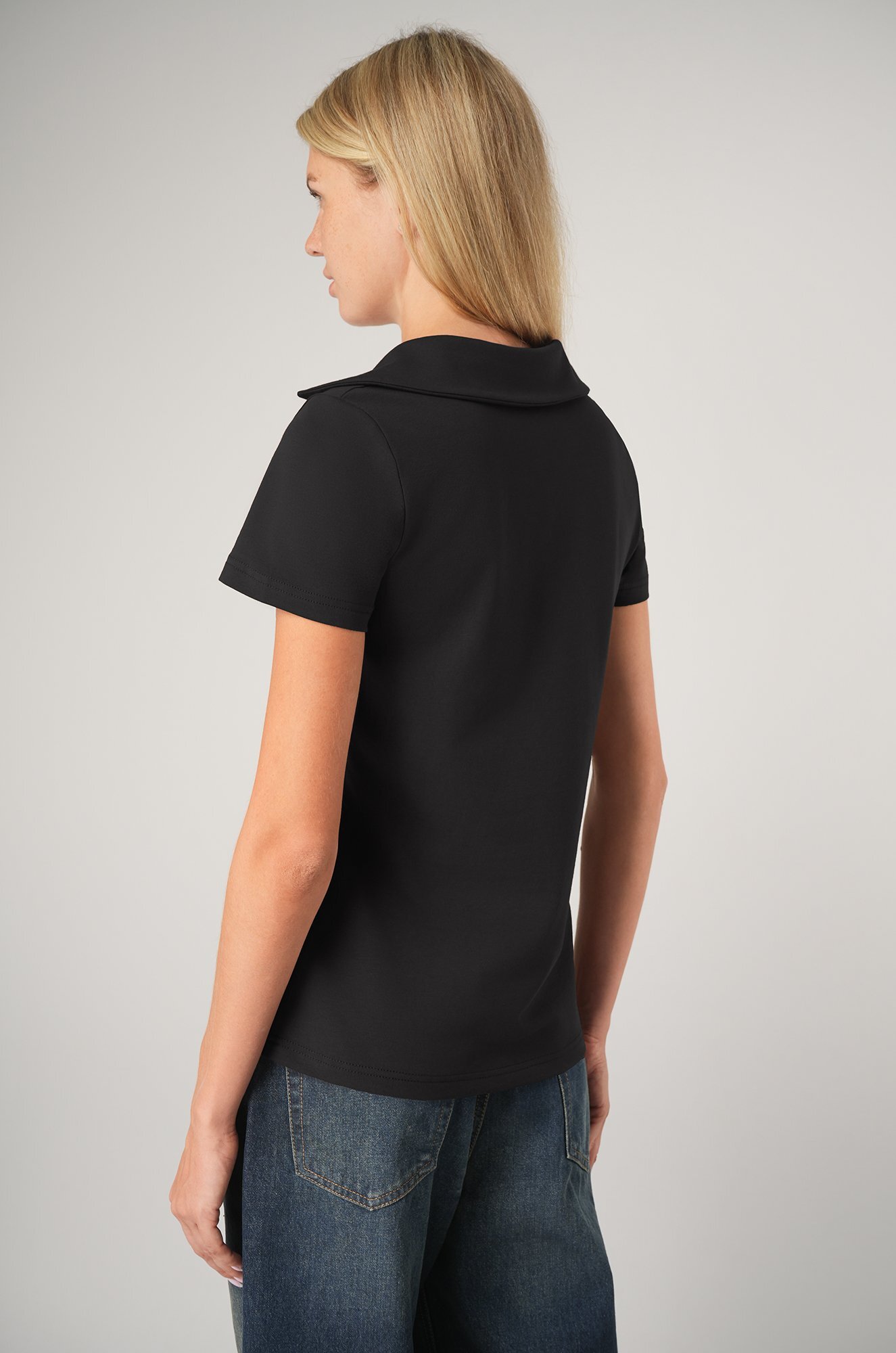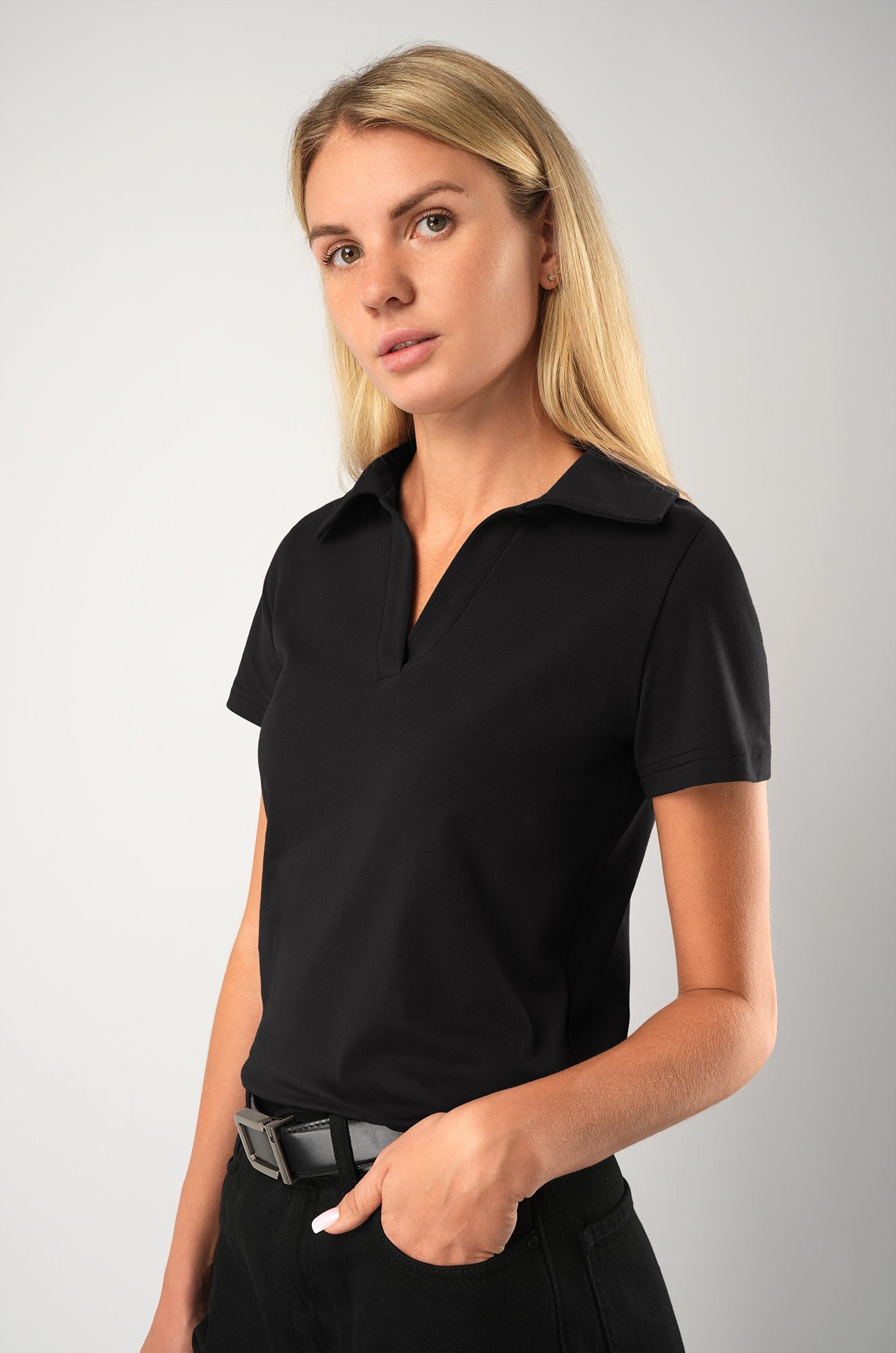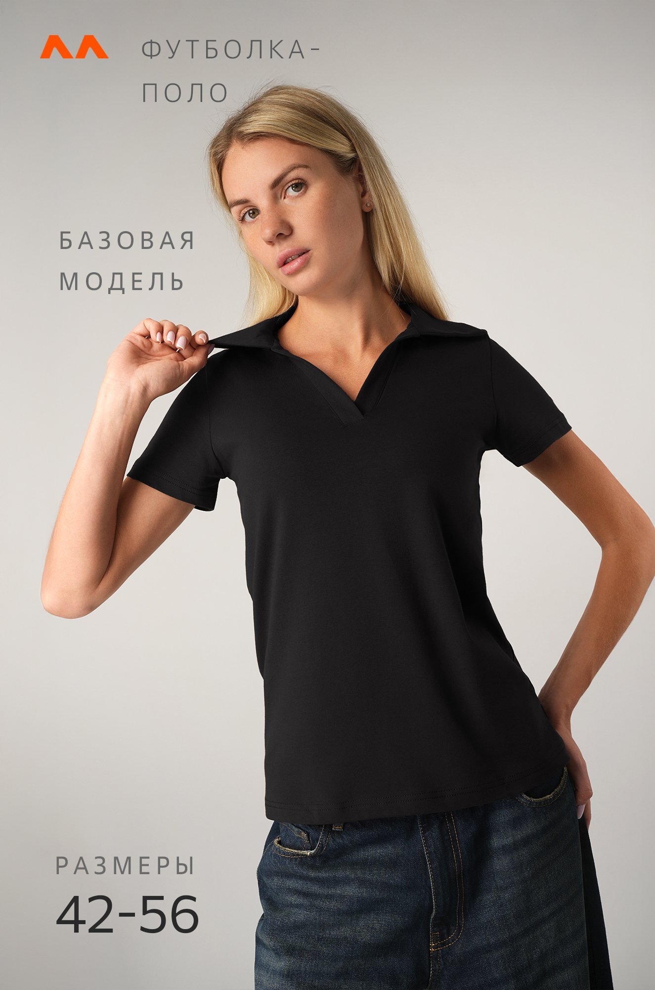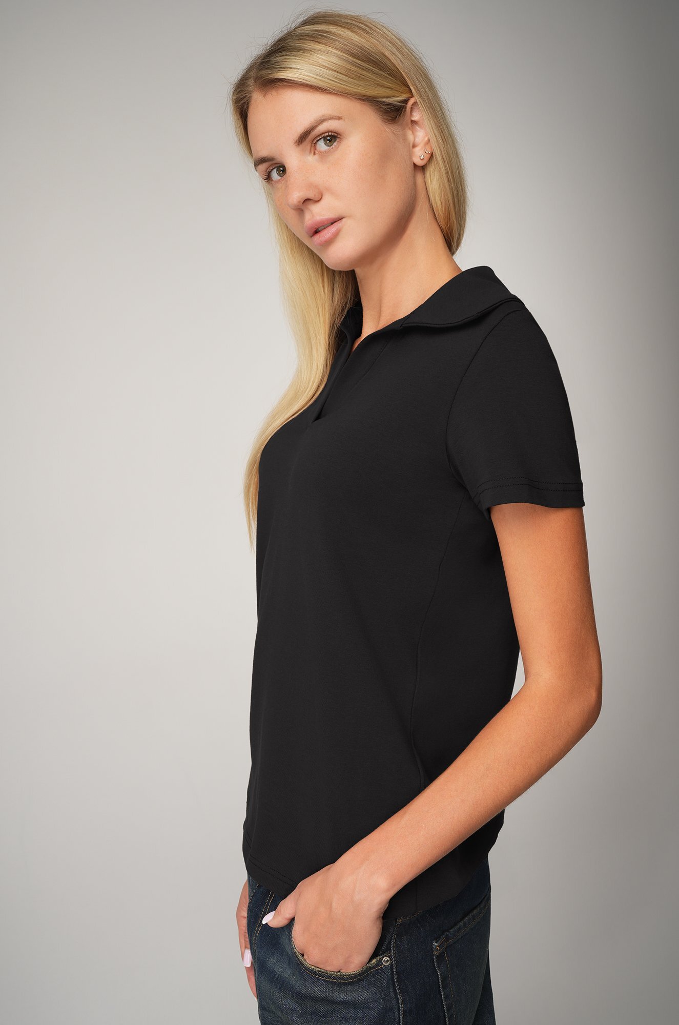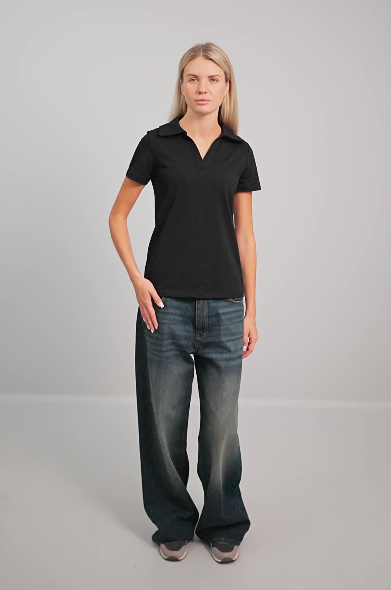 Черная футболка поло из трикотажа кулирная гладь выполнена в лаконичном дизайне: прямой крой, отложной воротник и V-вырез добавляют изящности. Хлопковое поло подойдет для похода в офис, на прогулку и для дома.