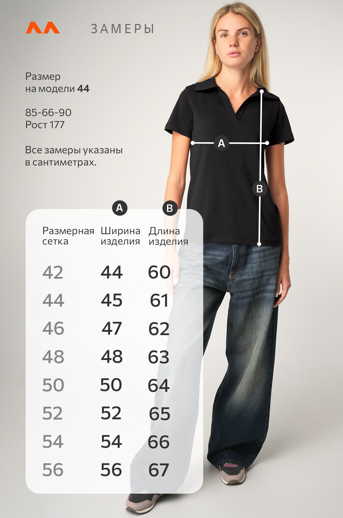 Рост модели 177 см, параметры: объем груди 85, объем талии 66, объем бедер 90. На ней размер 44.