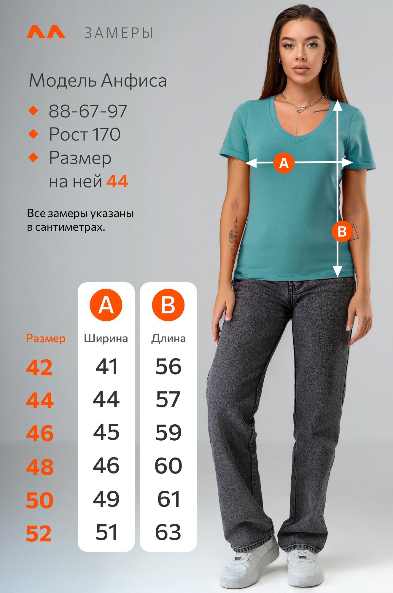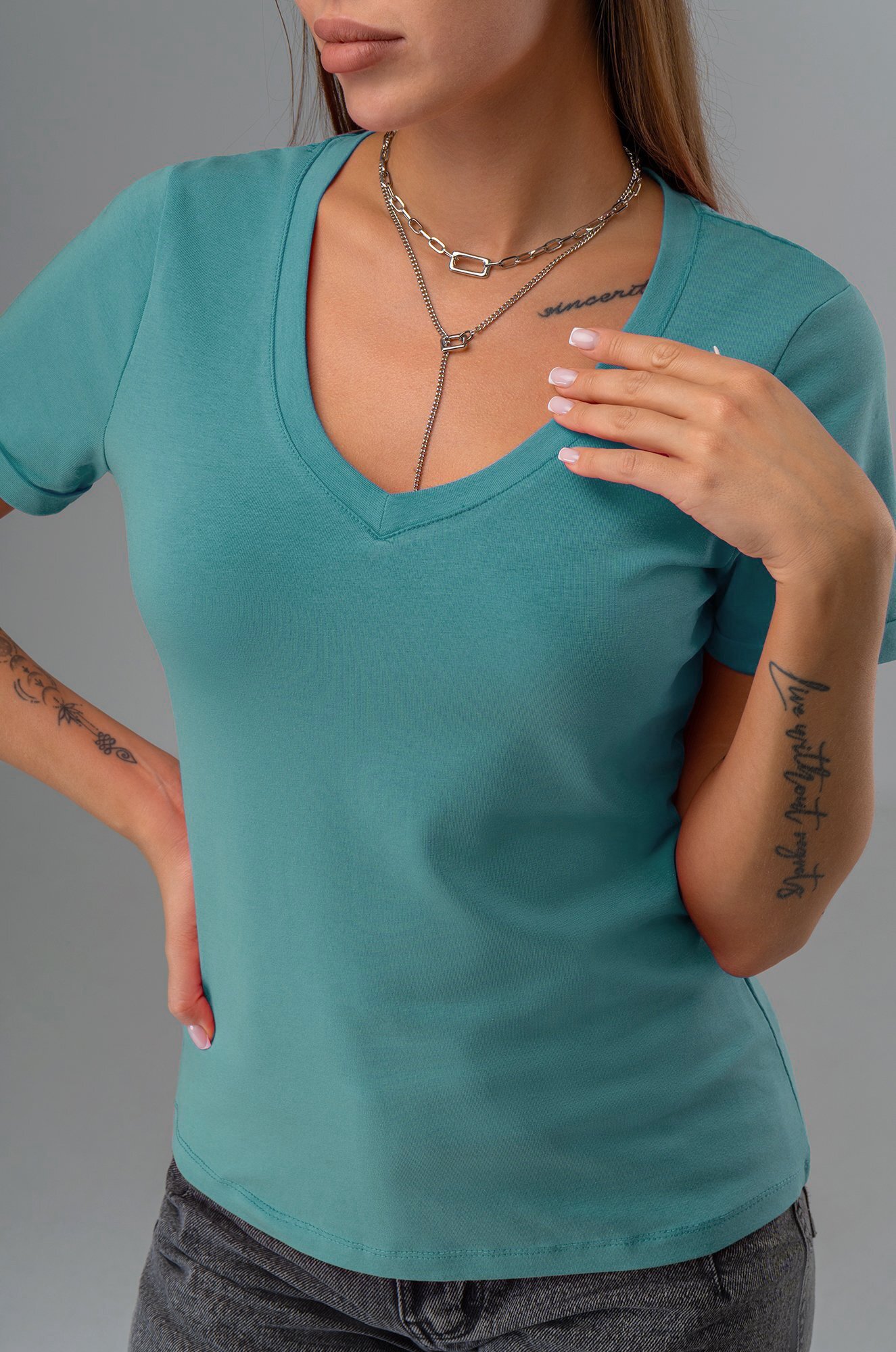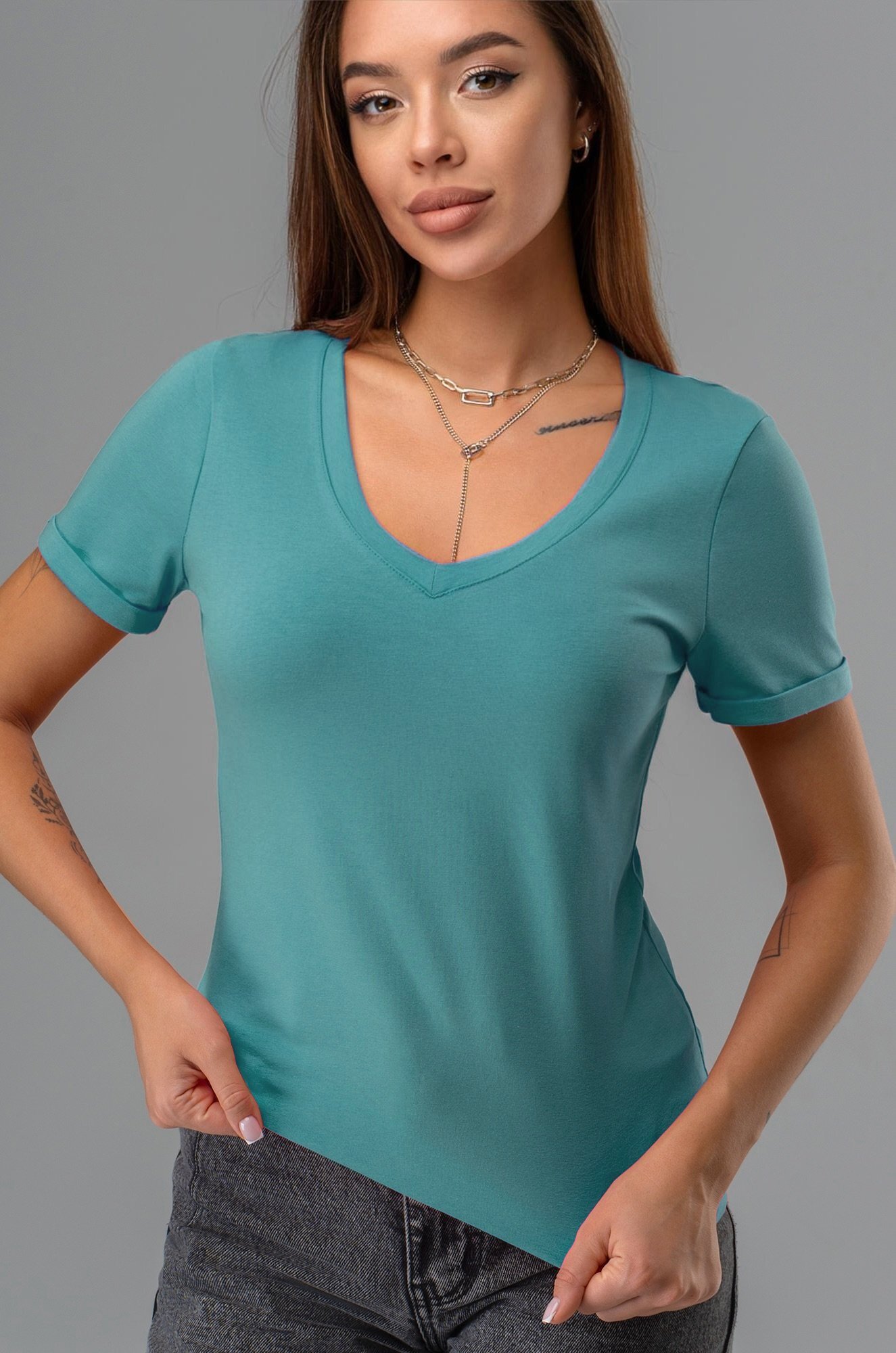 Однотонная футболка с V-образным вырезом – база, которая выручит при создании любого образа! Футболка полуприталенного кроя подчёркивает вашу фигуру и добавляет ещё больше хрупкости. На коротком рукаве небольшой подворот – маленькая деталь, дополняющая образ.