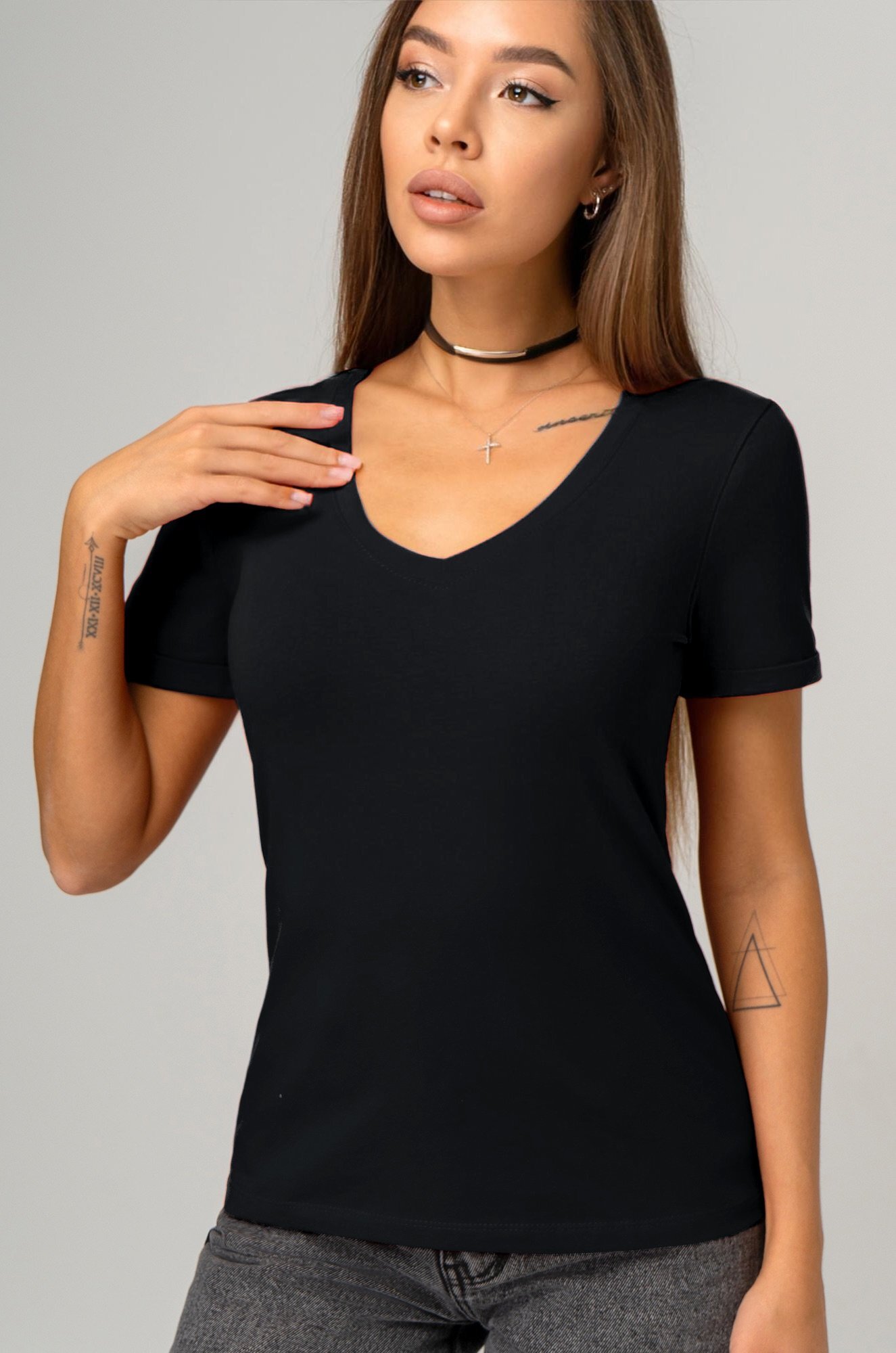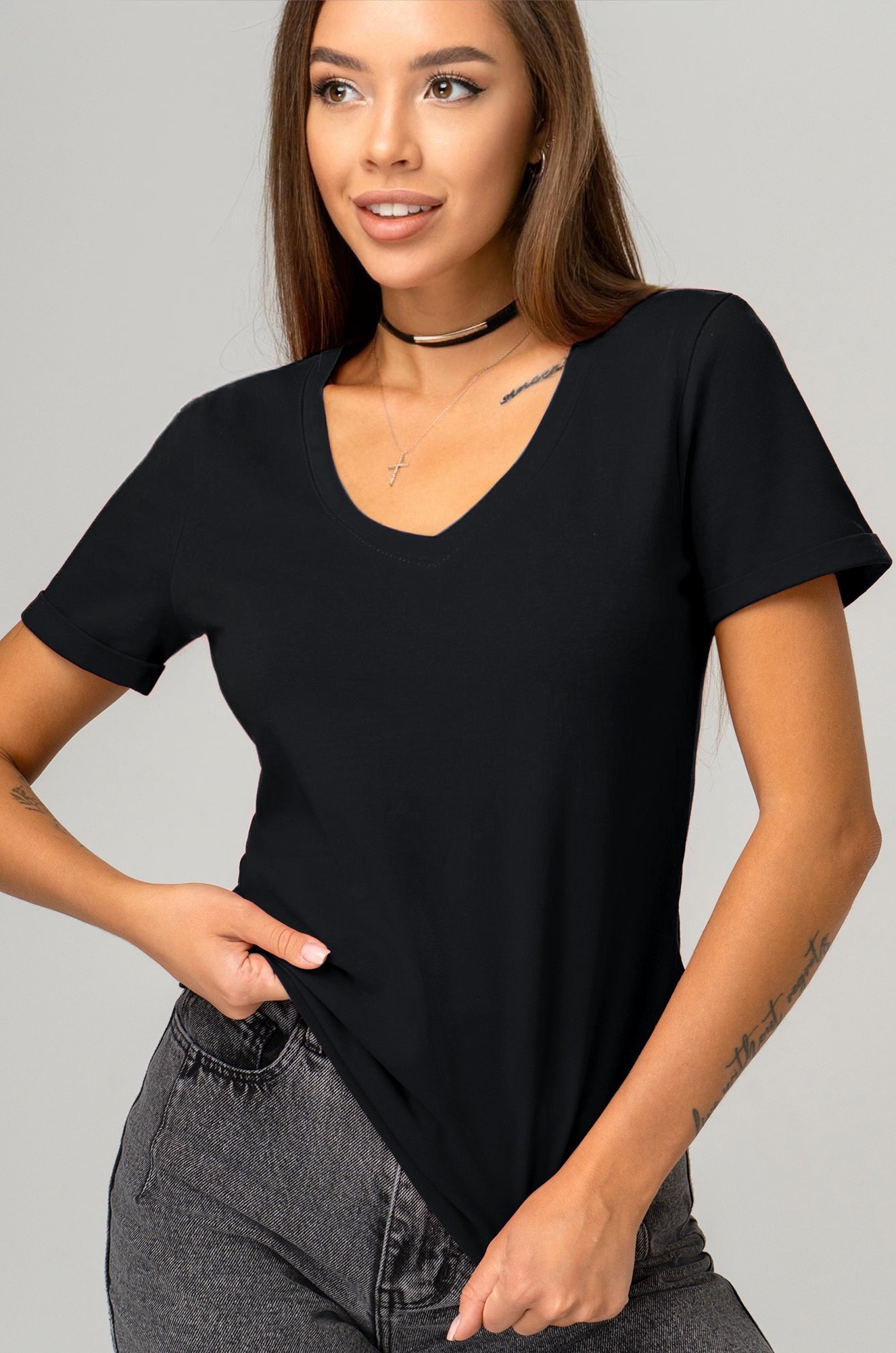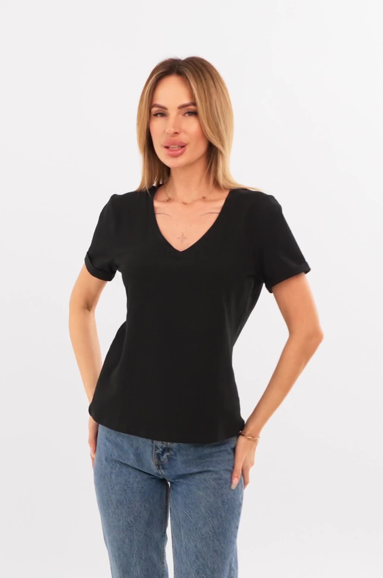 Однотонная футболка с V-образным вырезом – база, которая выручит при создании любого образа!