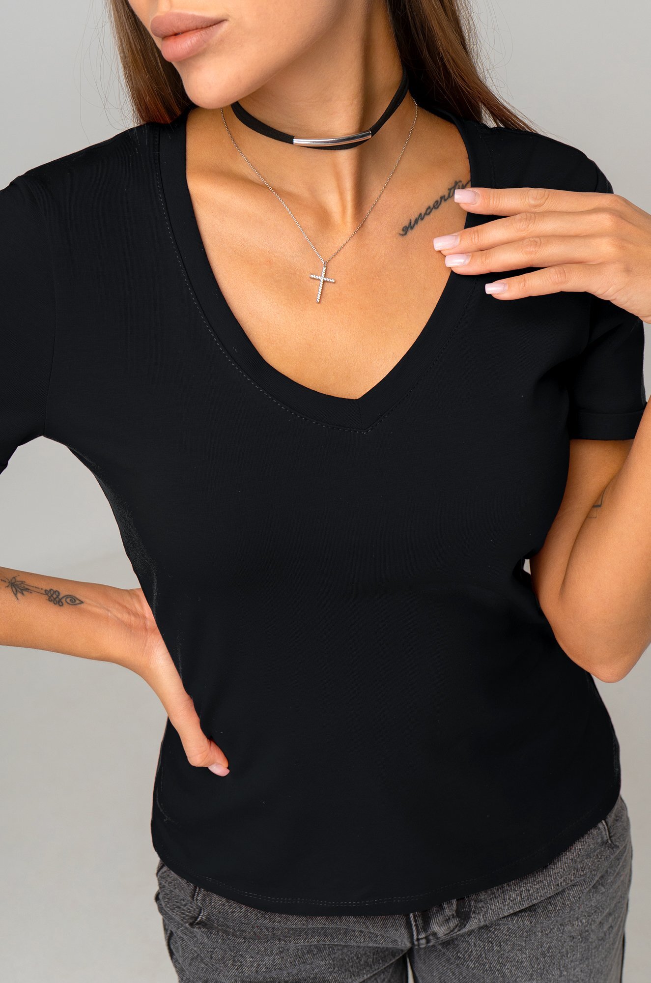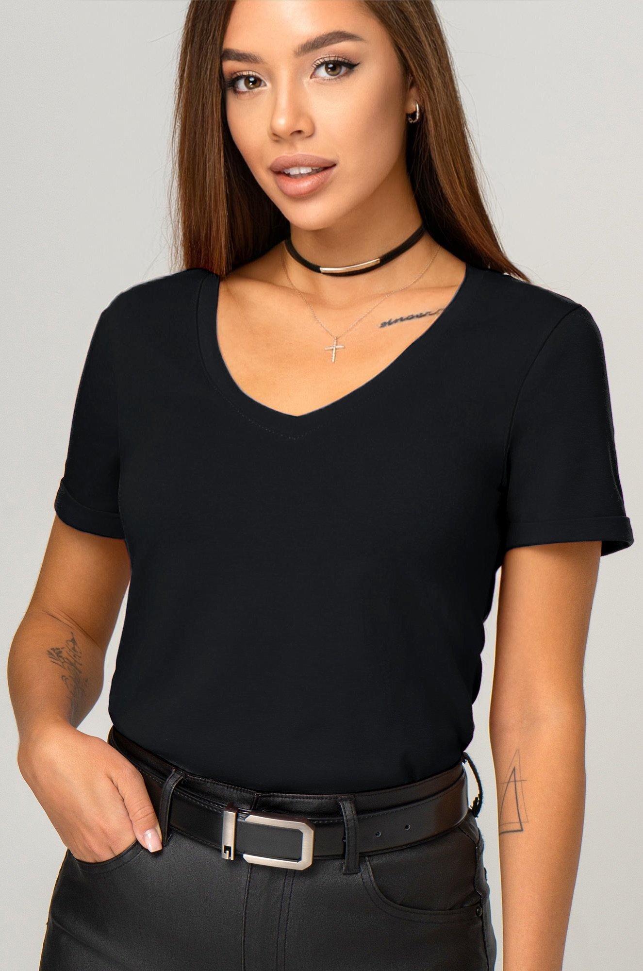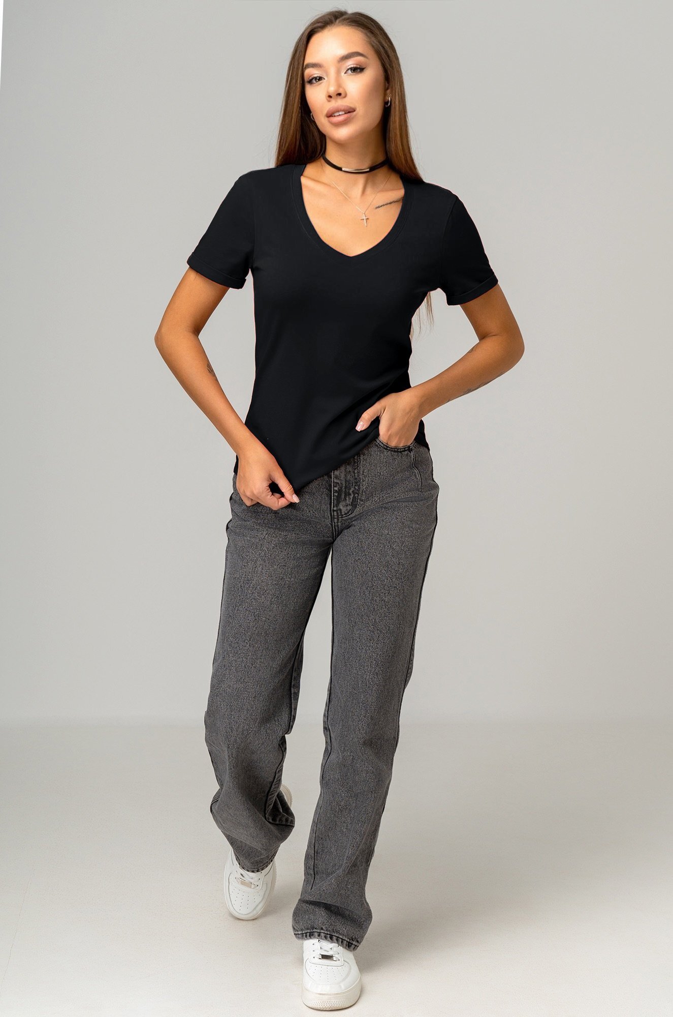 Однотонная футболка с V-образным вырезом – база, которая выручит при создании любого образа!