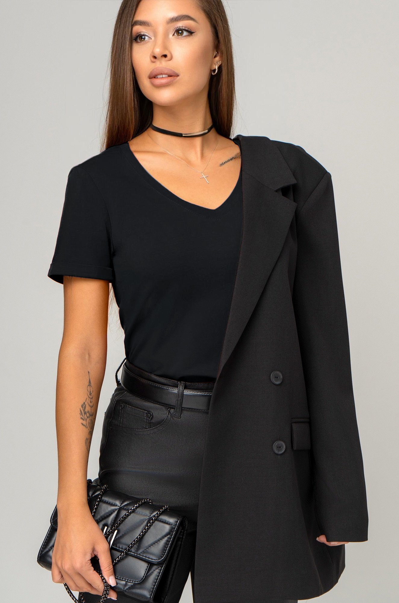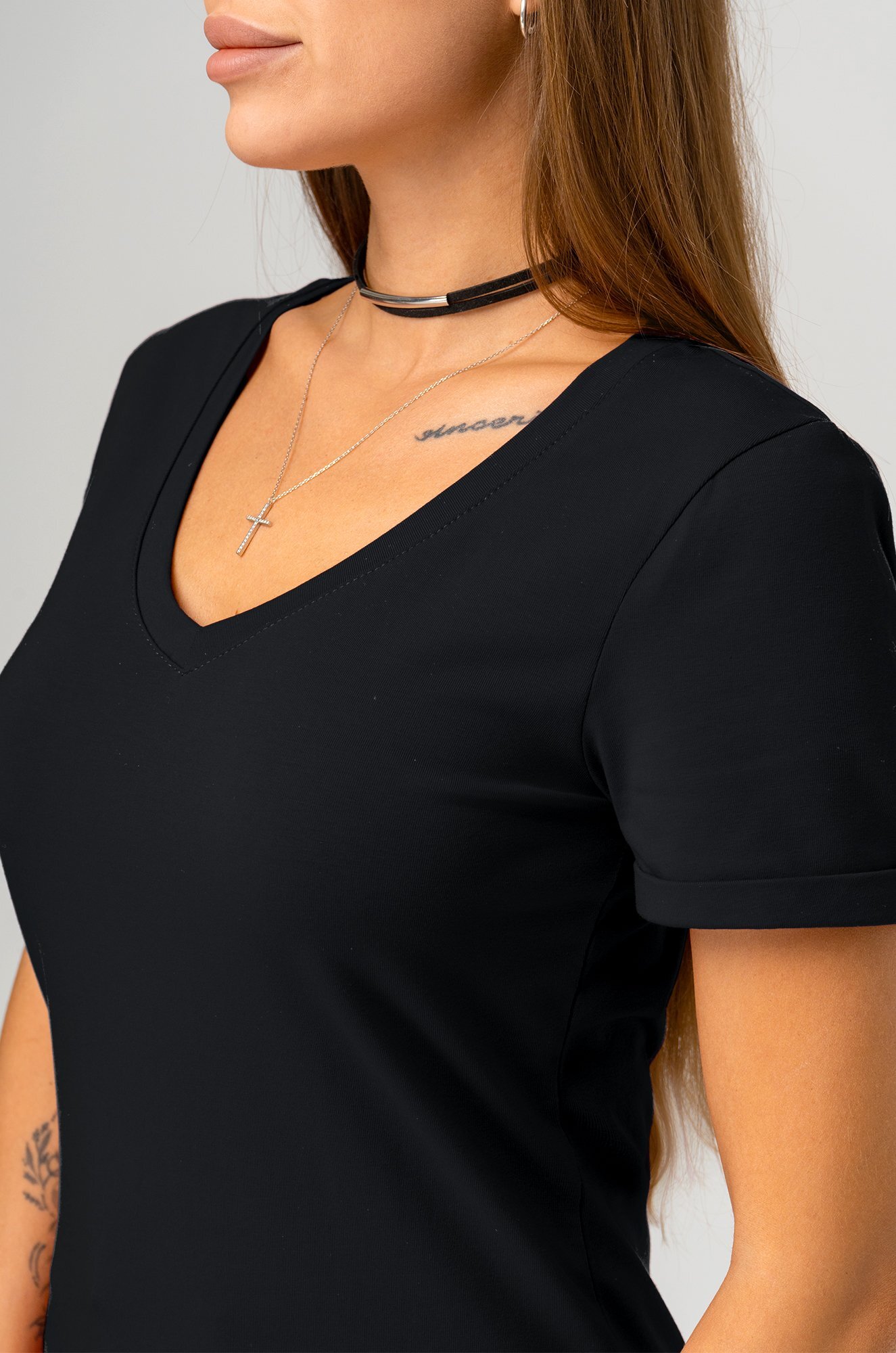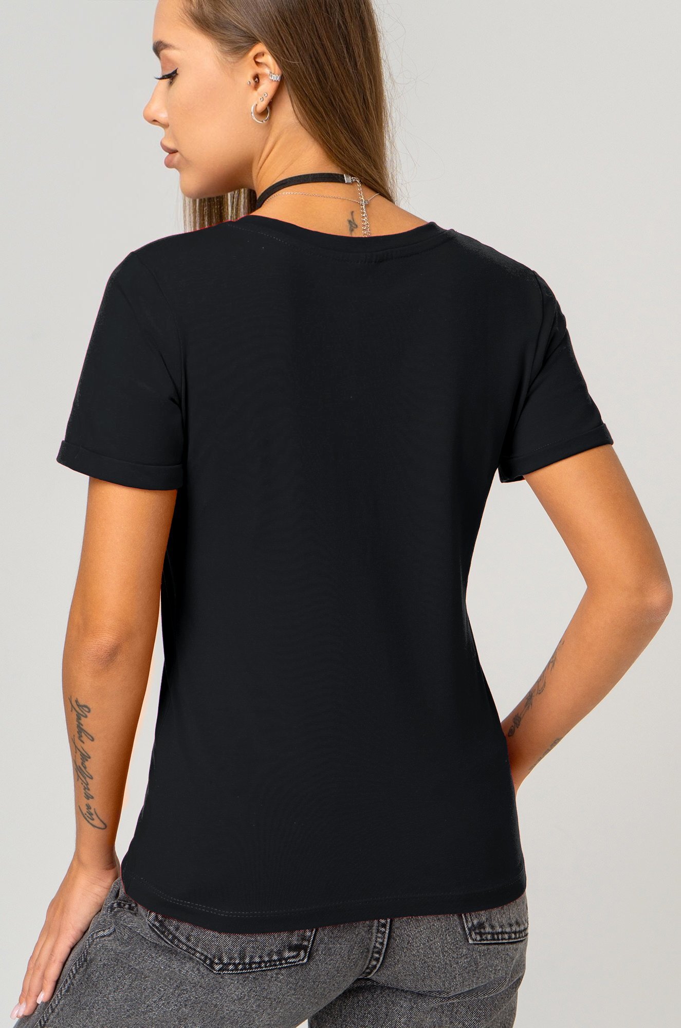 Черная футболка полуприталенного кроя подчёркивает вашу фигуру и добавляет ещё больше хрупкости. На коротком рукаве небольшой подворот – маленькая деталь, дополняющая образ.