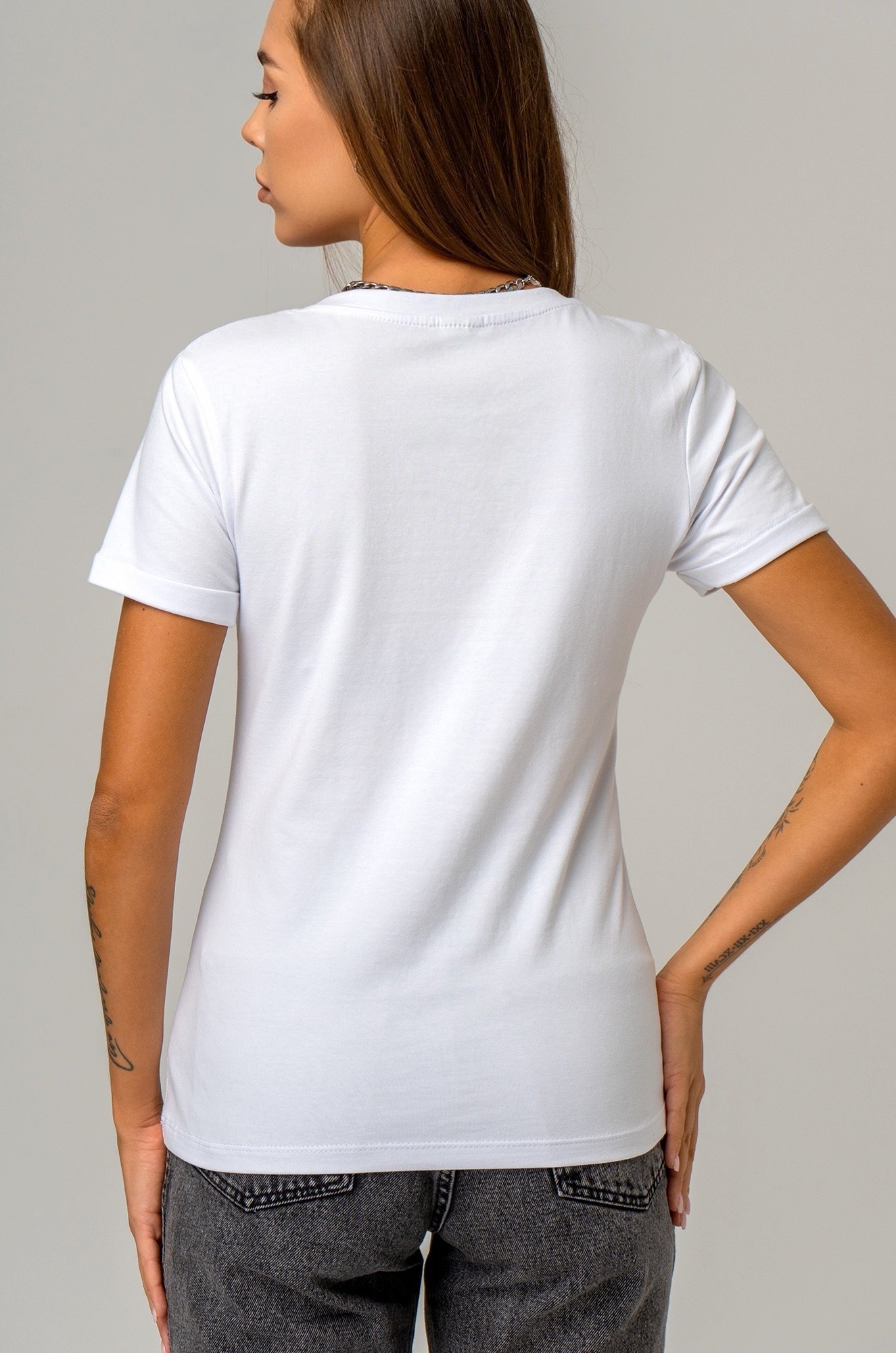 Белая футболка полуприталенного кроя подчёркивает вашу фигуру и добавляет ещё больше хрупкости. На коротком рукаве небольшой подворот – маленькая деталь, дополняющая образ.