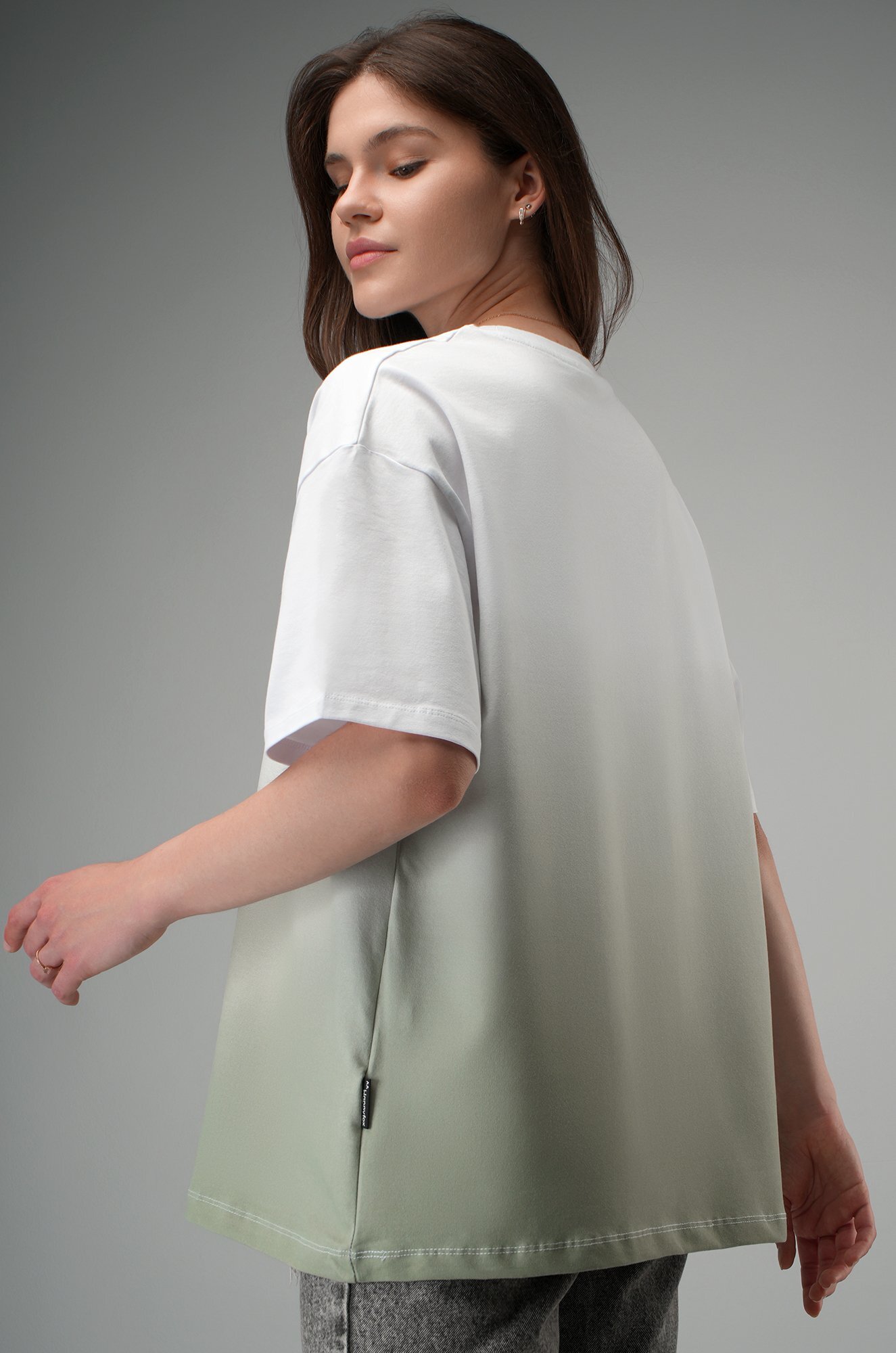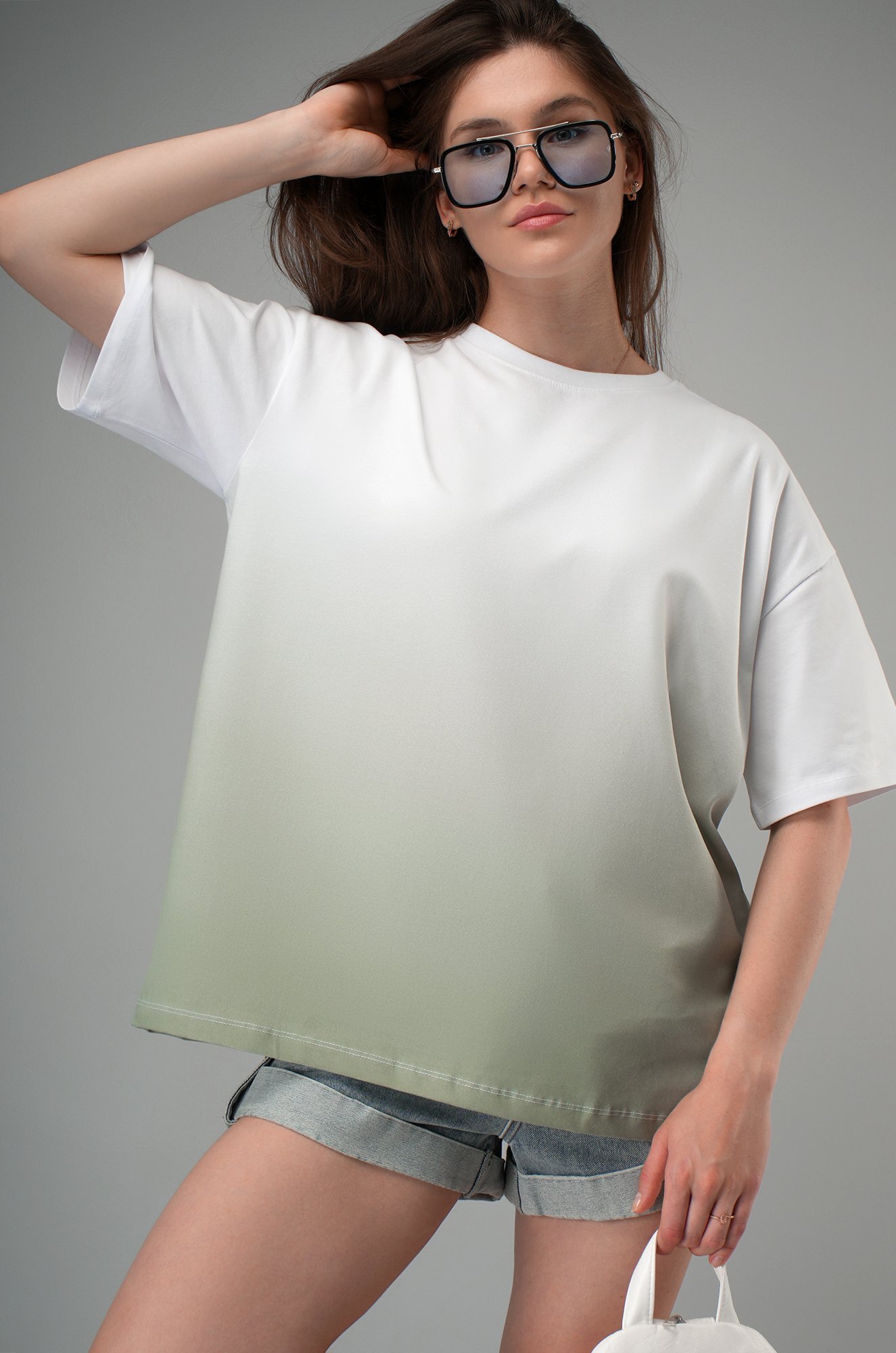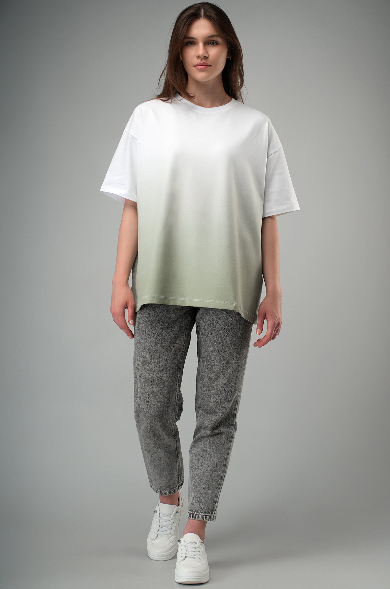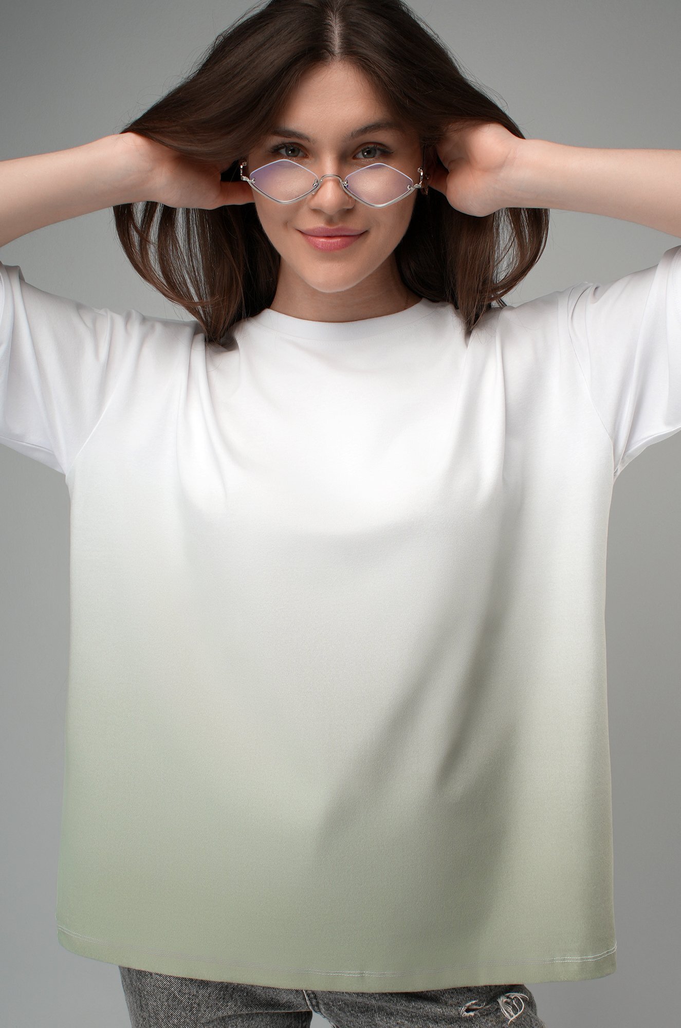 Женская футболка с градиентным принтом выполнена из хлопка с добавлением лайкры. Футболка с нежным эффектом омбре идеальна для создания стильных и расслабленных образов. Плавный переход от серого к зеленому добавляет свежести и легкости.