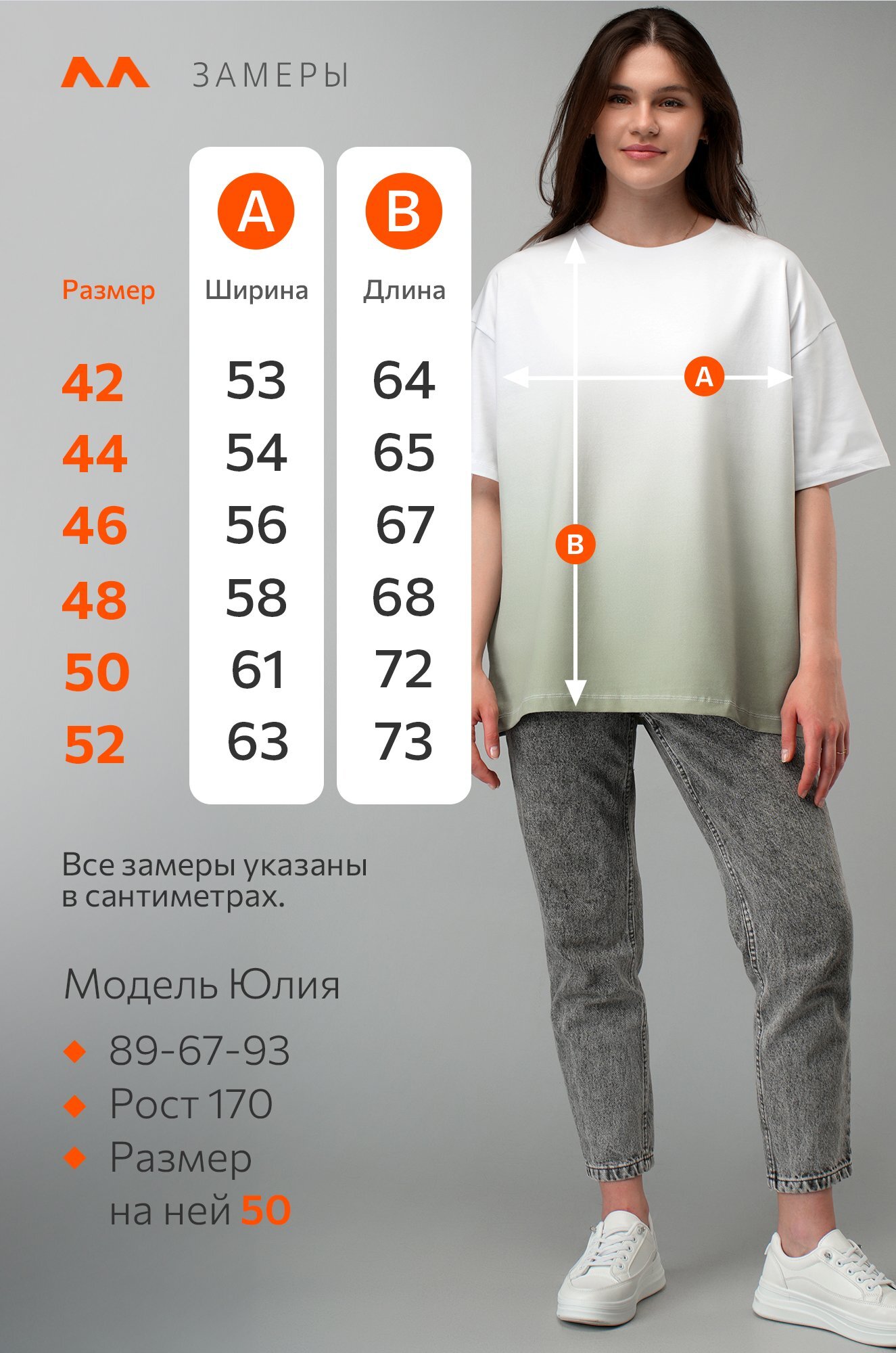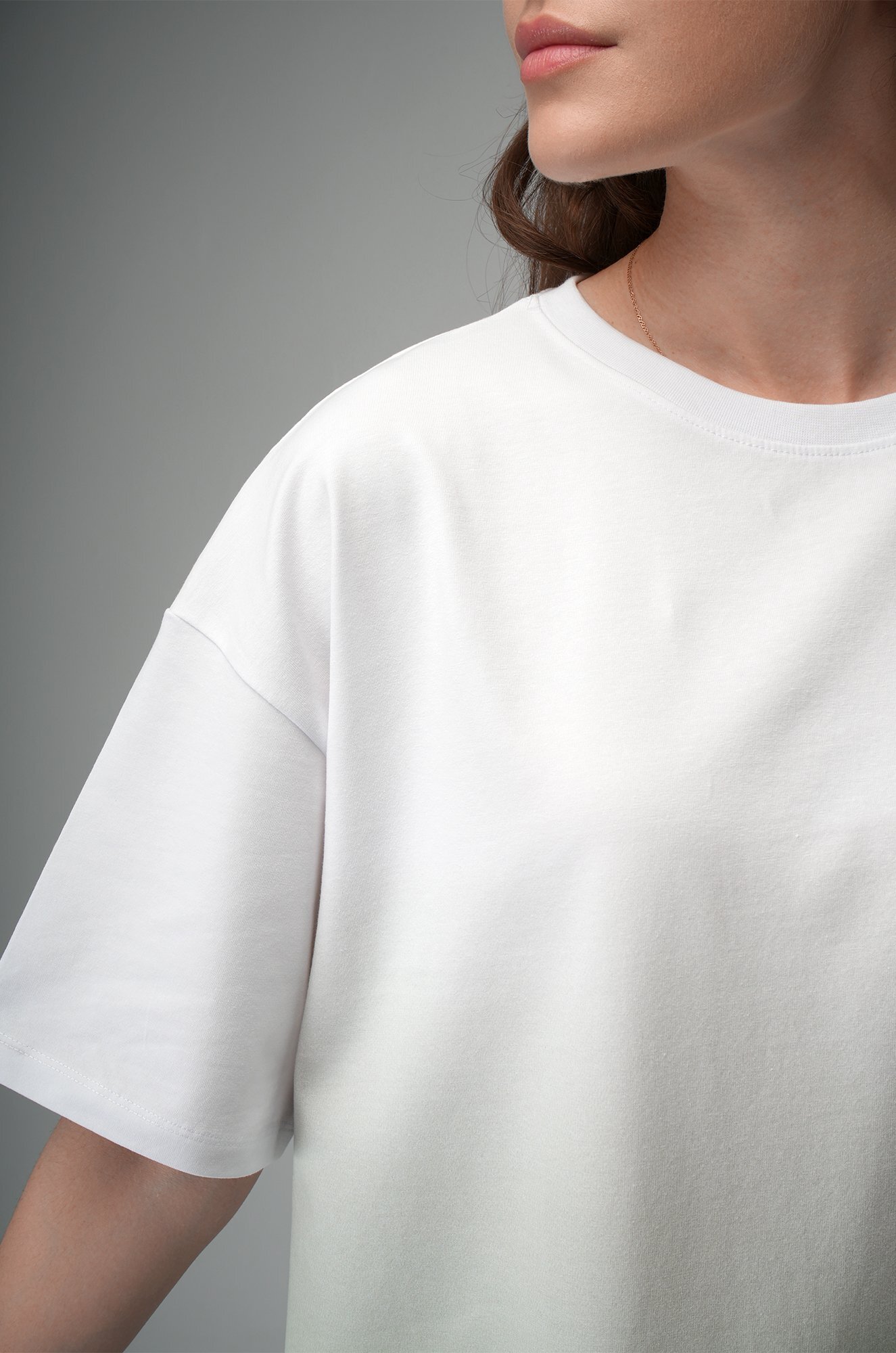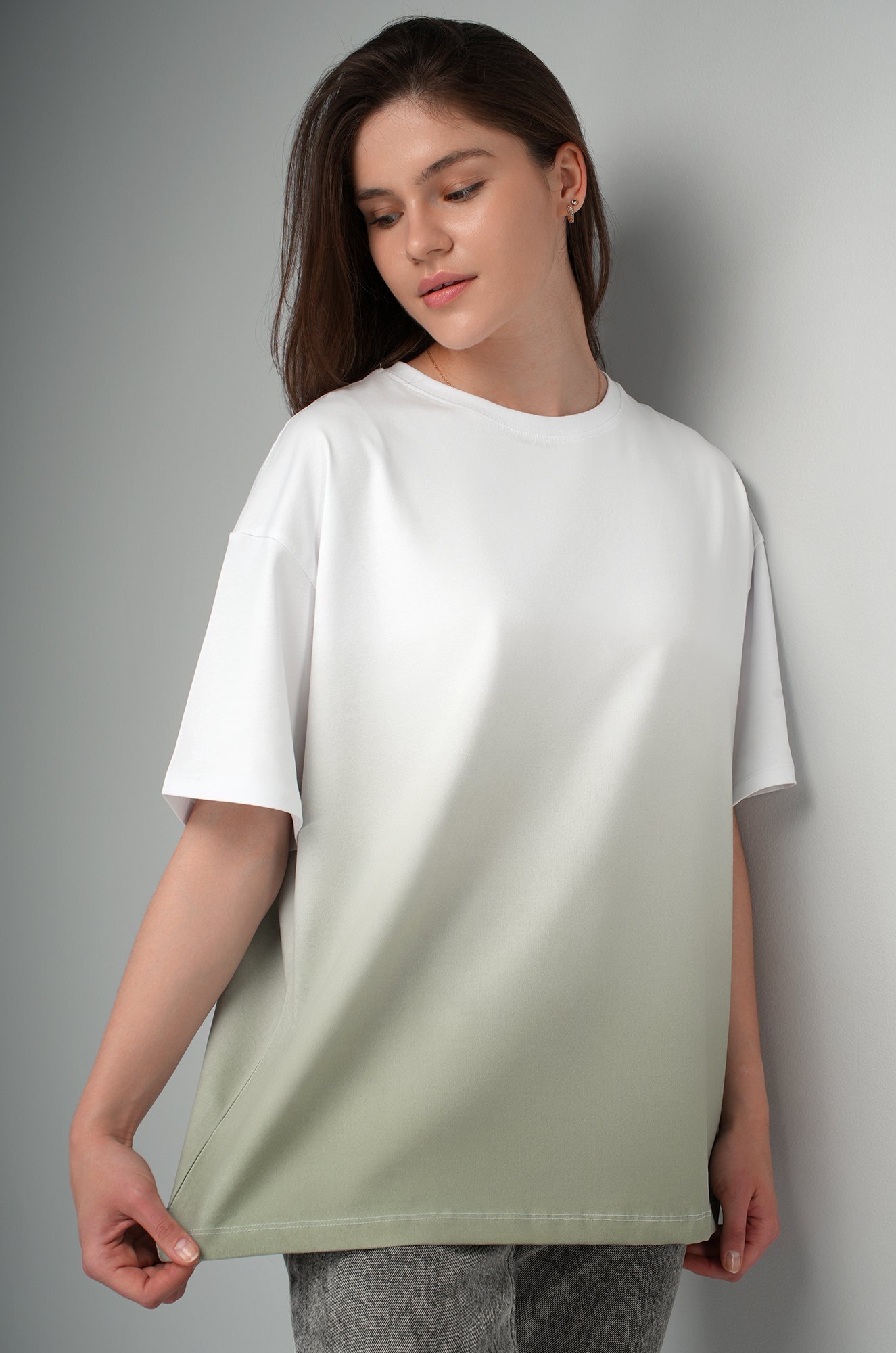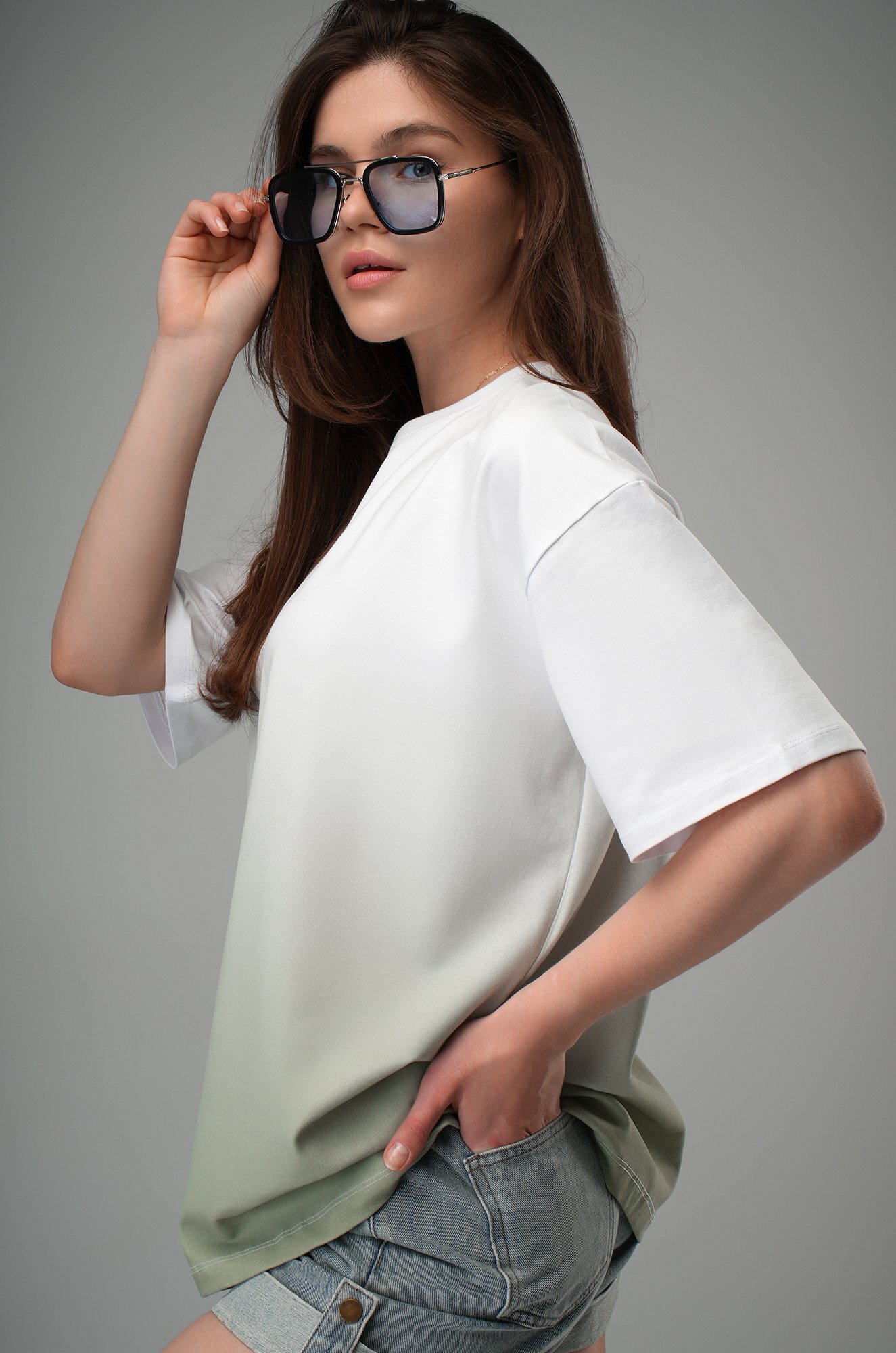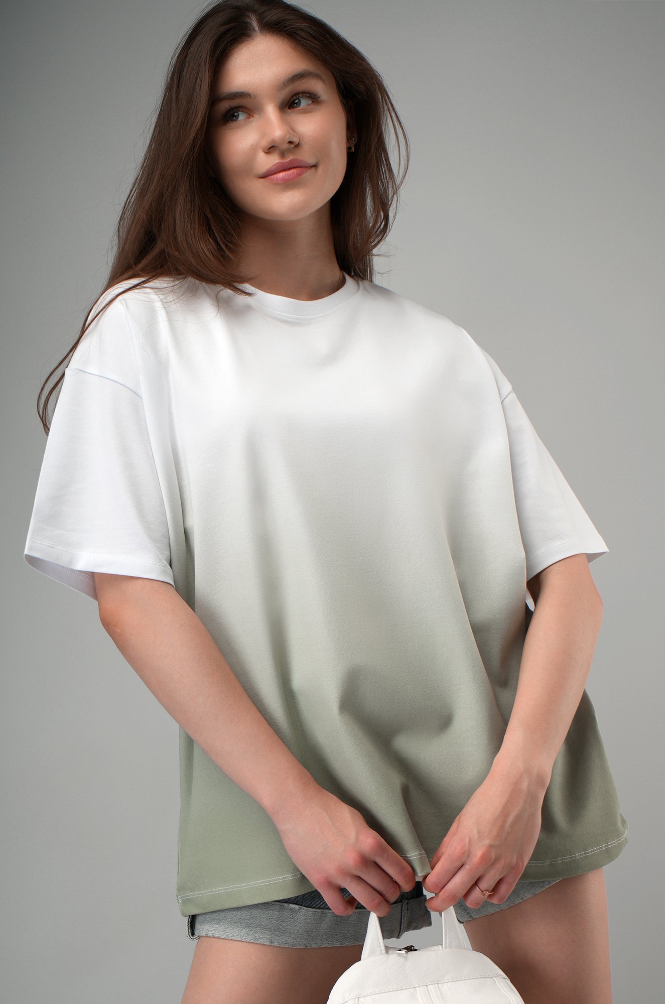 Женская футболка с градиентным принтом выполнена из хлопка с добавлением лайкры. Футболка с нежным эффектом омбре идеальна для создания стильных и расслабленных образов. Плавный переход от серого к зеленому добавляет свежести и легкости.