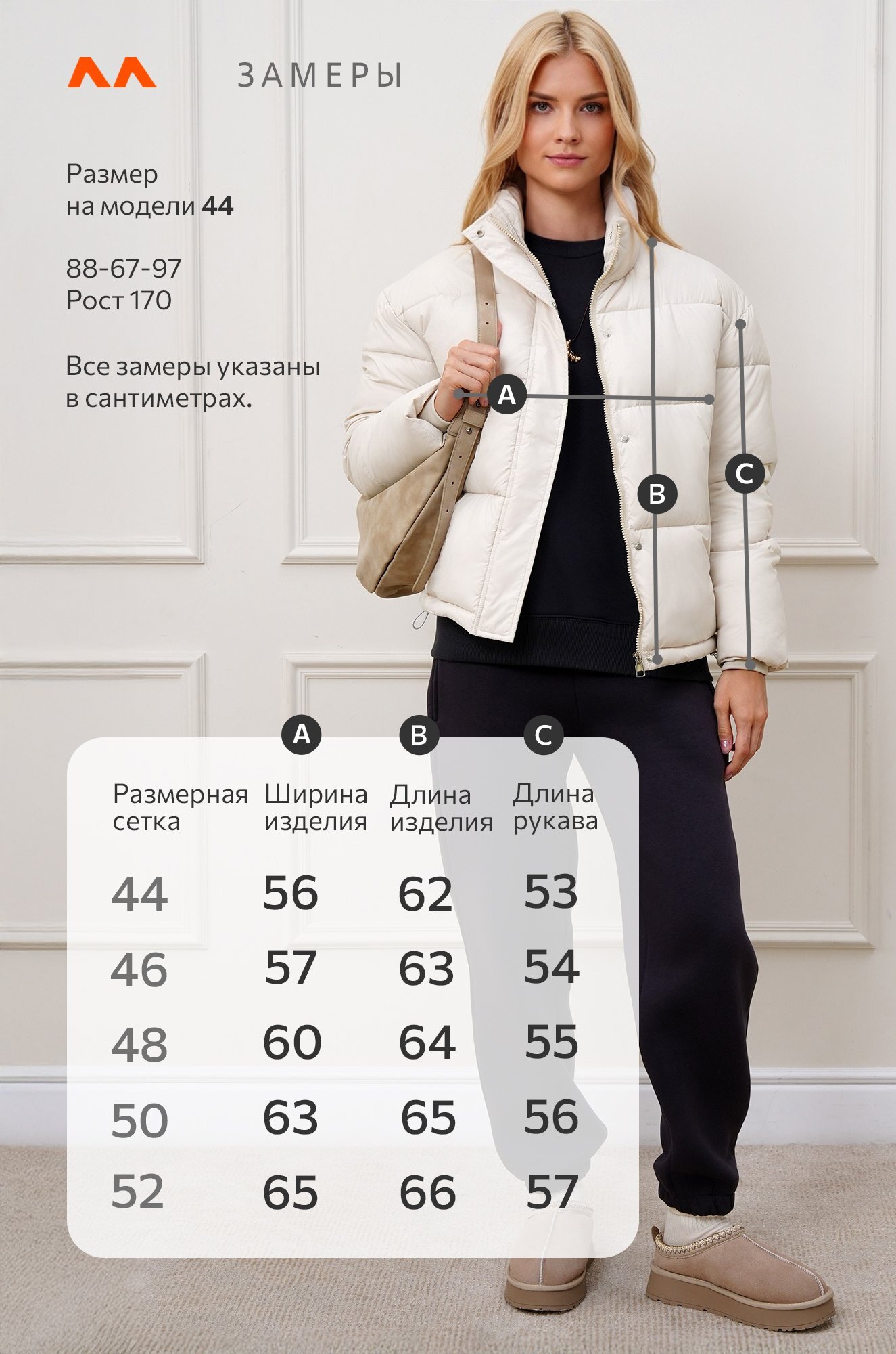Размер 44: длина:62 см; ширина:56 см; длина рукава внешняя:53 см; длина рукава внутренняя:44 см.