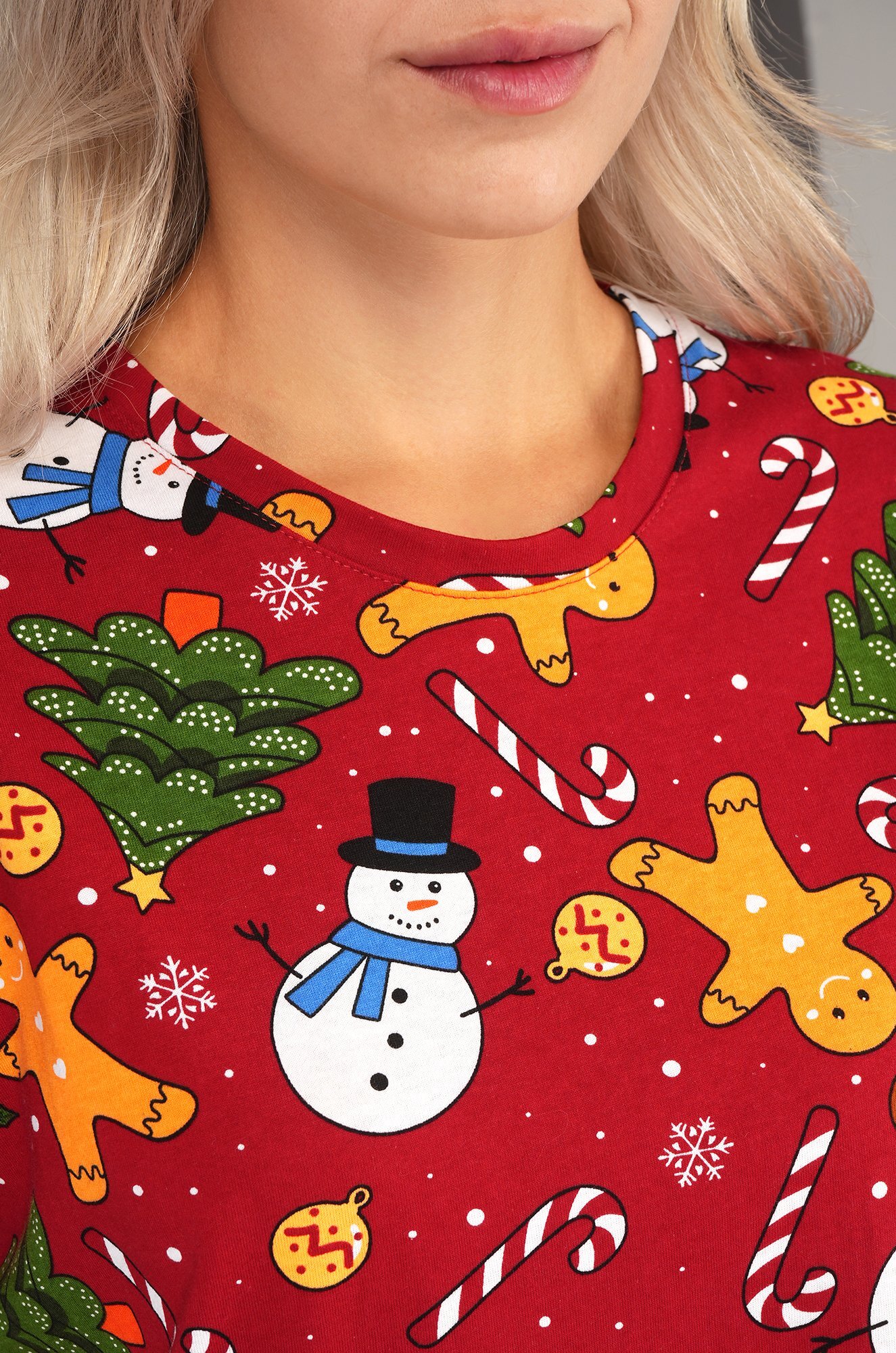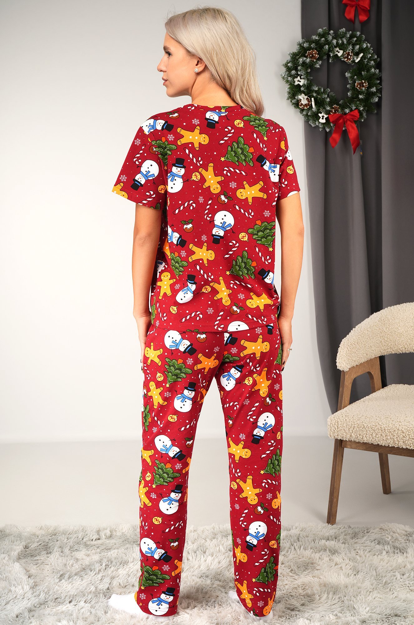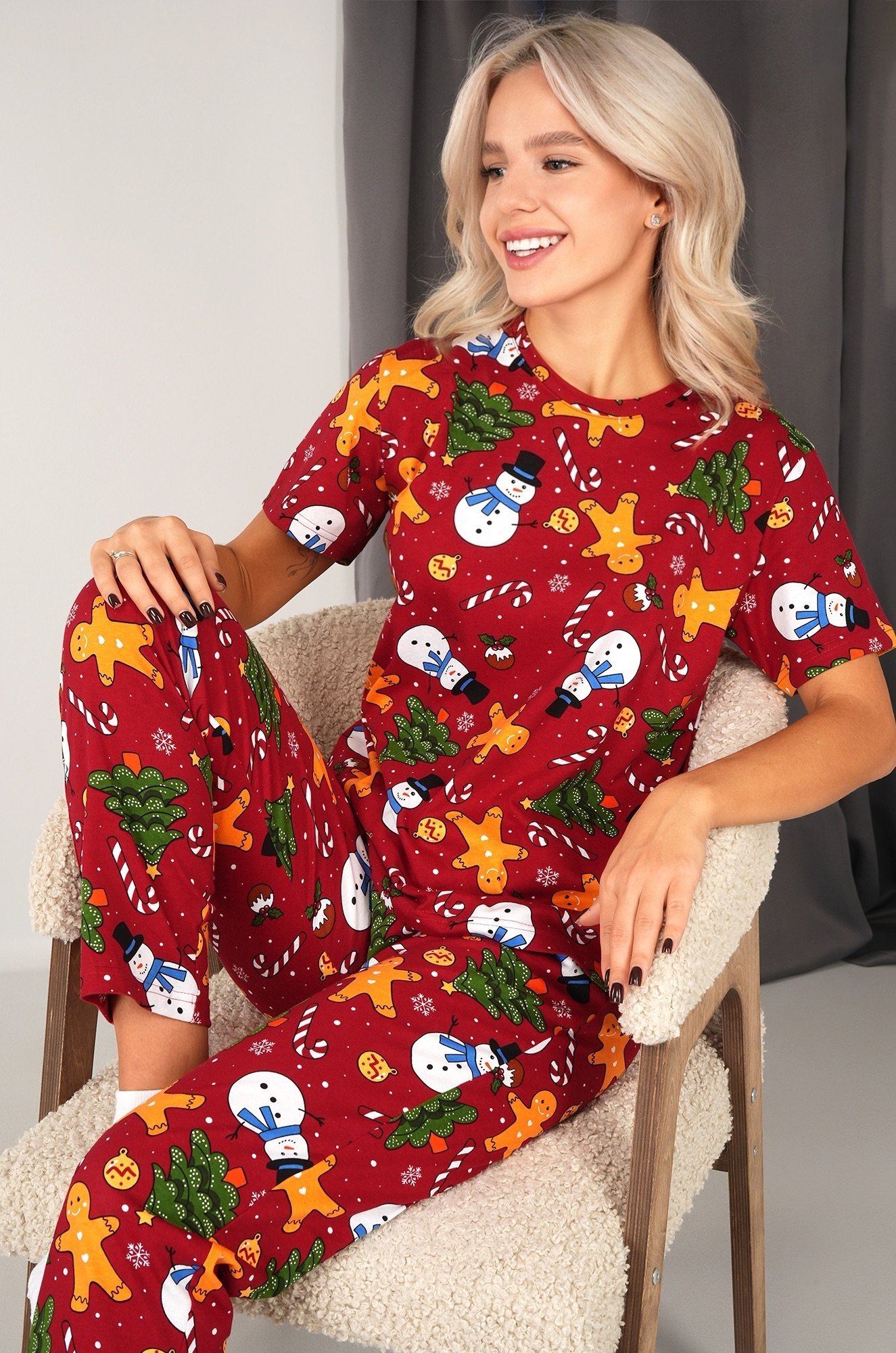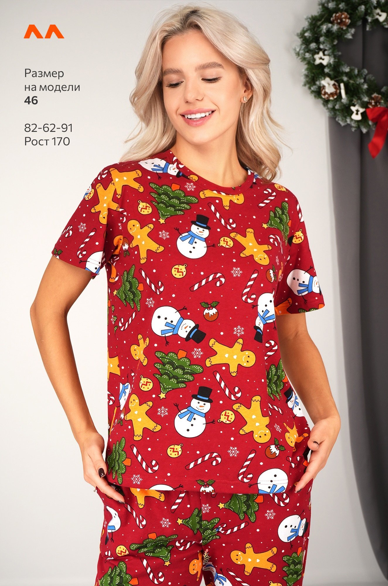 Женская новогодняя пижама с брюками выполнена из натурального 100% хлопка. Яркий красный цвет и праздничный принт создают атмосферу праздника и поднимают настроение, а мягкий трикотаж дарит комфорт. Домашний комплект двойка для женщин станет чудесным подарком на Новый год или Рождество.