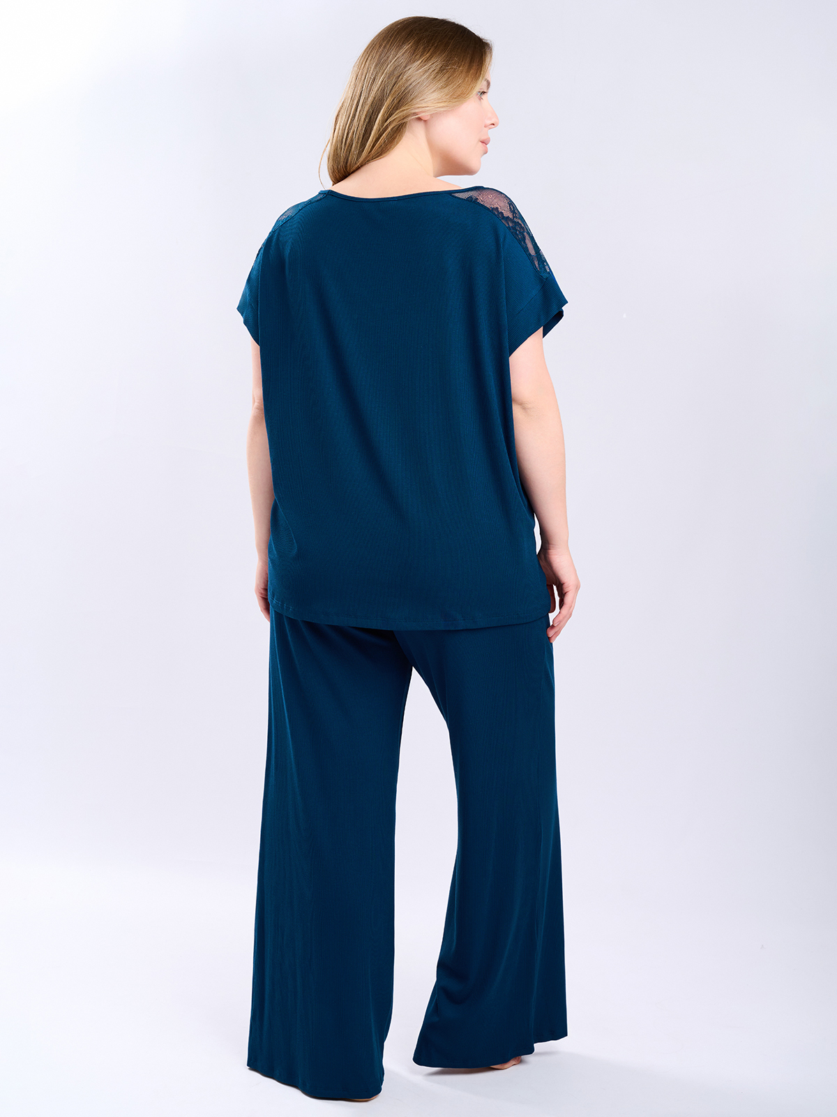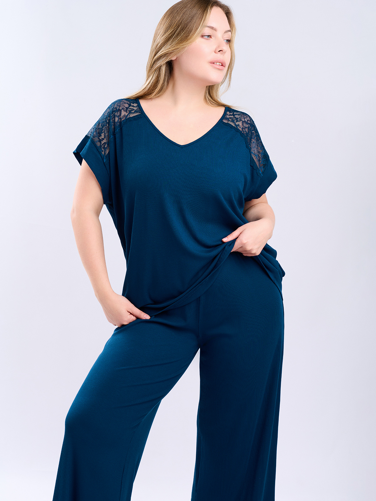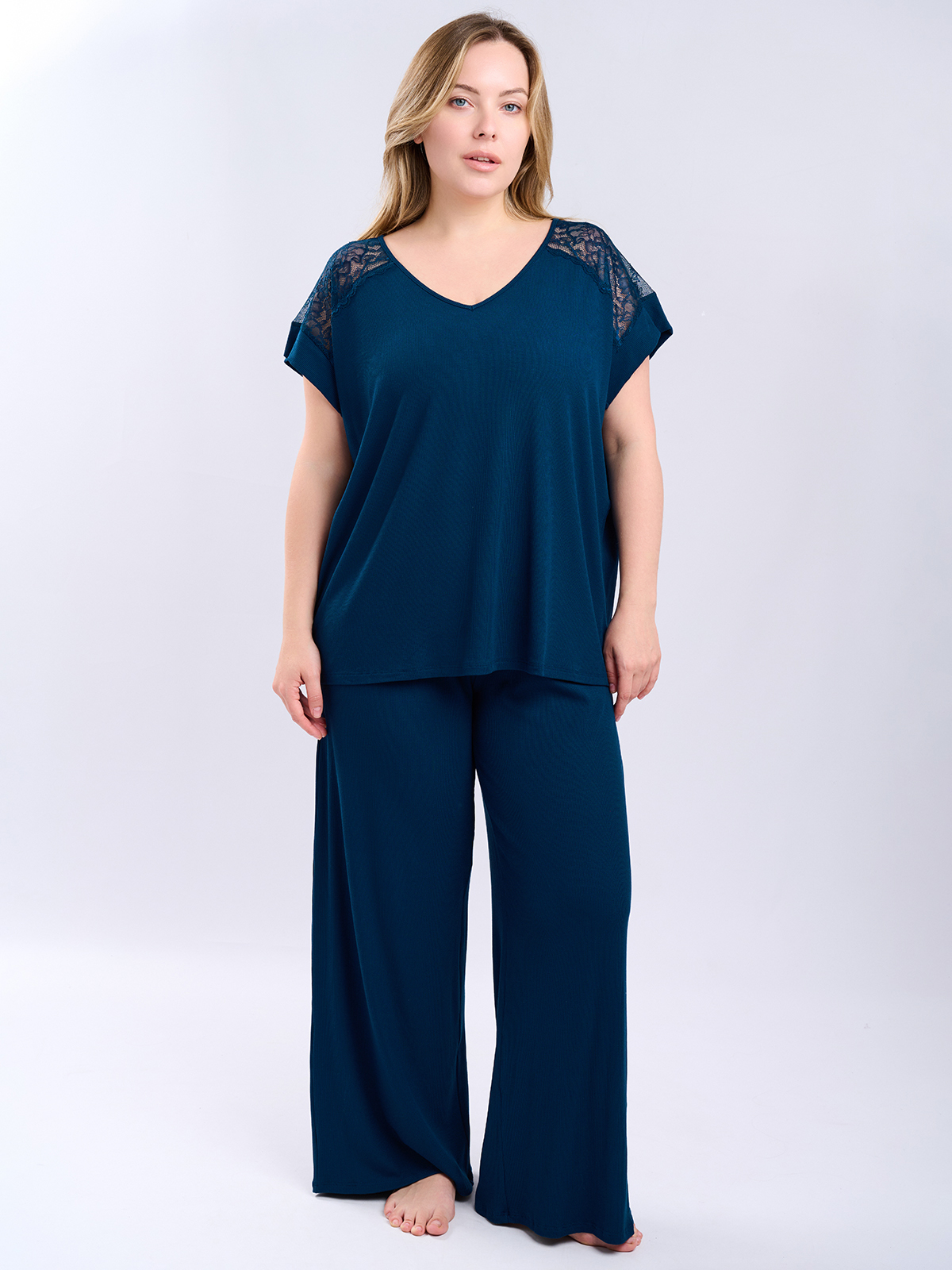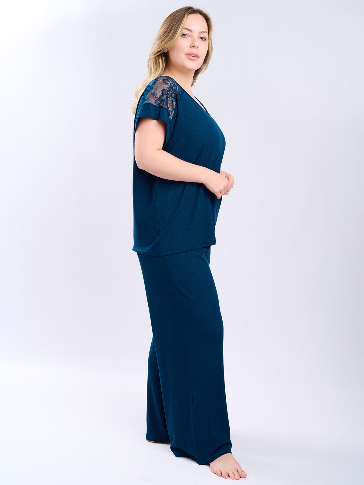 Женская пижама из вискозы создана для отдыха дома и сна. Состоит из футболки с кружевными вставками и свободных широких брюк. Сшита из мягкой и гигроскопичной вискозы, поэтому в пижаме особенно комфортно летом в жаркие дни.