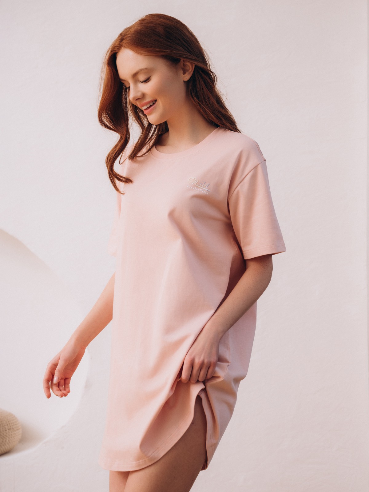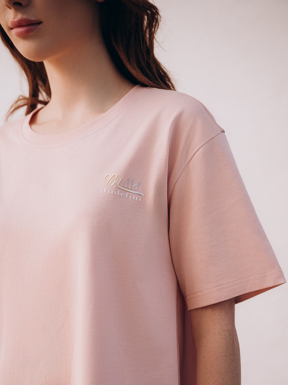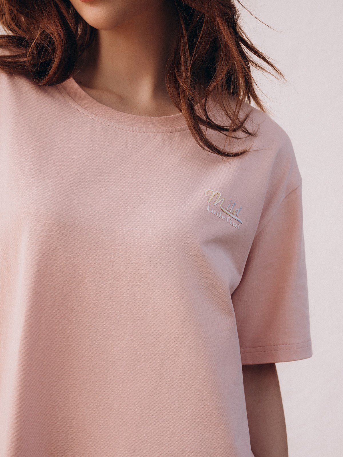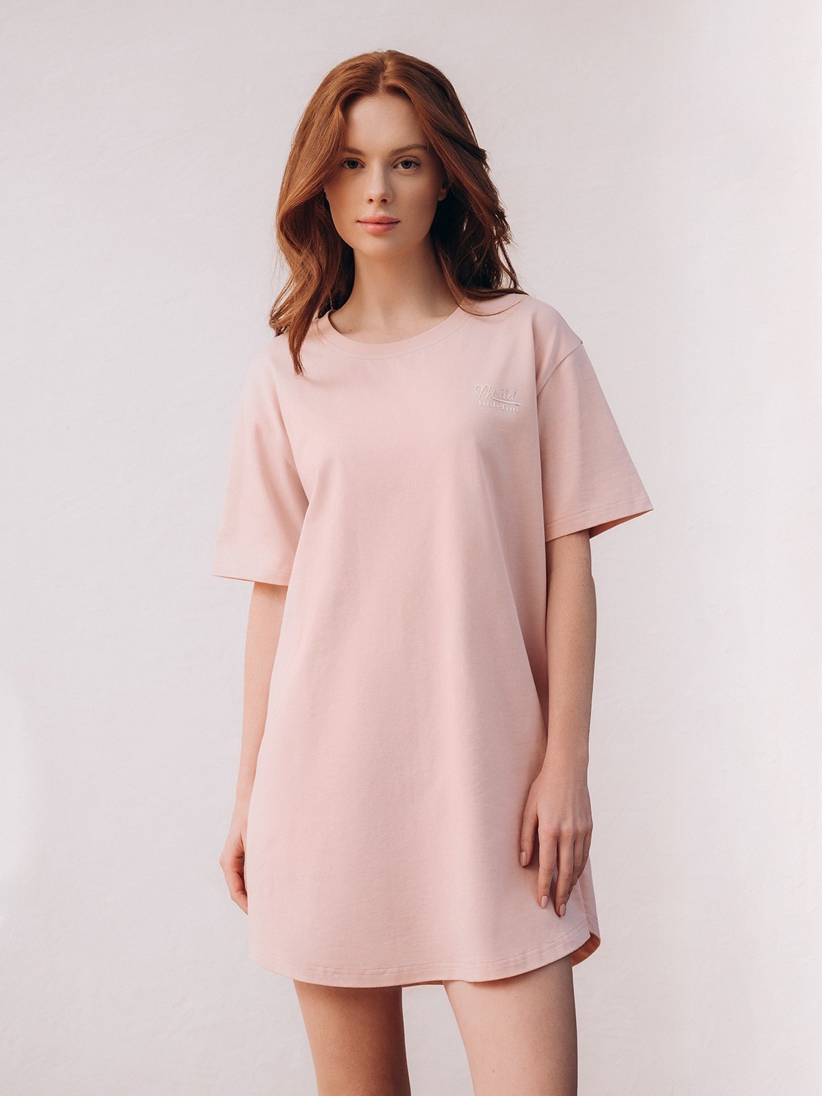 Сорочка украшена принтом в виде надписи «Mild Indefini» сбоку на груди.