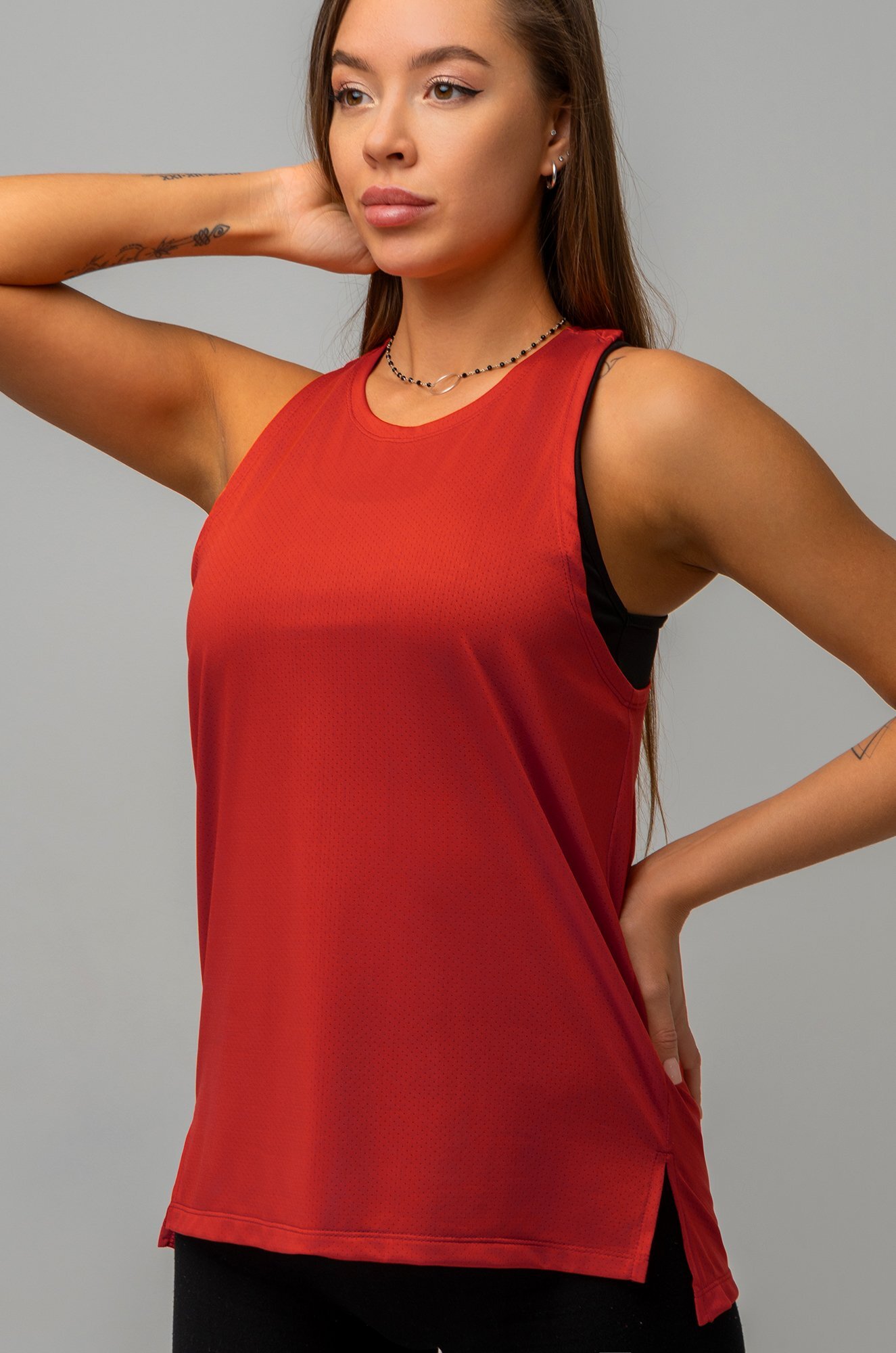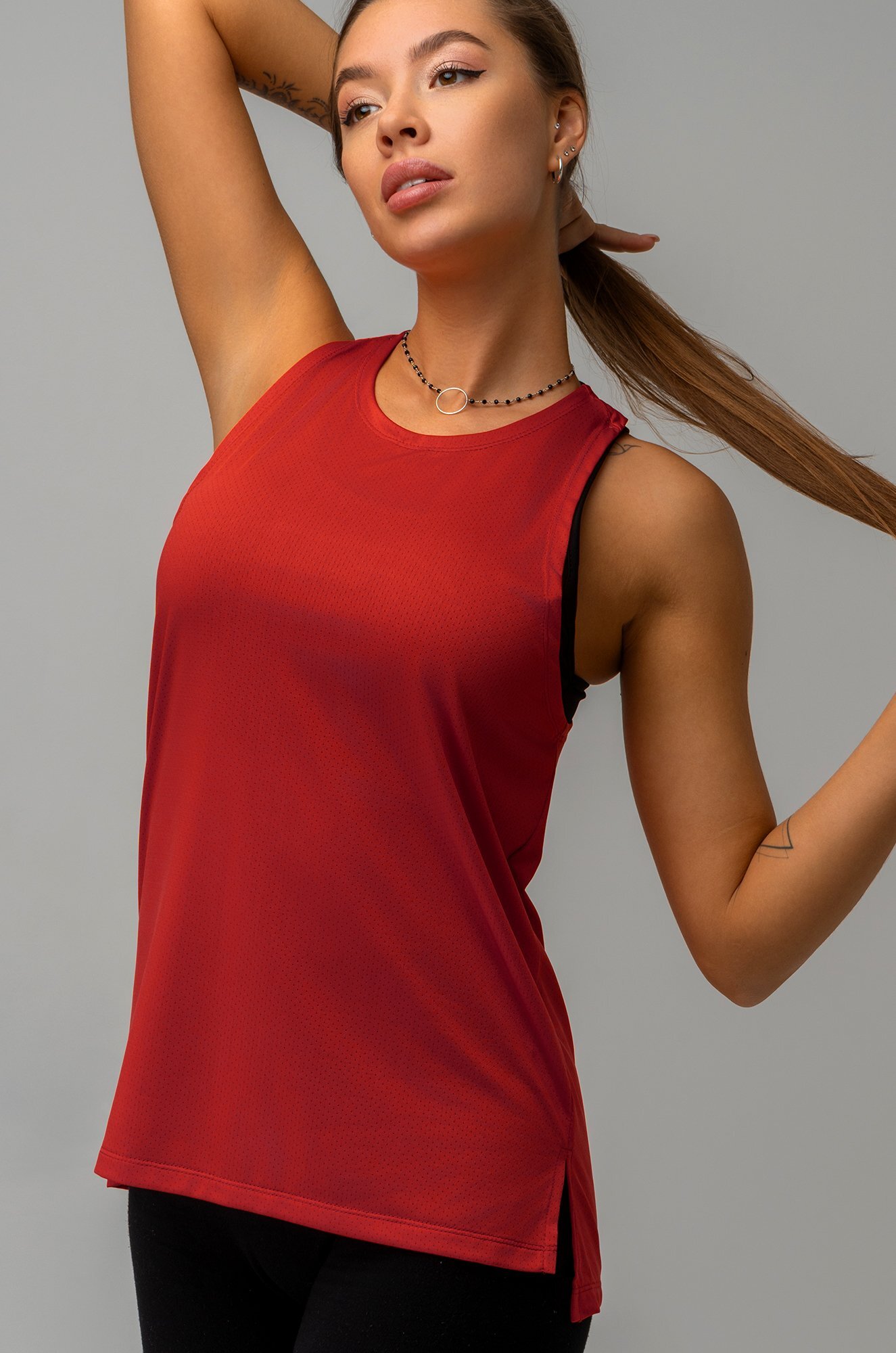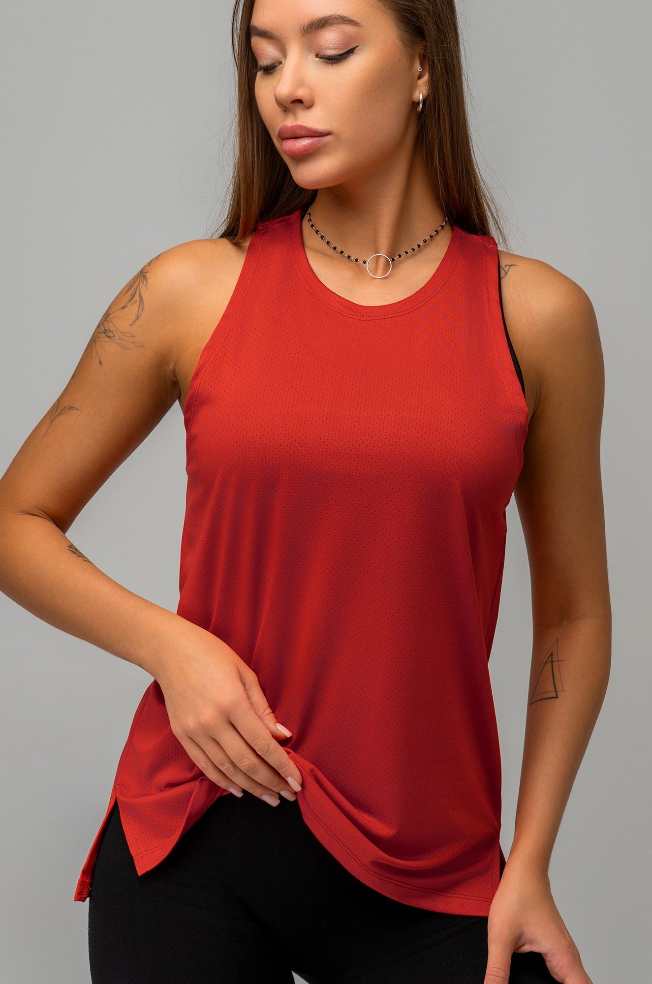 Красная майка-топ выполнена из перфорированной ткани – отличный вариант для спорта. Модель отлично пропускает воздух и отводит лишнюю влагу, позволяя сосредоточиться только на тренировочном процессе. Состав из 100% полиэстера придаёт майке прочность и исключительную легкость, что делает её идеальным выбором для активного образа жизни. Топ легко отстирывается в прохладной воде, быстро высыхает и почти не мнется.