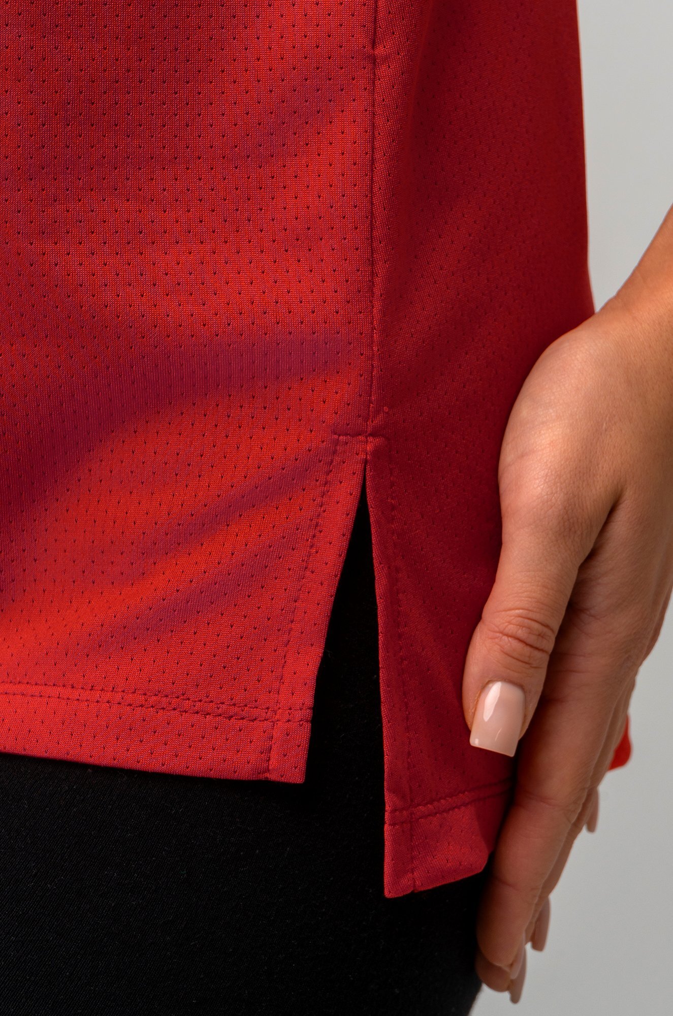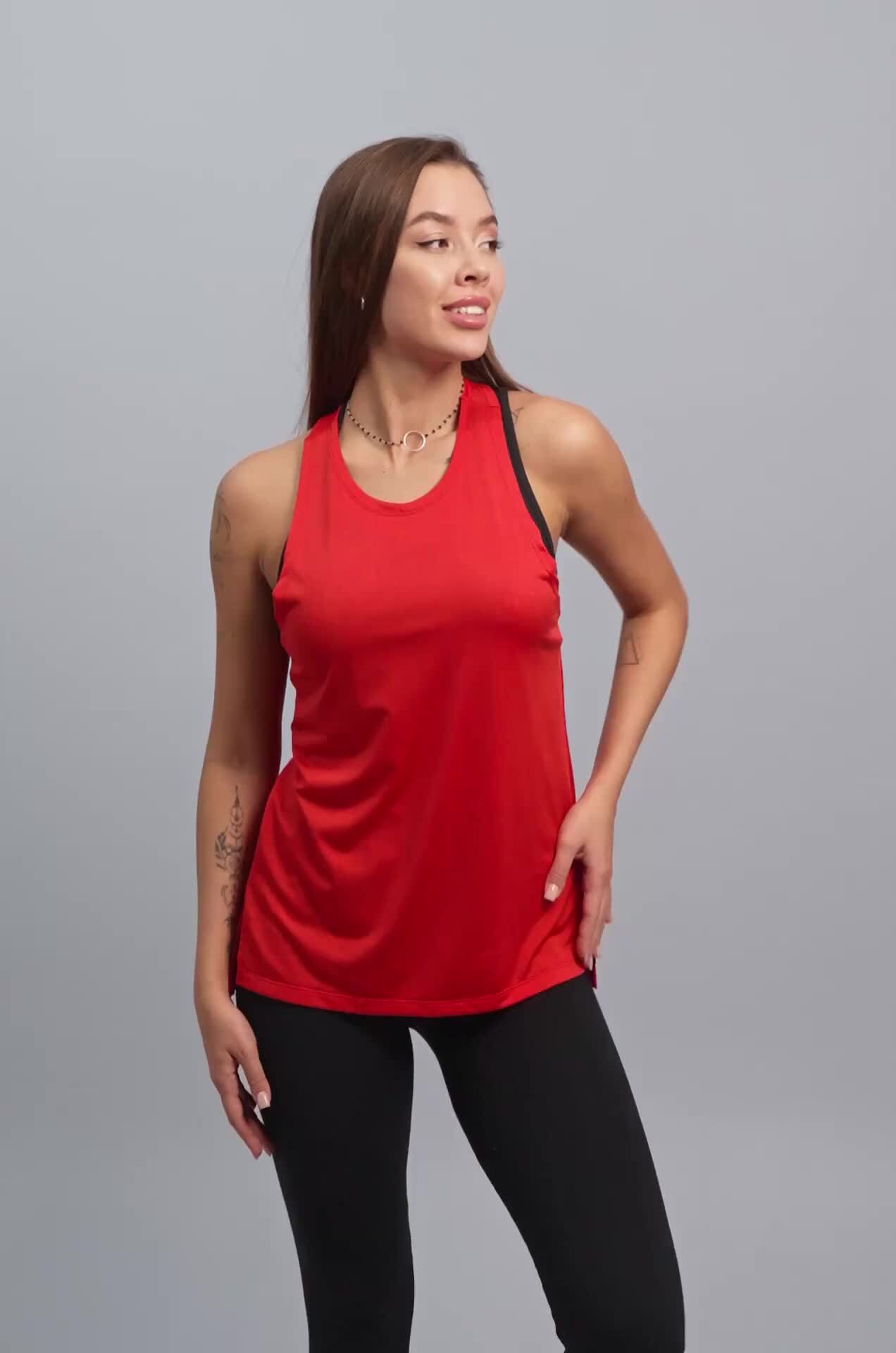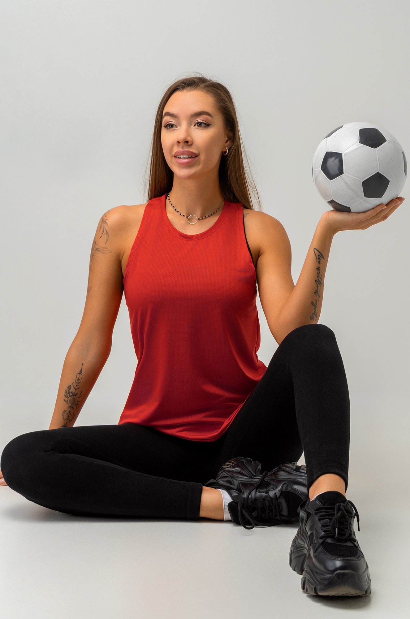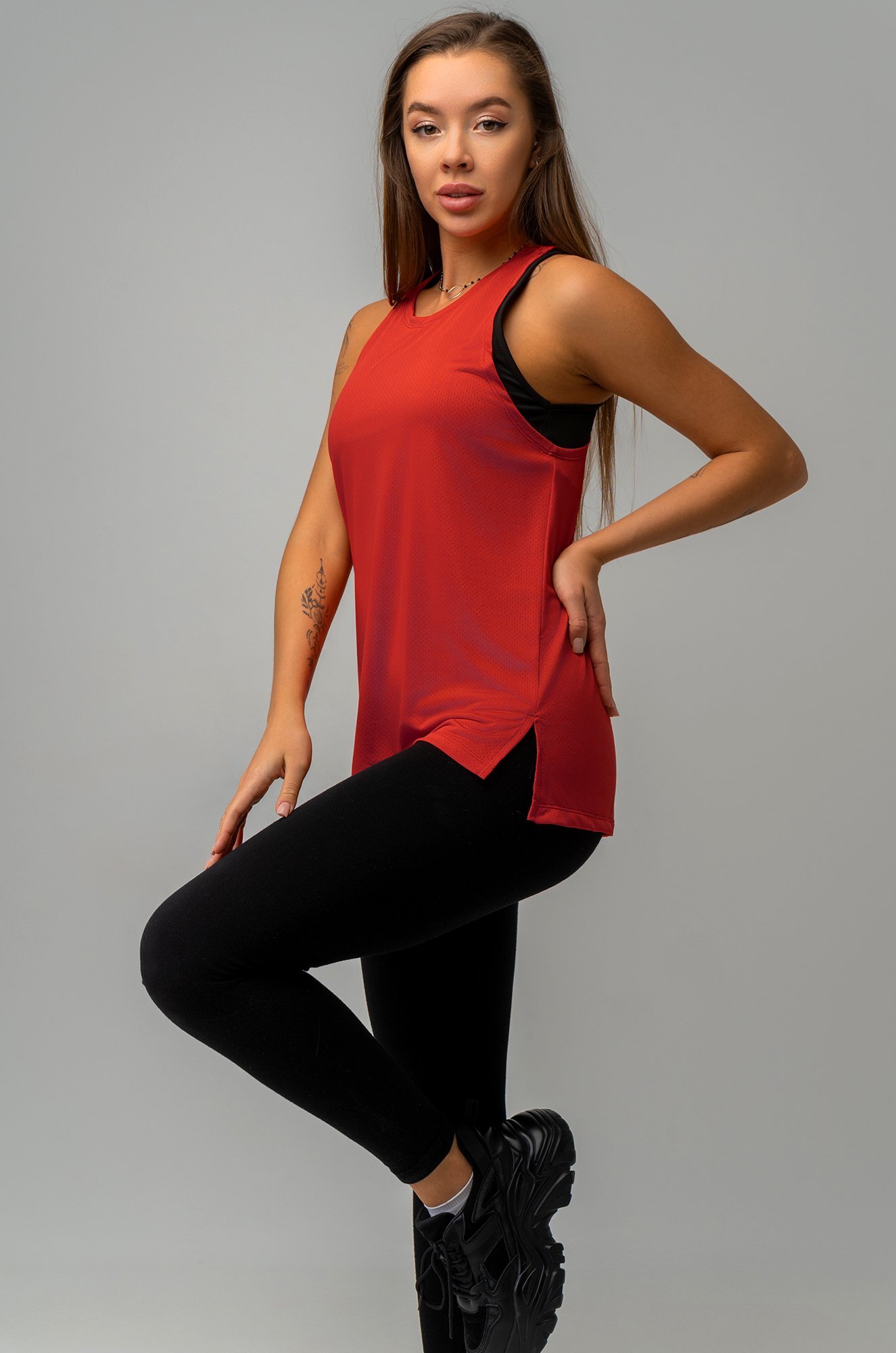 Красная майка-топ выполнена из перфорированной ткани – отличный вариант для спорта. Модель отлично пропускает воздух и отводит лишнюю влагу, позволяя сосредоточиться только на тренировочном процессе. Состав из 100% полиэстера придаёт майке прочность и исключительную легкость, что делает её идеальным выбором для активного образа жизни. Топ легко отстирывается в прохладной воде, быстро высыхает и почти не мнется.
