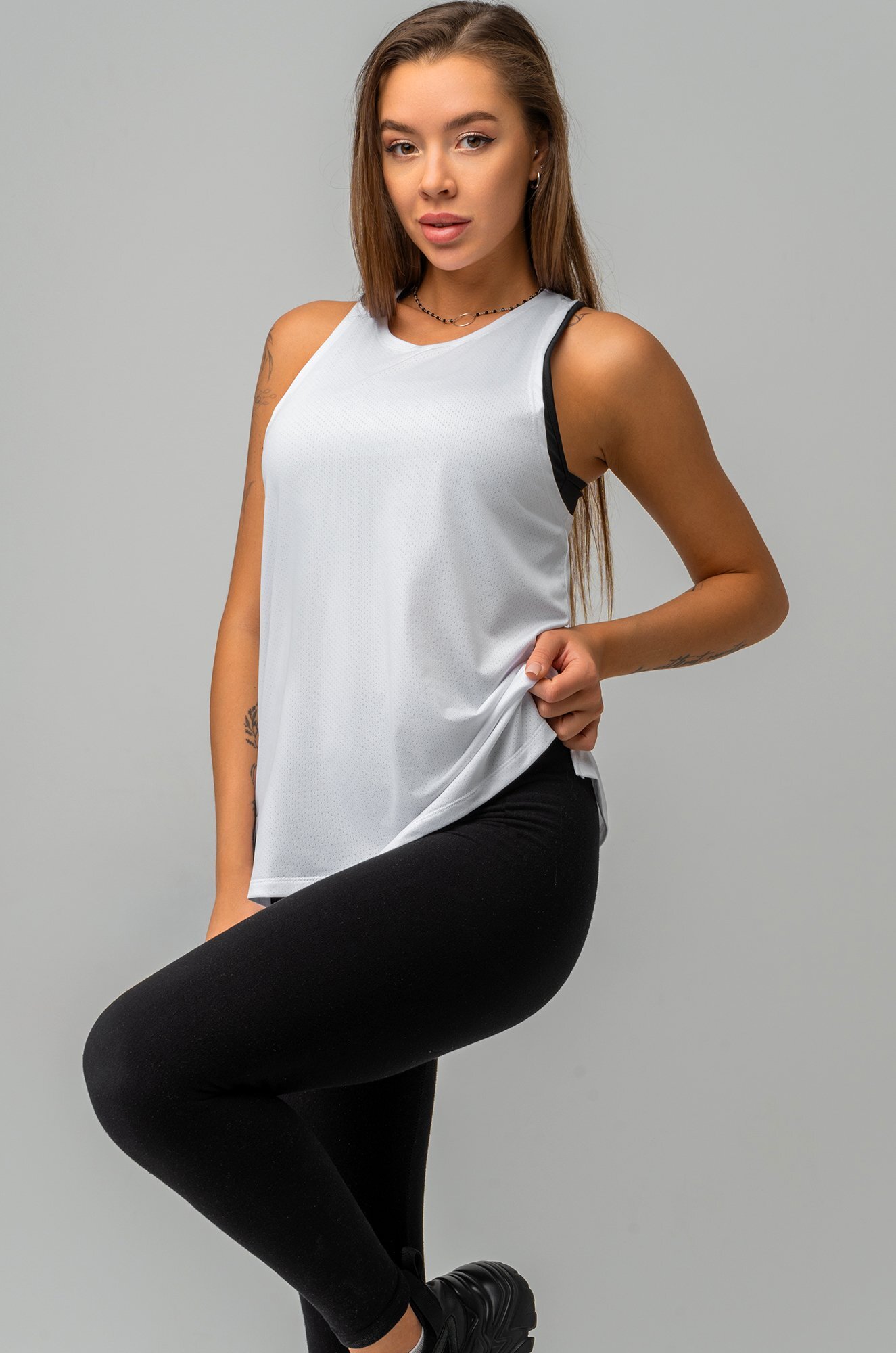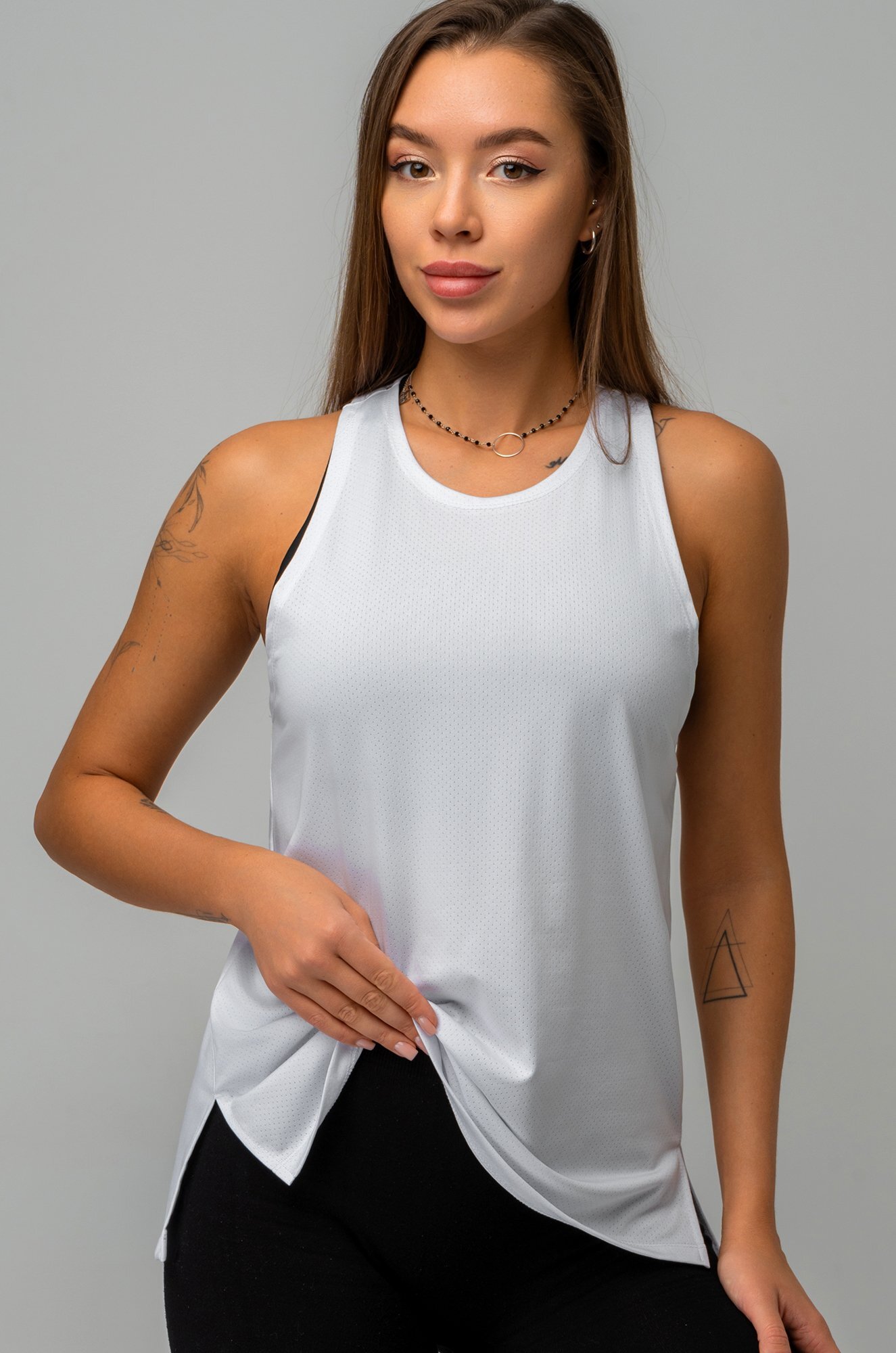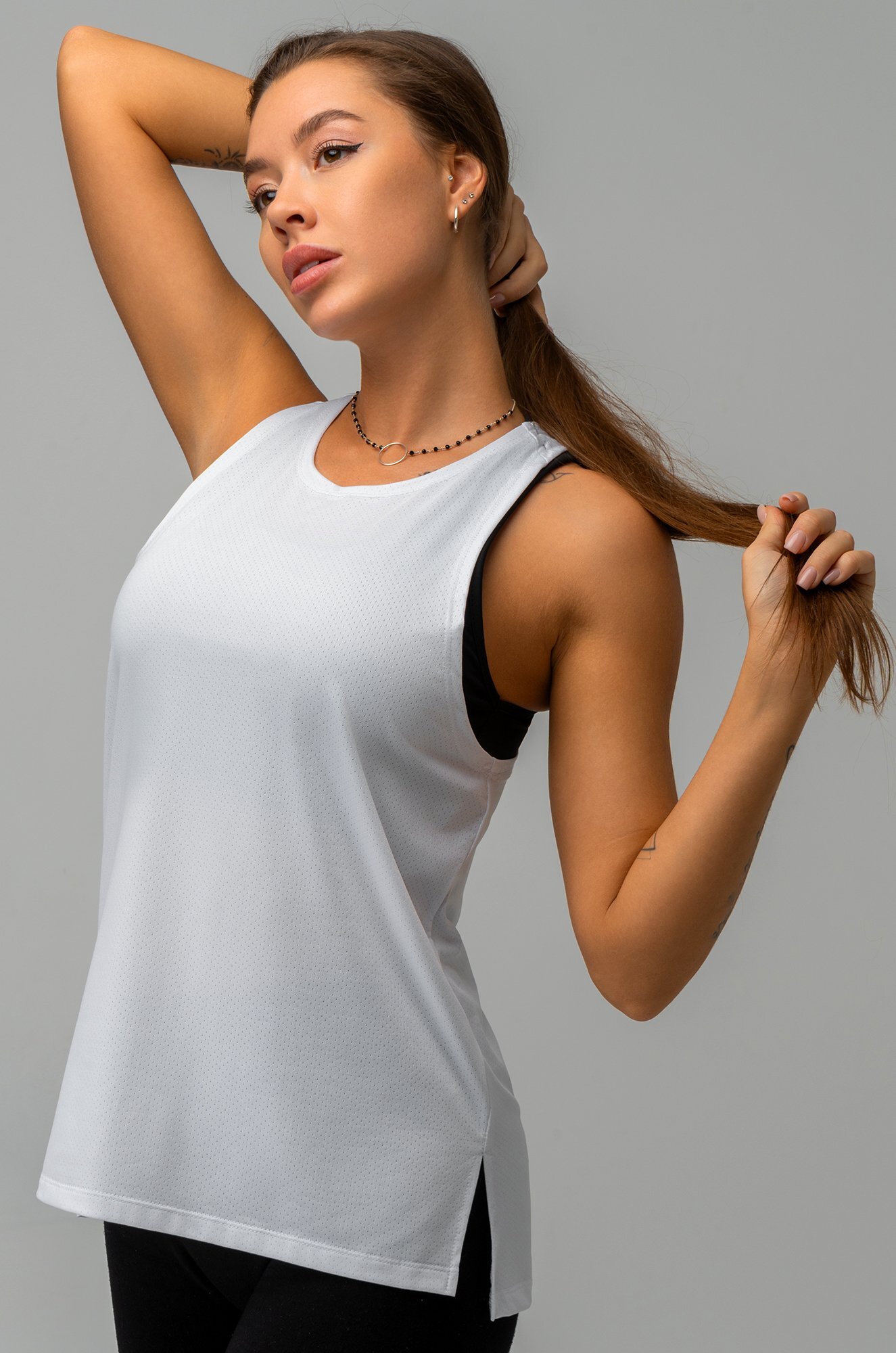 Белая майка-топ выполнена из перфорированной ткани – отличный вариант для спорта. Модель отлично пропускает воздух и отводит лишнюю влагу, позволяя сосредоточиться только на тренировочном процессе. Состав из 100% полиэстера придаёт майке прочность и исключительную легкость, что делает её идеальным выбором для активного образа жизни. Топ легко отстирывается в прохладной воде, быстро высыхает и почти не мнется.