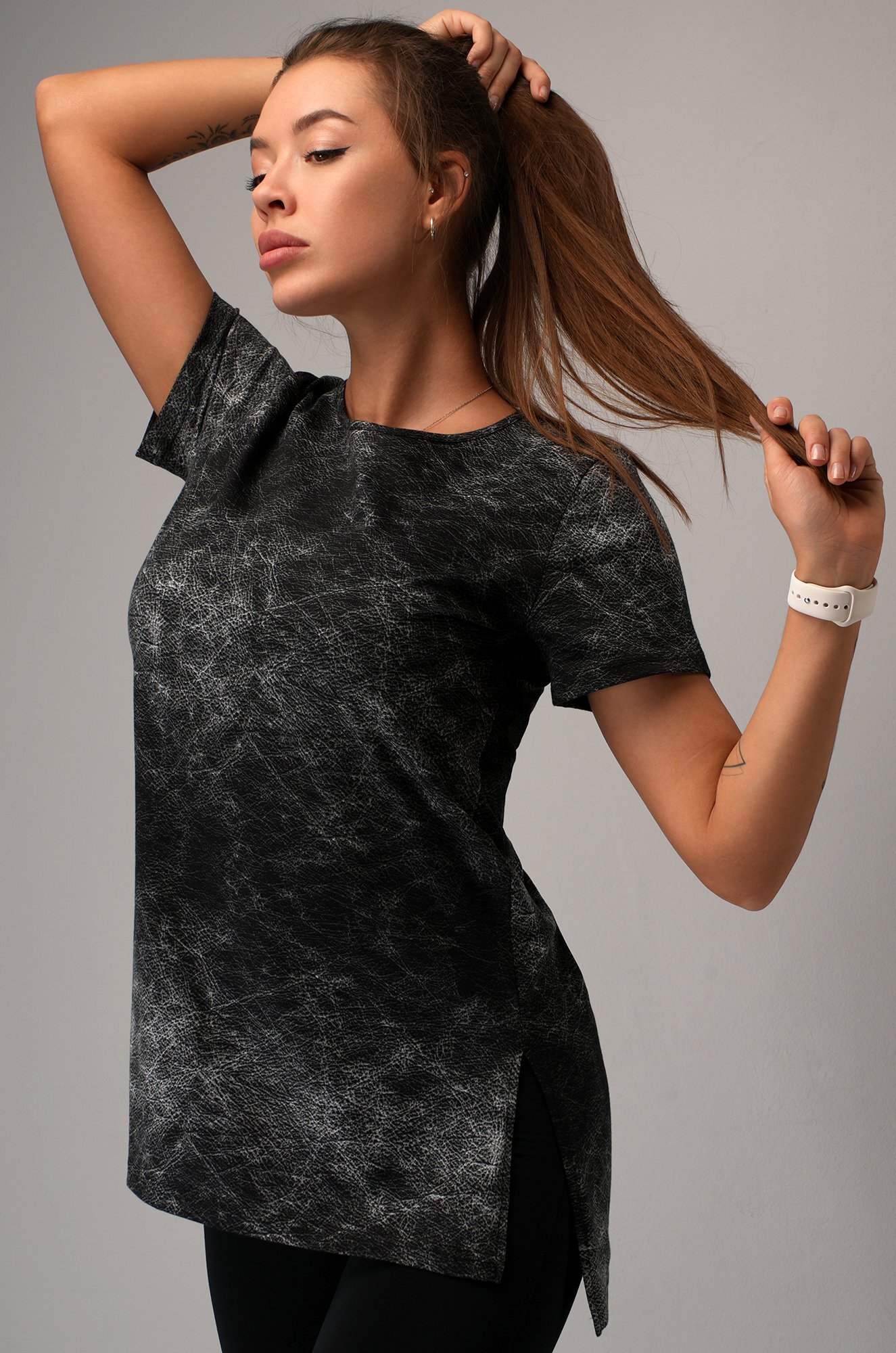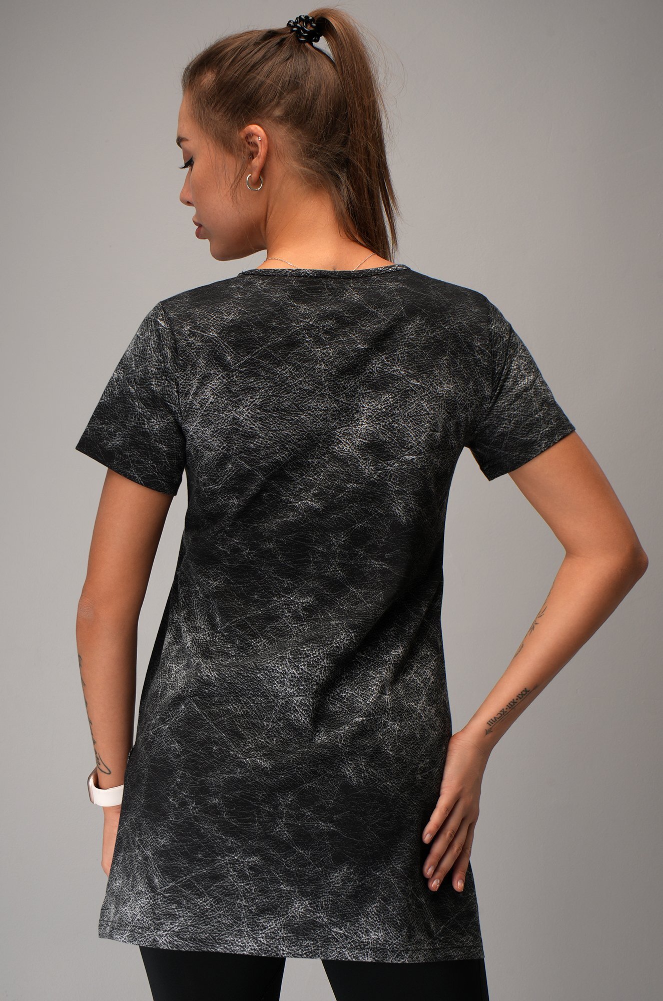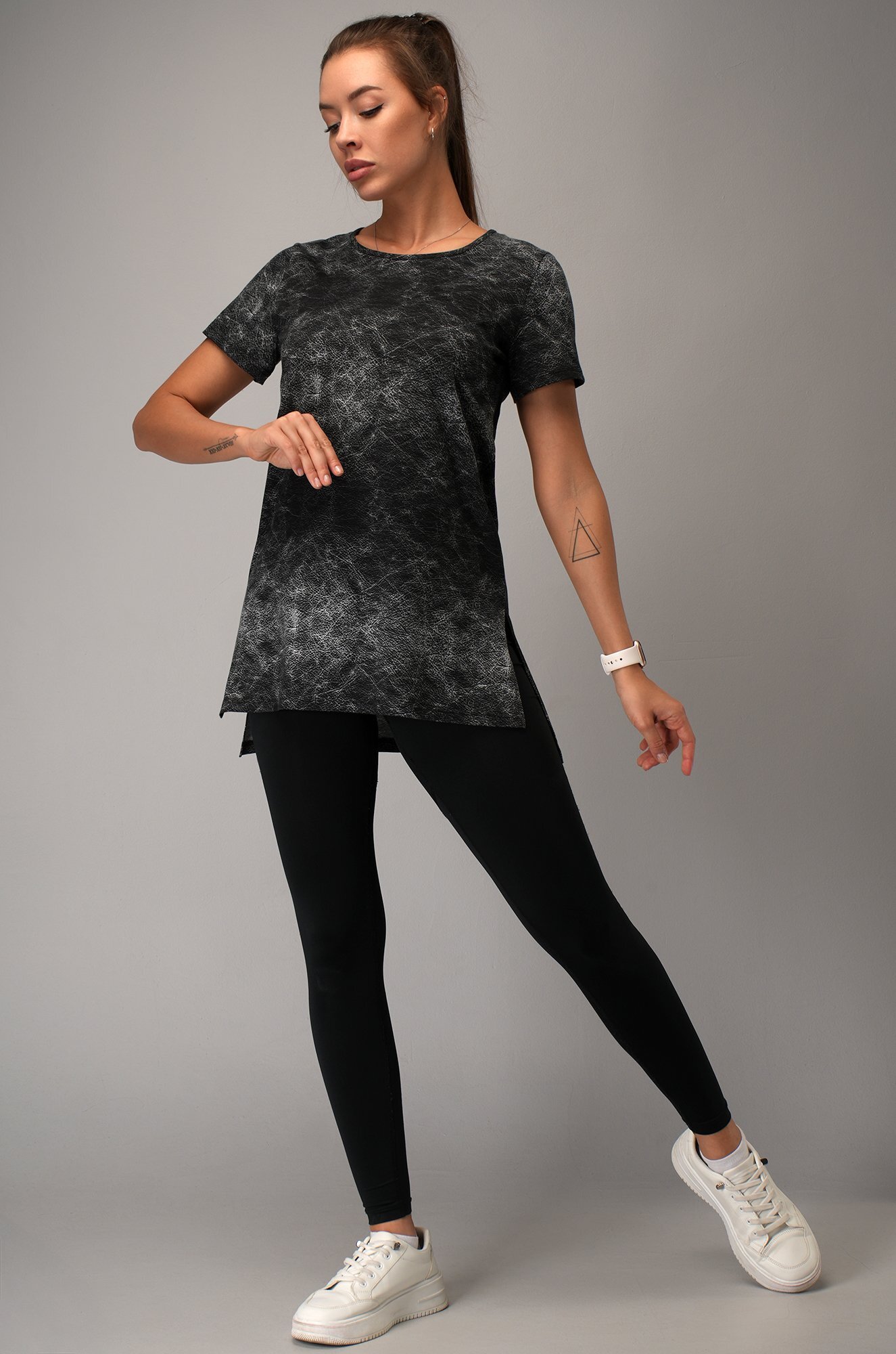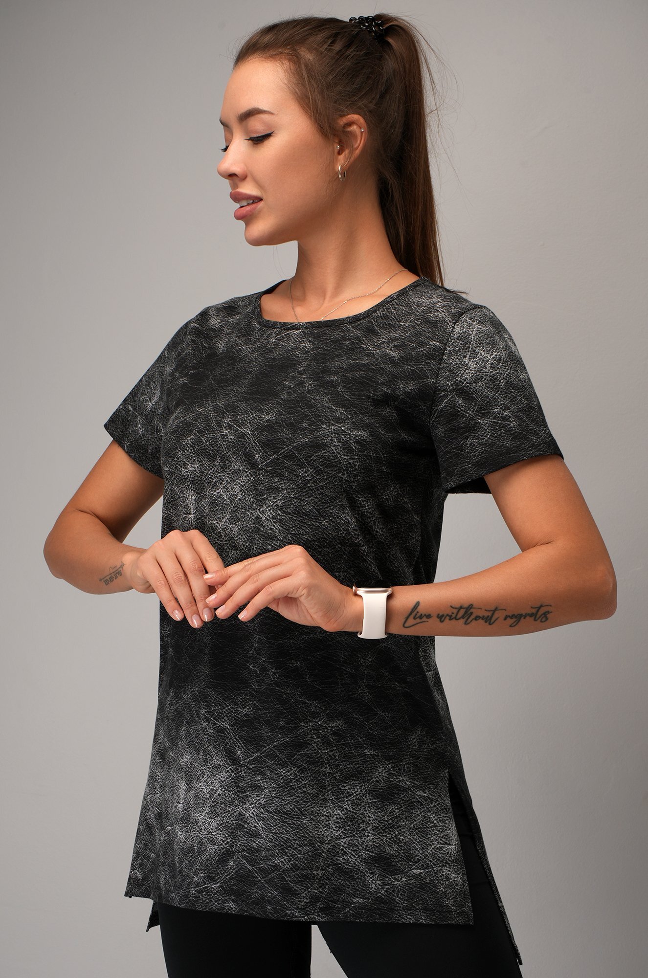 Женская футболка черного цвета с оригинальным эффектом потертости создана, чтобы дарить уют каждый день. Длинная и слегка приталенная модель подчеркивает фигуру и дарит комфортную посадку. Хлопковая туника станет любимицей как для дома, так и для прогулок.