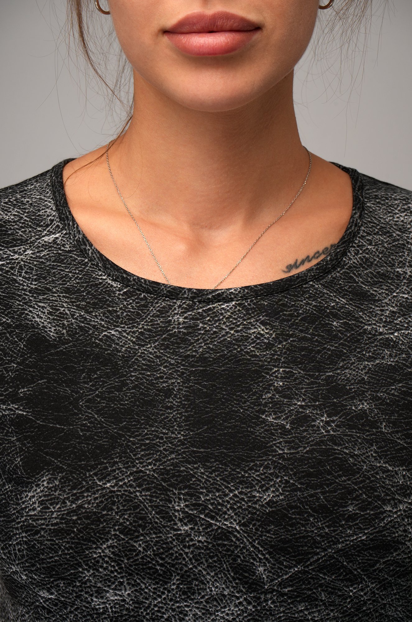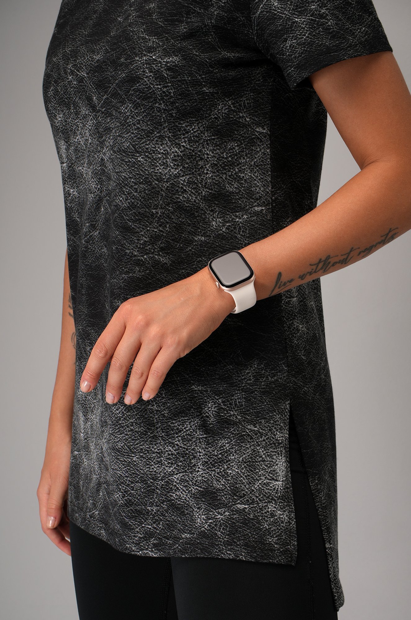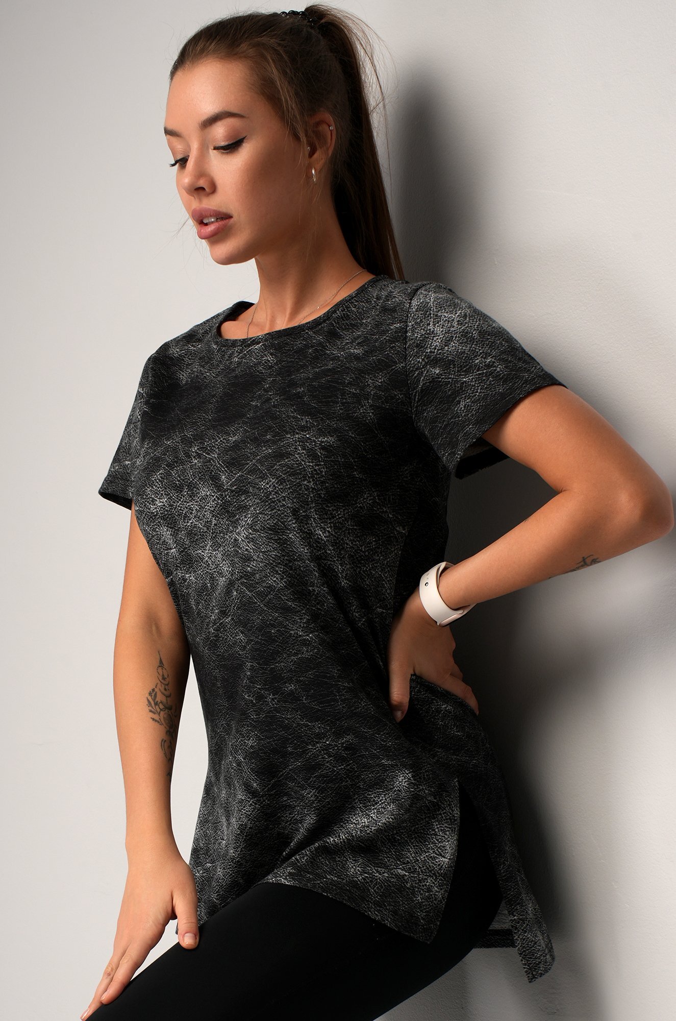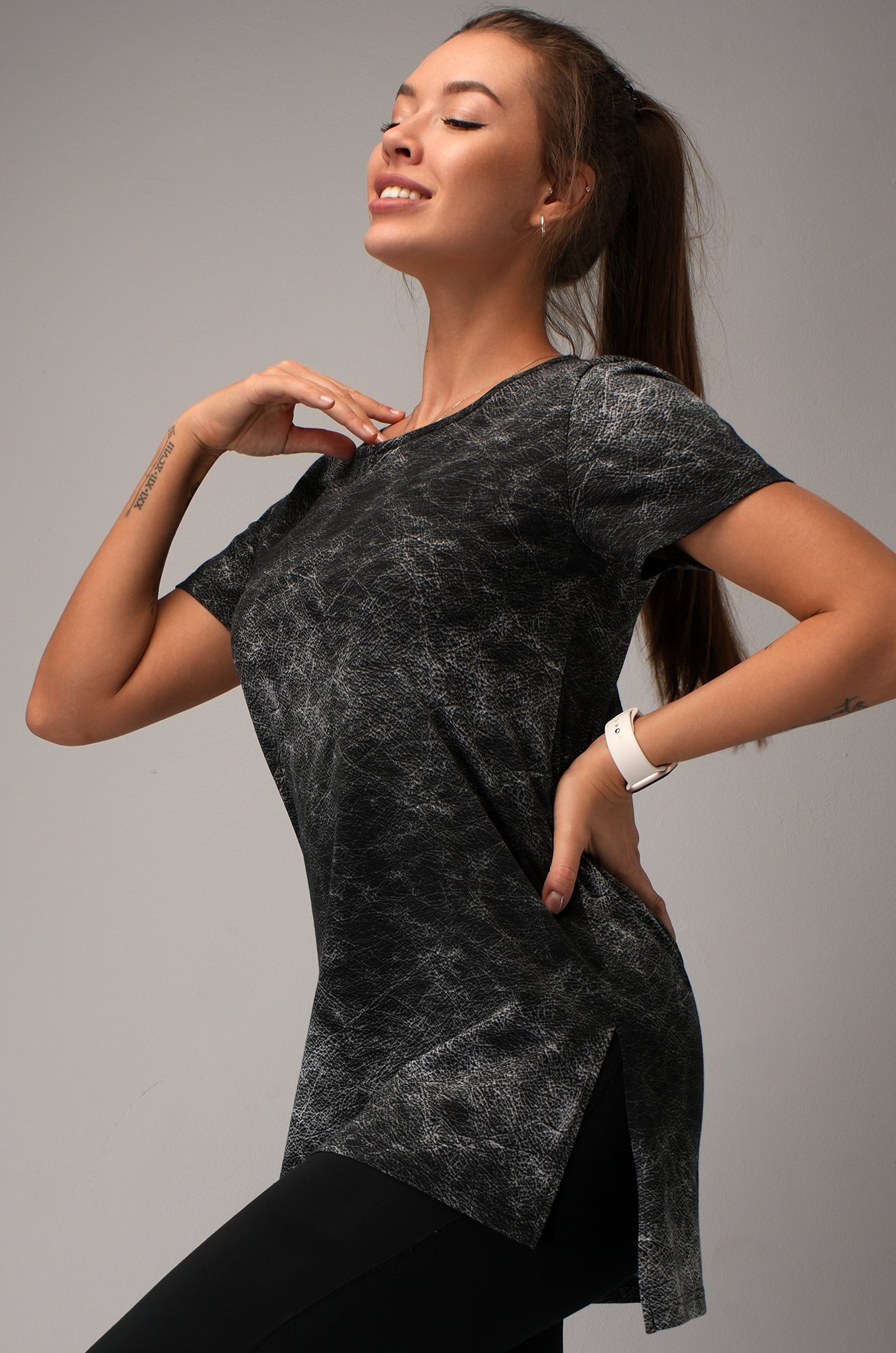 Женская футболка черного цвета с оригинальным эффектом потертости создана, чтобы дарить уют каждый день. Длинная и слегка приталенная модель подчеркивает фигуру и дарит комфортную посадку. Хлопковая туника станет любимицей как для дома, так и для прогулок.