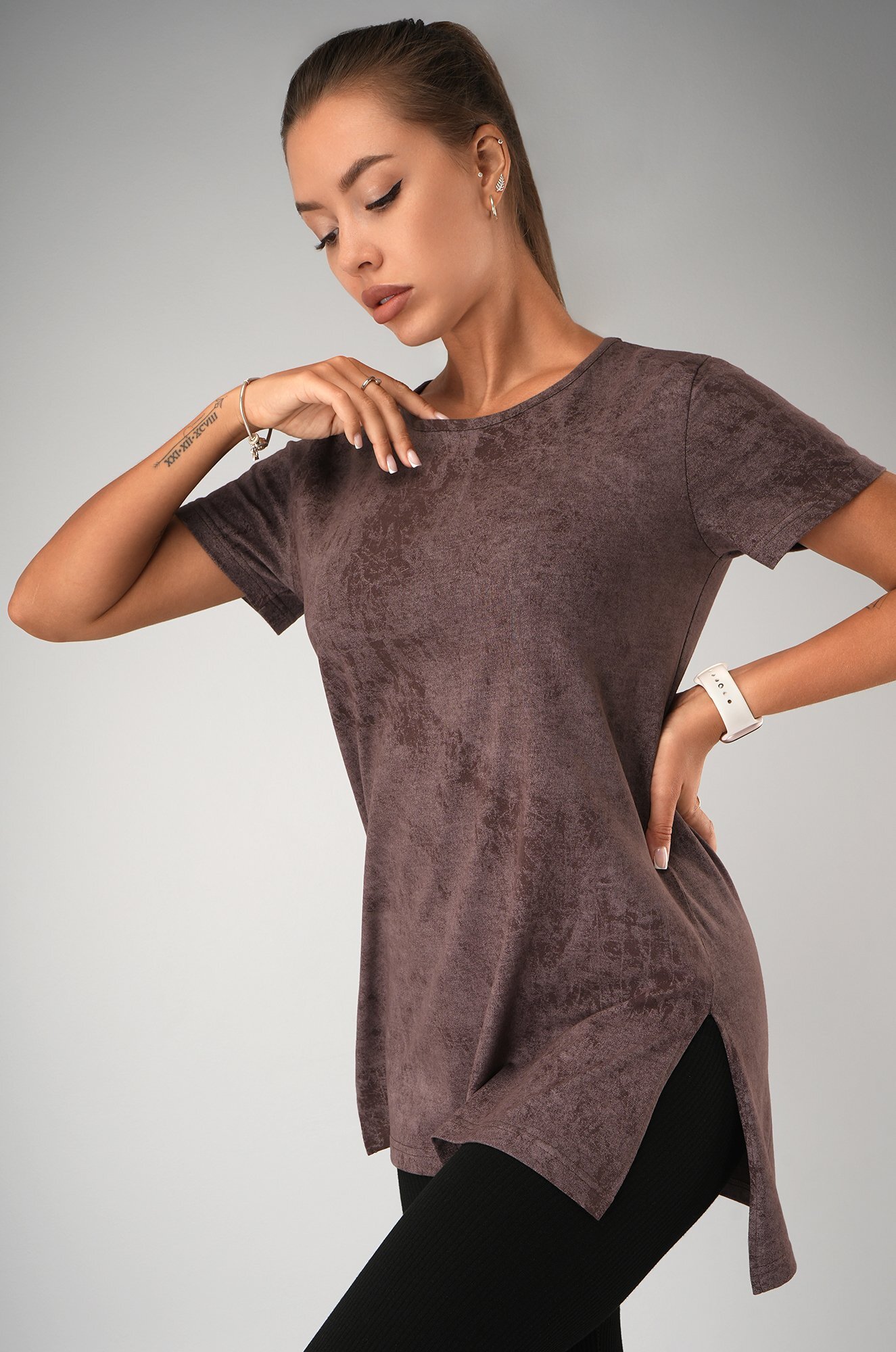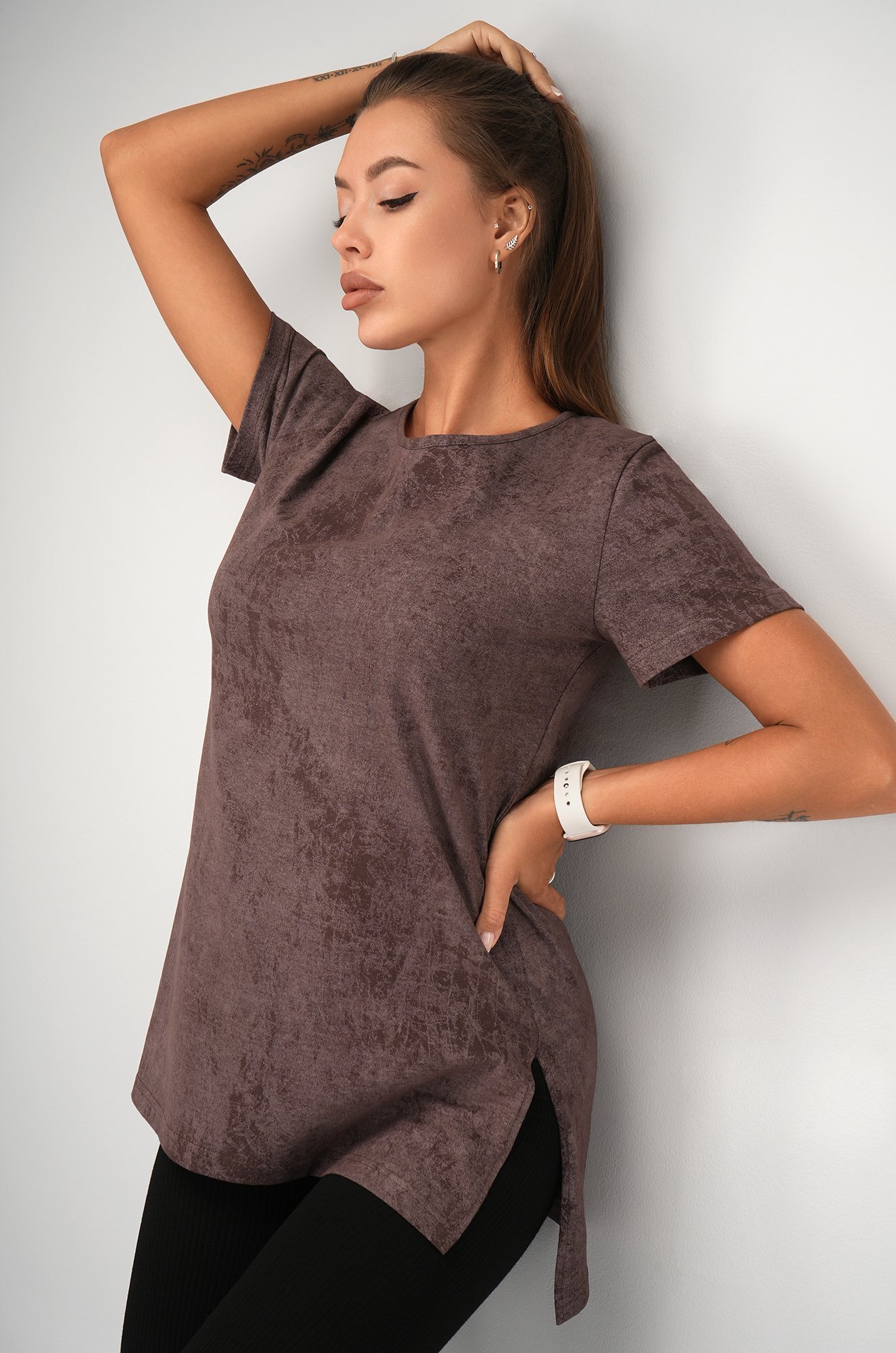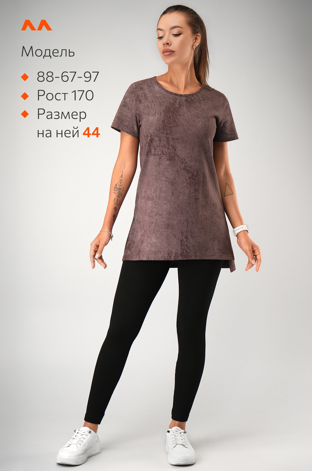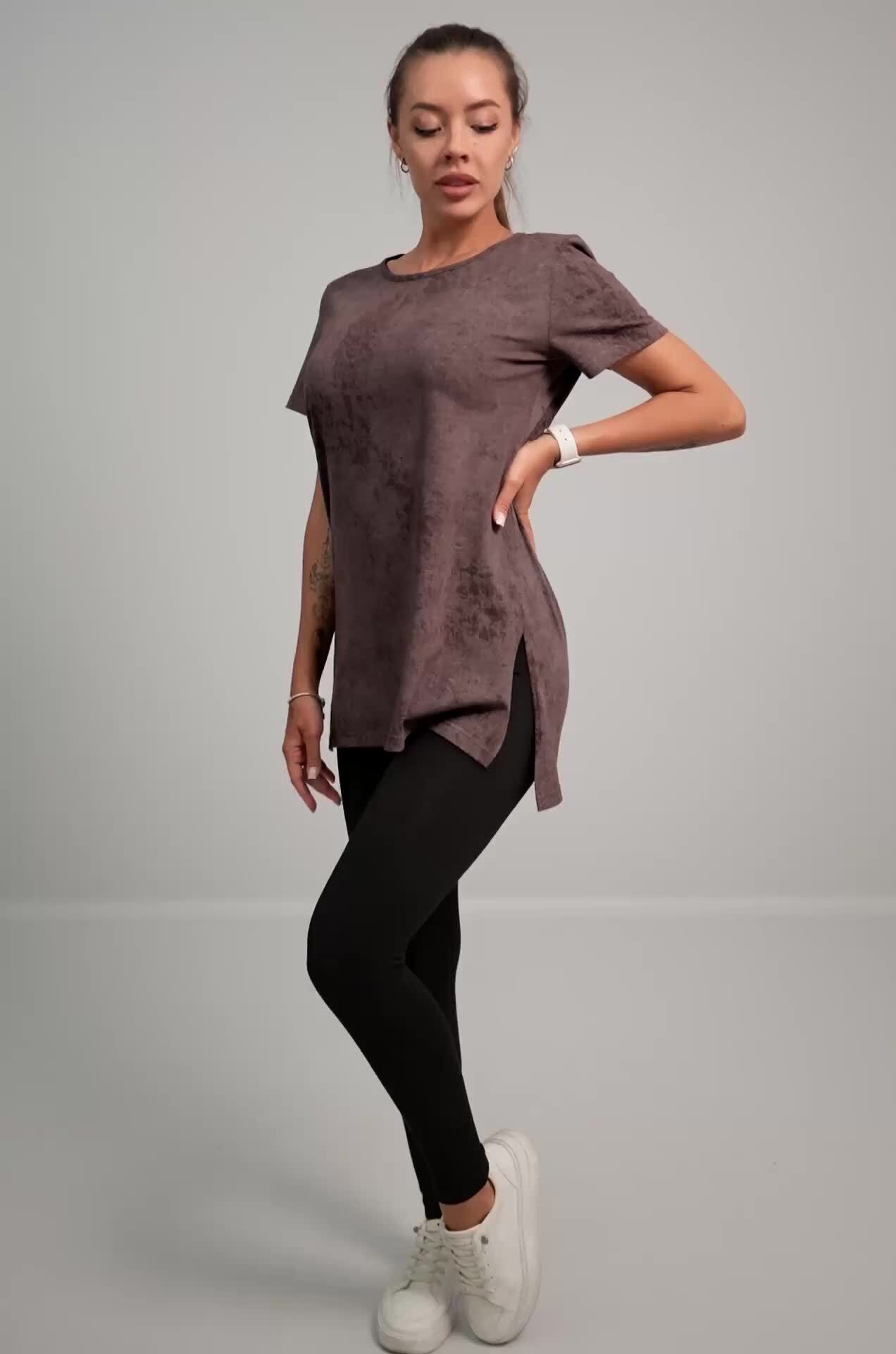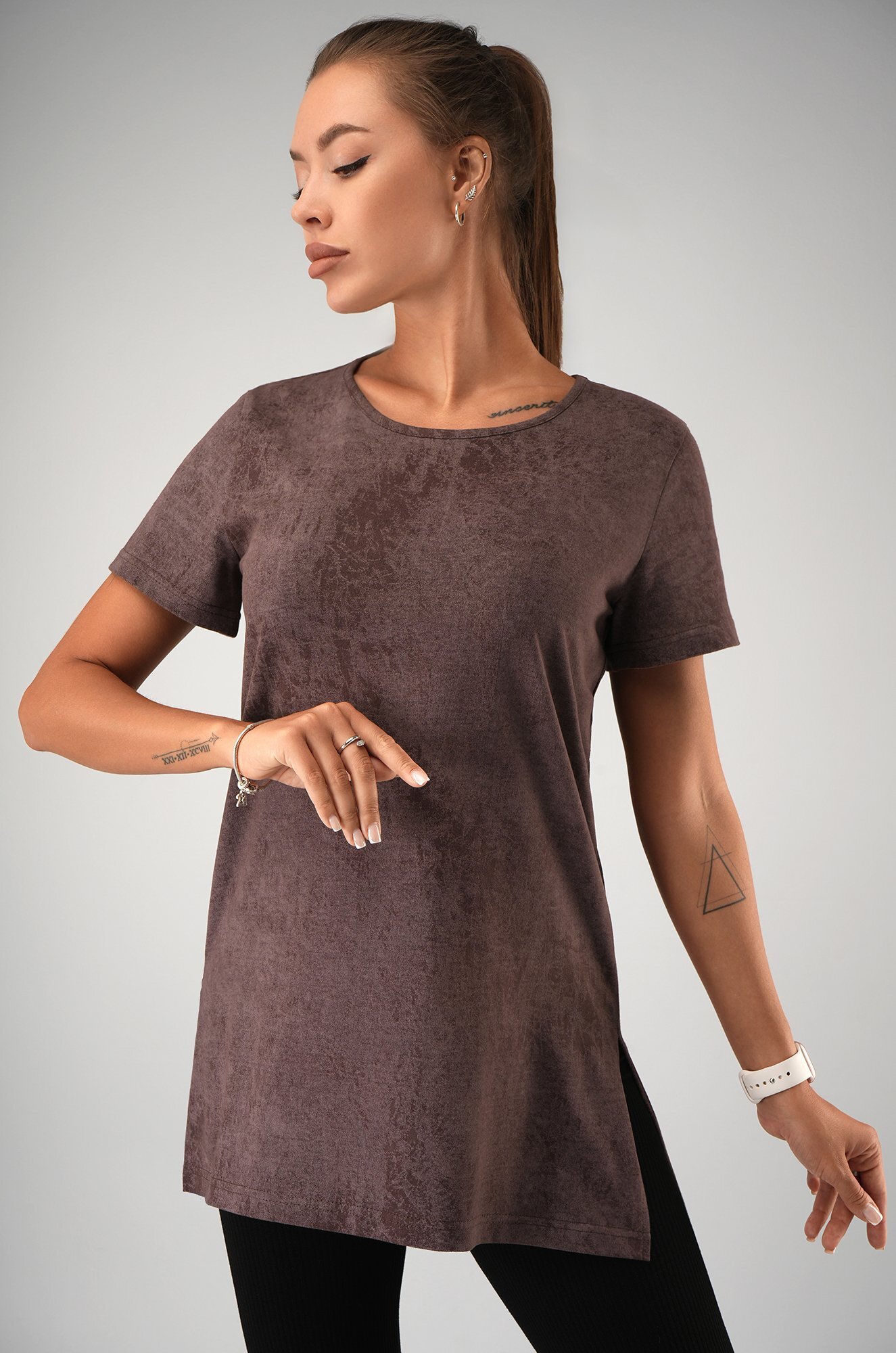 Женская футболка-туника с эффектом варенка – стильное решение для лета. Выполнена из мягкого 100% хлопка в шоколадном оттенке с уникальной текстурой легкой потертости.