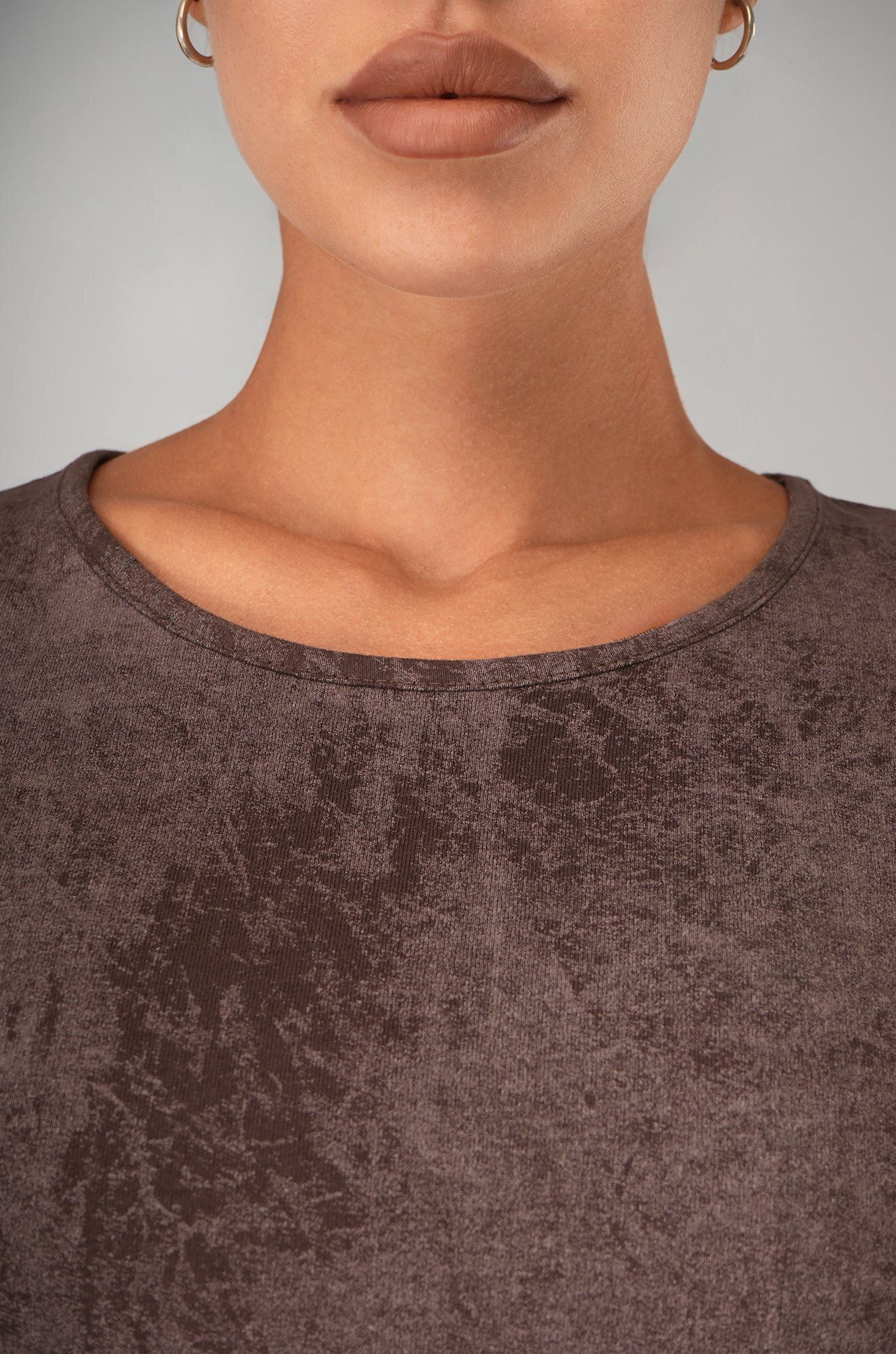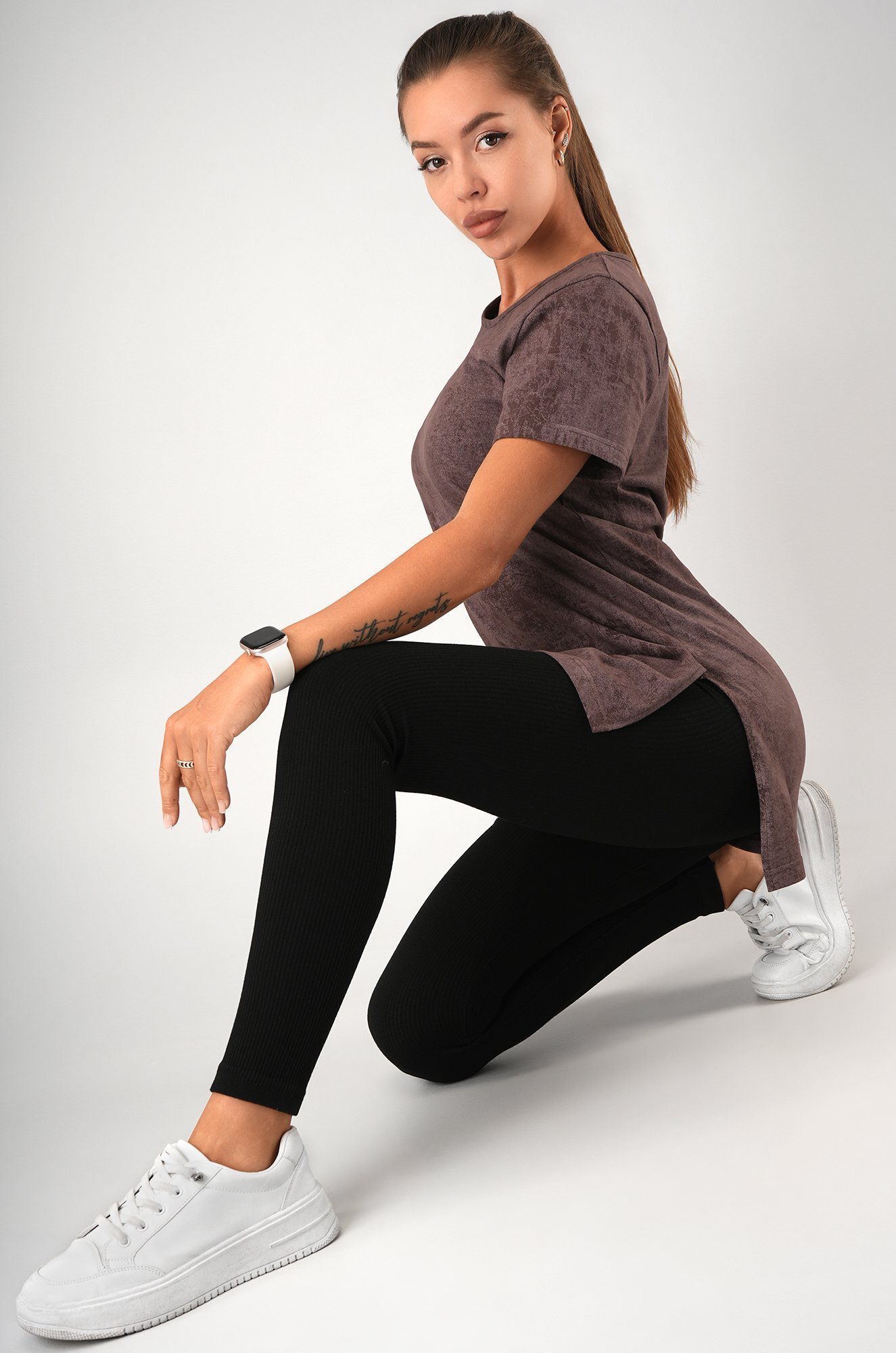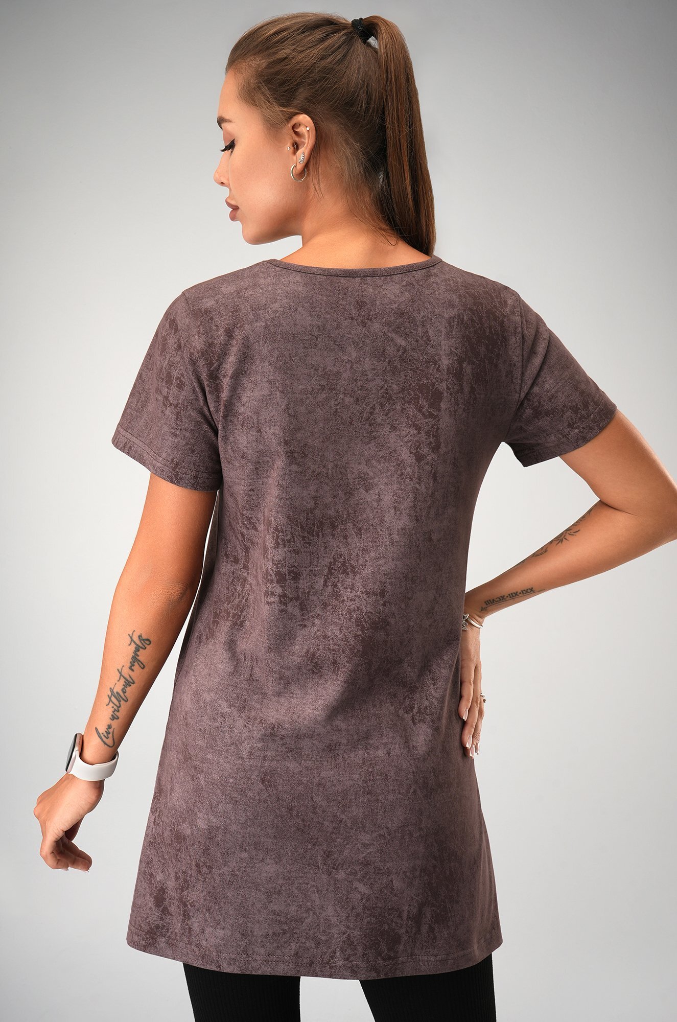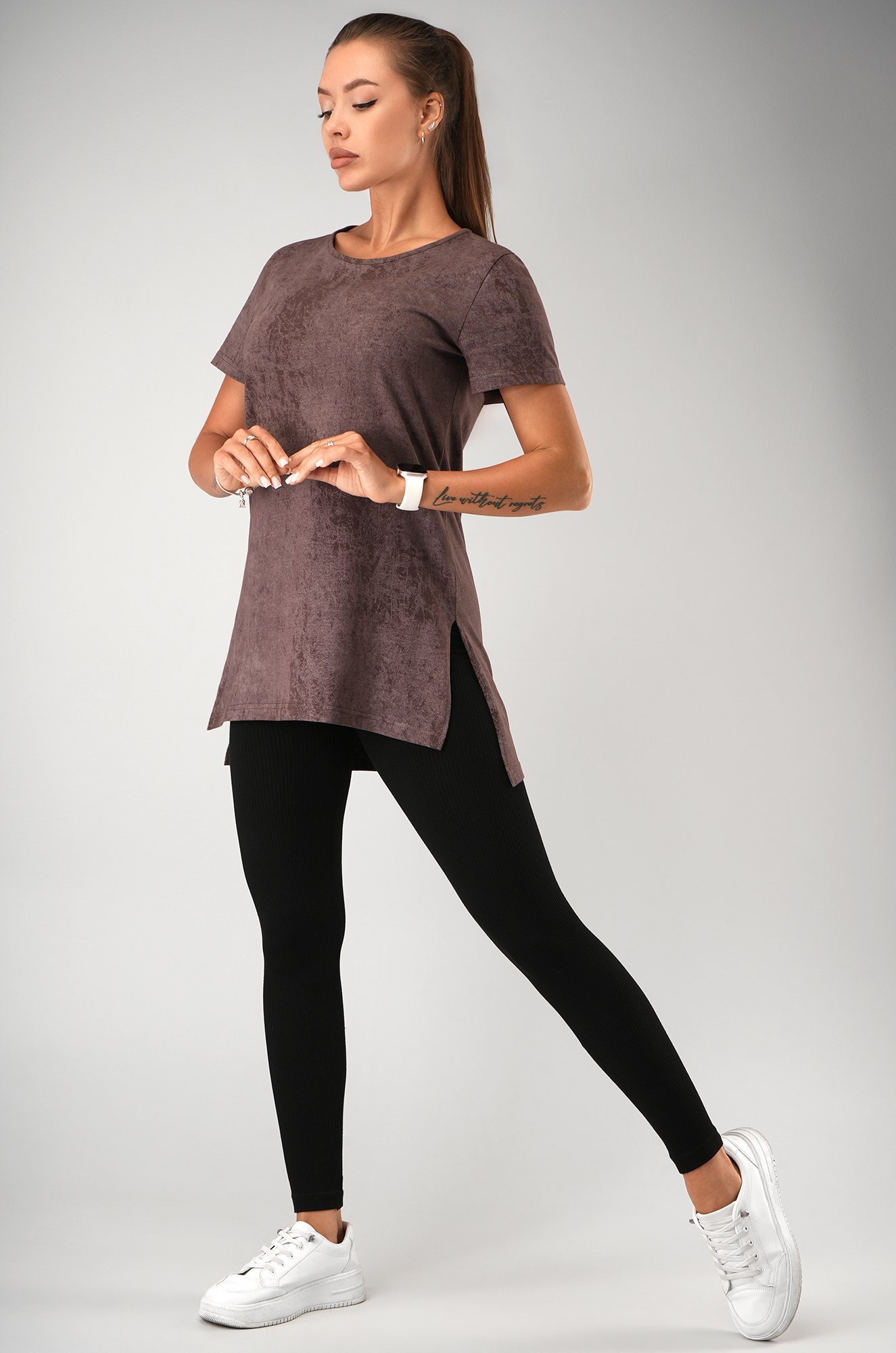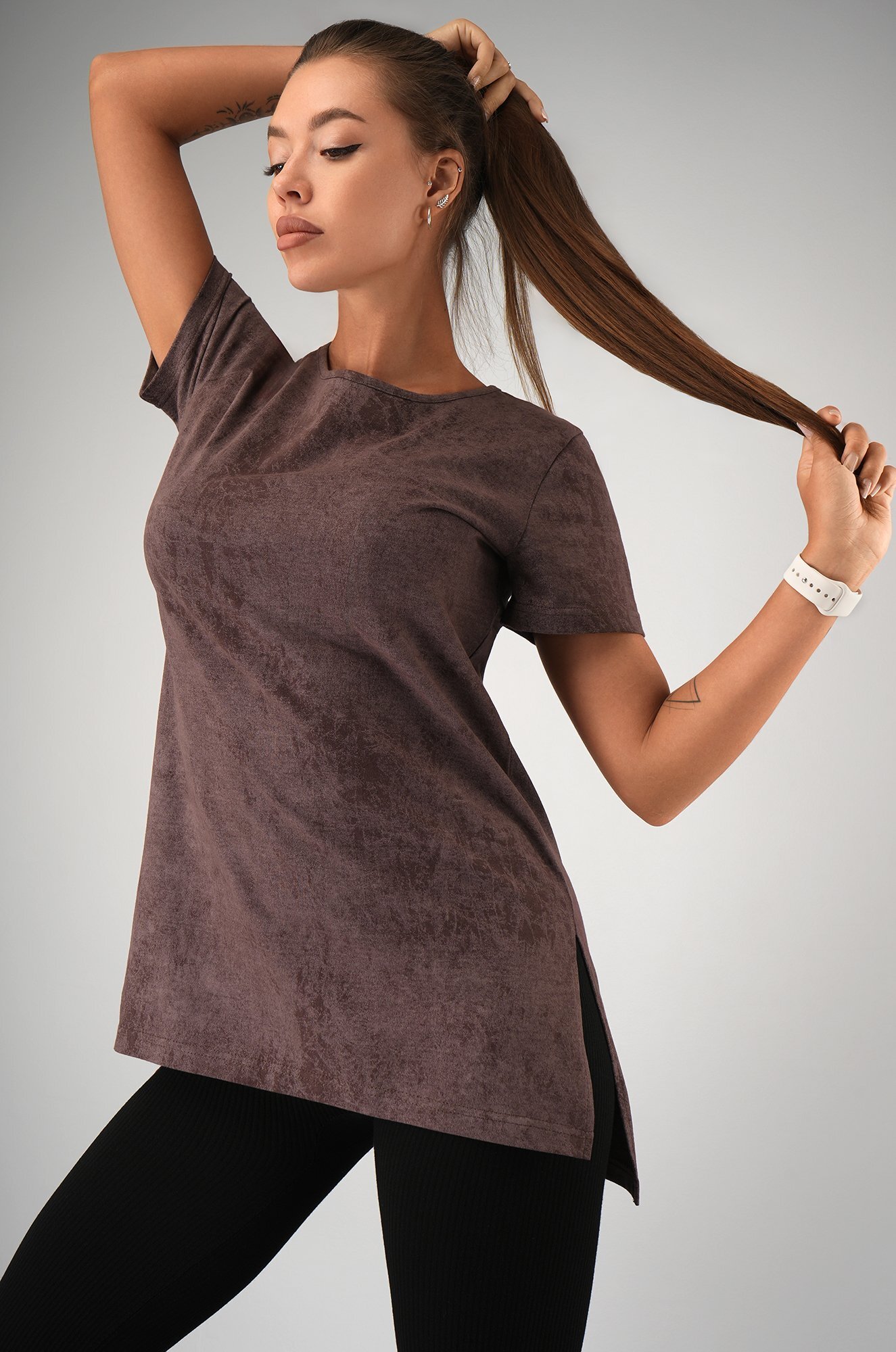 Женская футболка-туника с эффектом варенка – стильное решение для лета. Выполнена из мягкого 100% хлопка в шоколадном оттенке с уникальной текстурой легкой потертости.