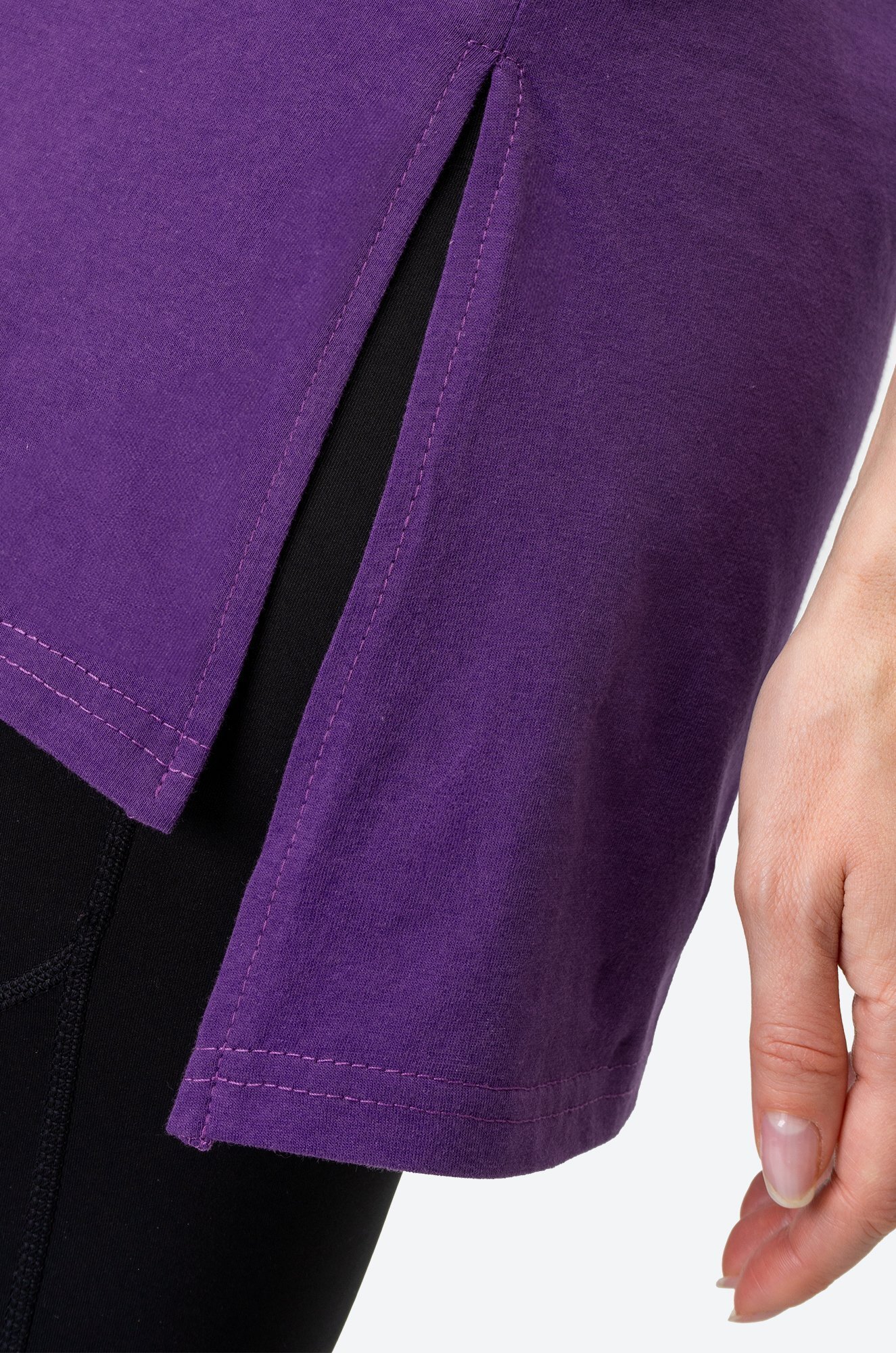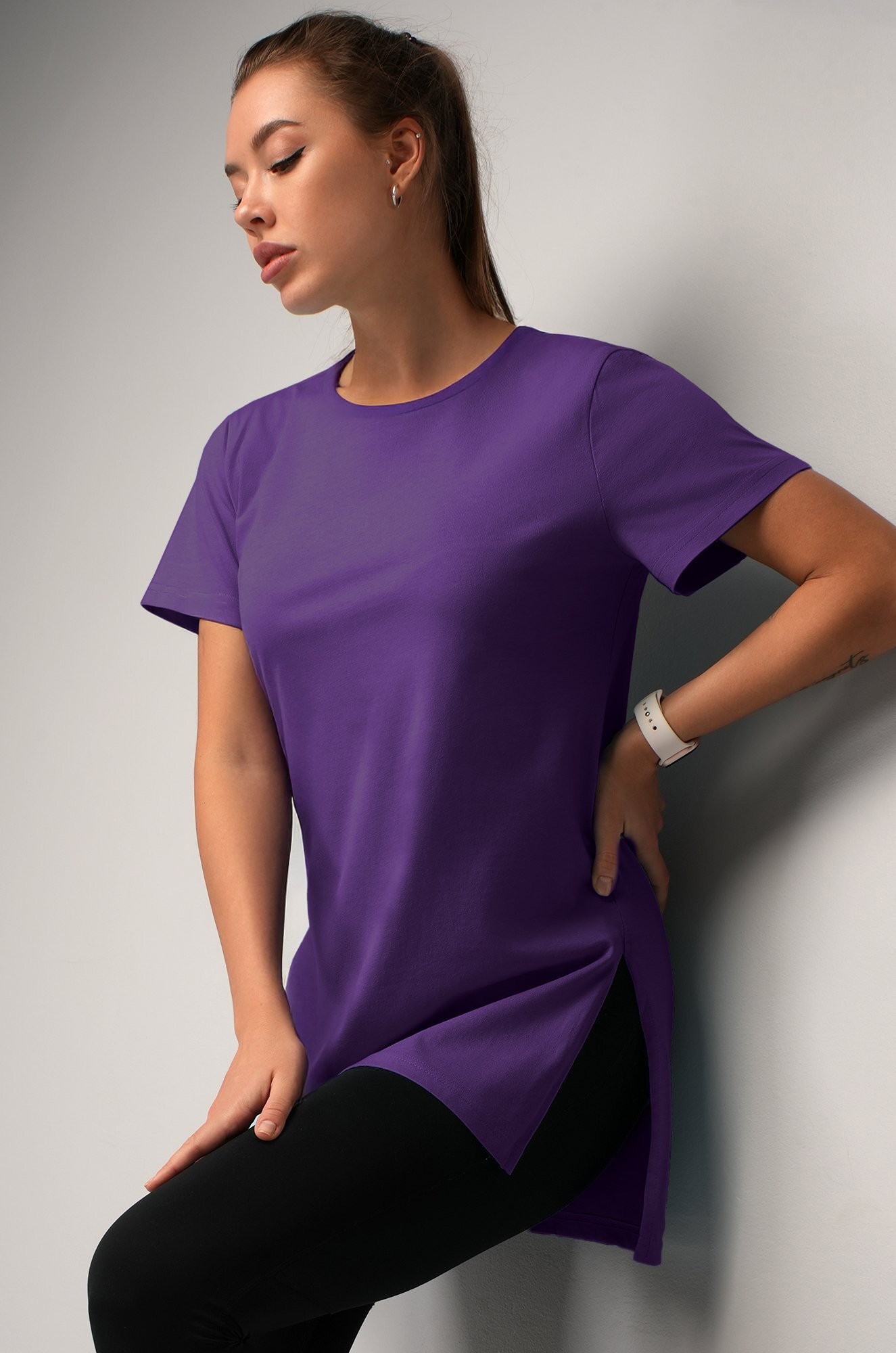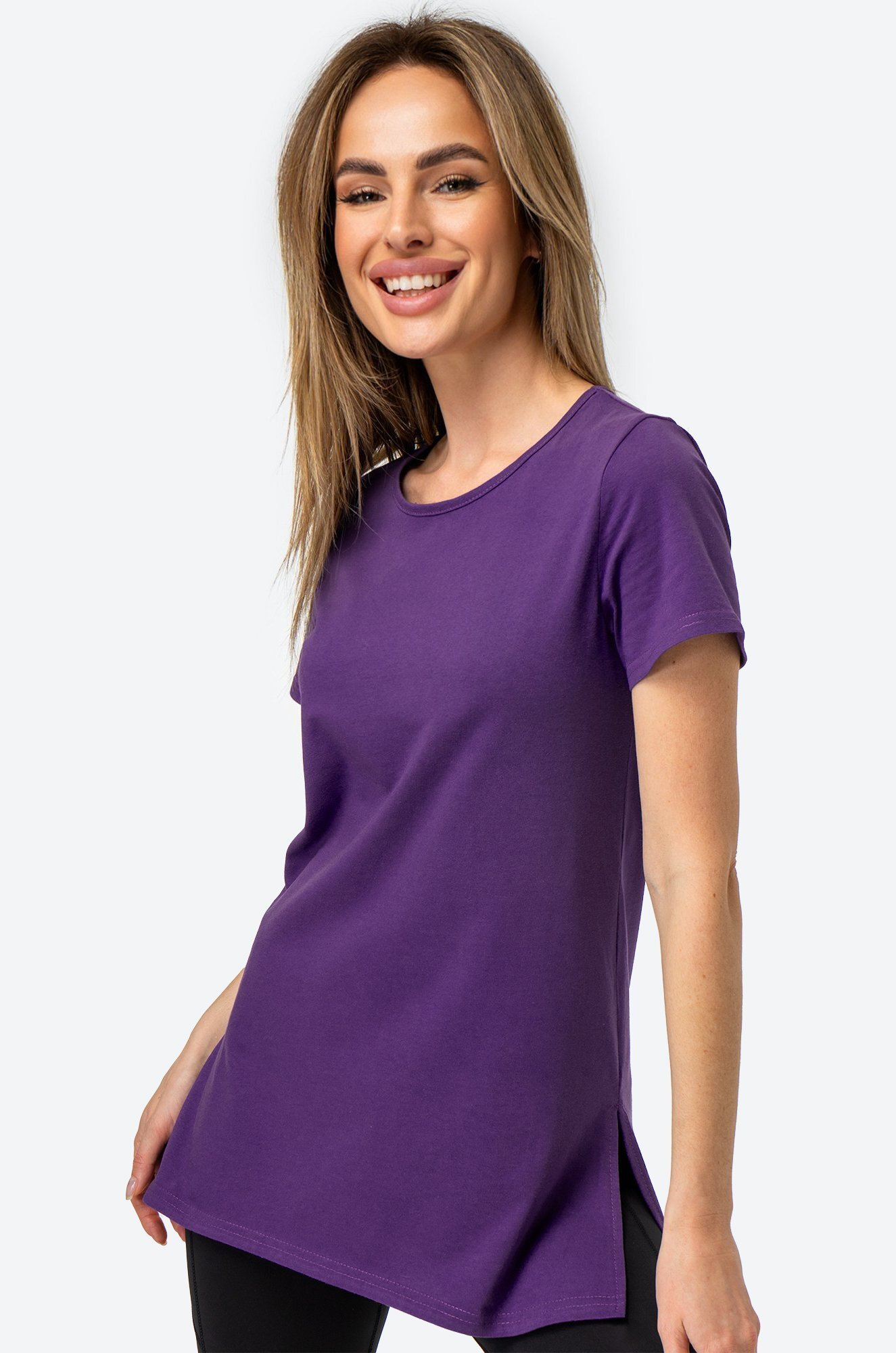 Женская футболка фиолетового цвета создана, чтобы дарить уют каждый день. Длинная и слегка приталенная модель подчеркивает фигуру и дарит комфортную посадку. Хлопковая туника станет любимицей как для дома, так и для прогулок.
