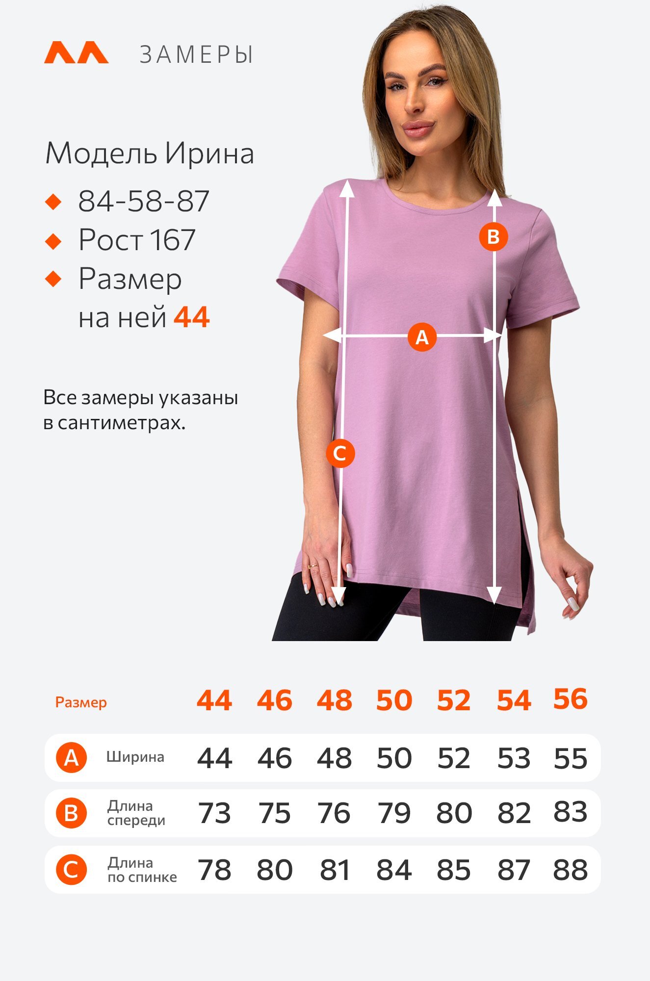 Размер 44: длина спереди:73 см; длина по спинке: 78 см; ширина:44 см.