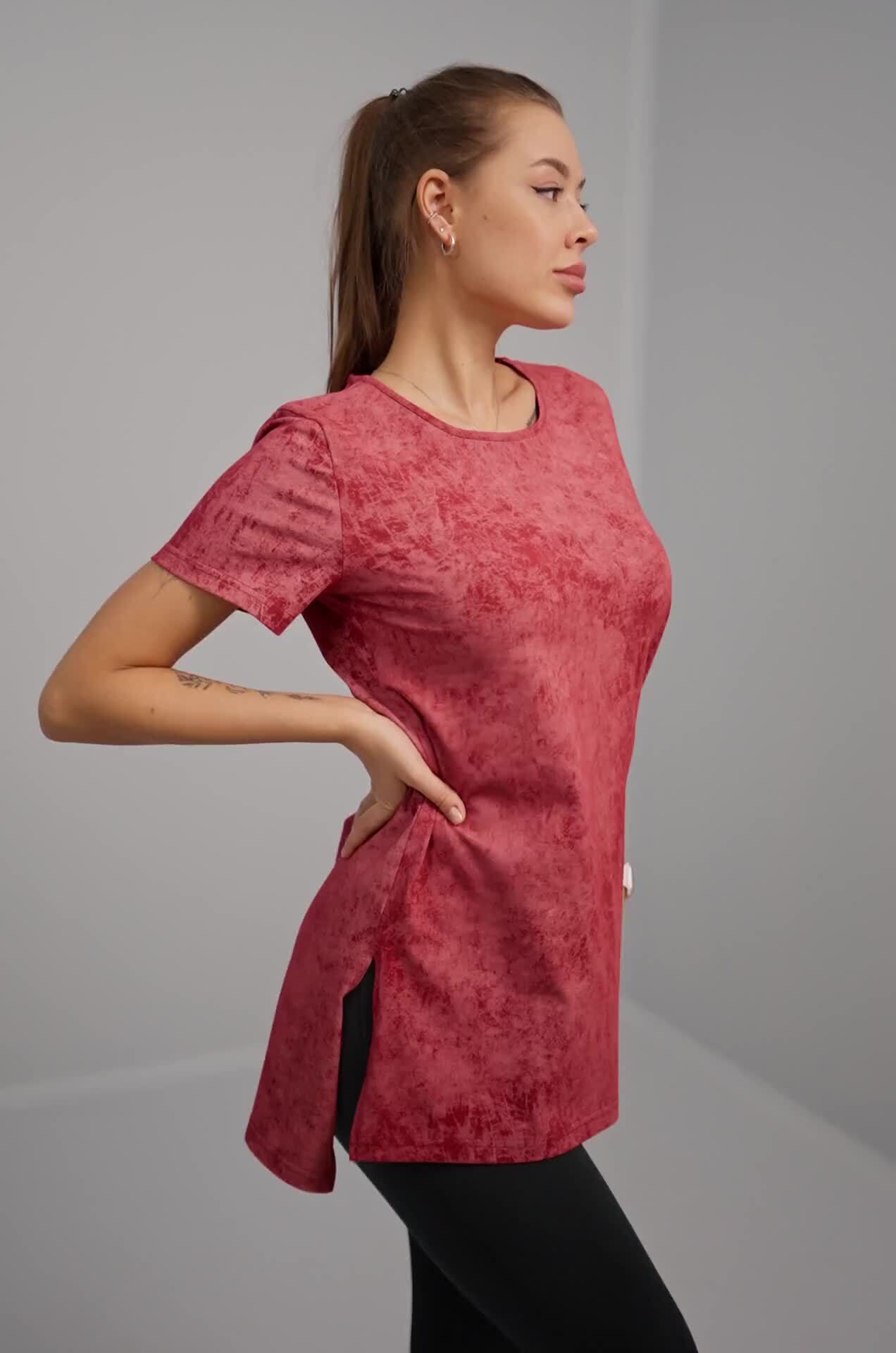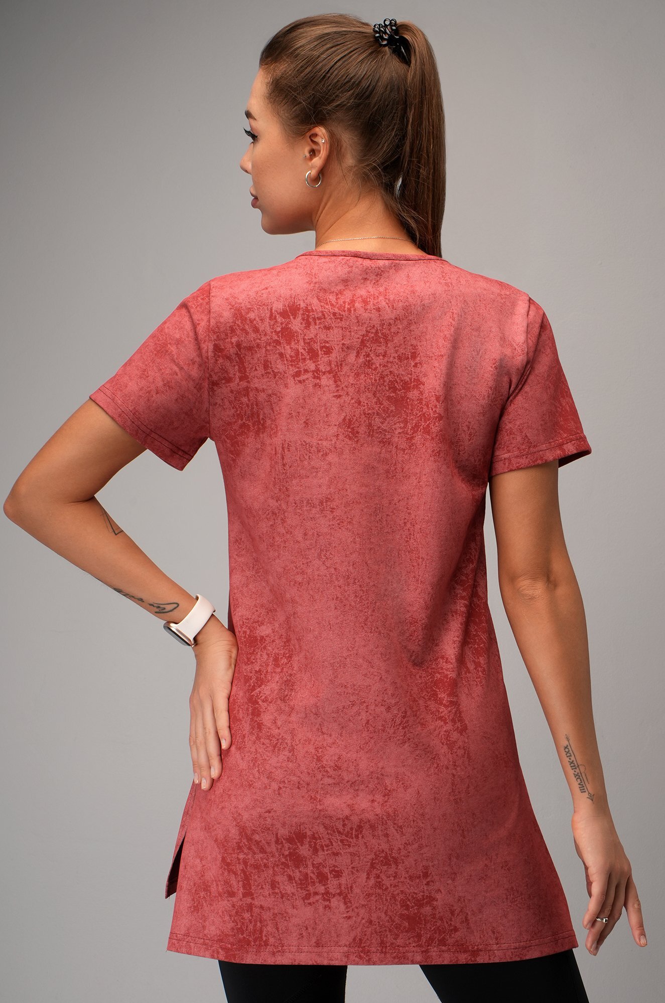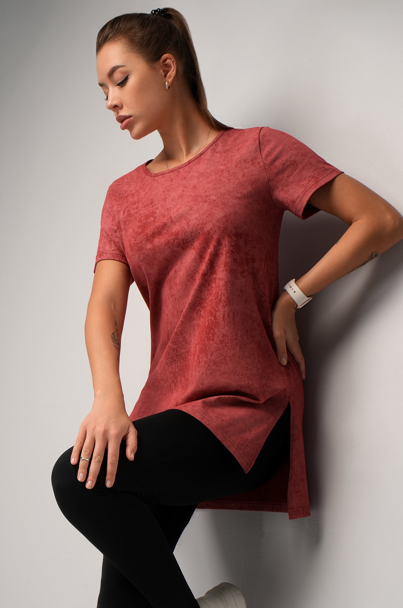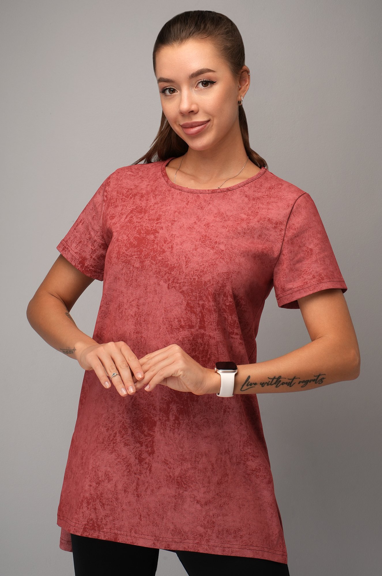 Женская футболка красного цвета с винтажным эффектом создана, чтобы дарить уют каждый день. Длинная и слегка приталенная модель подчеркивает фигуру и дарит комфортную посадку. Хлопковая туника станет любимицей как для дома, так и для прогулок.