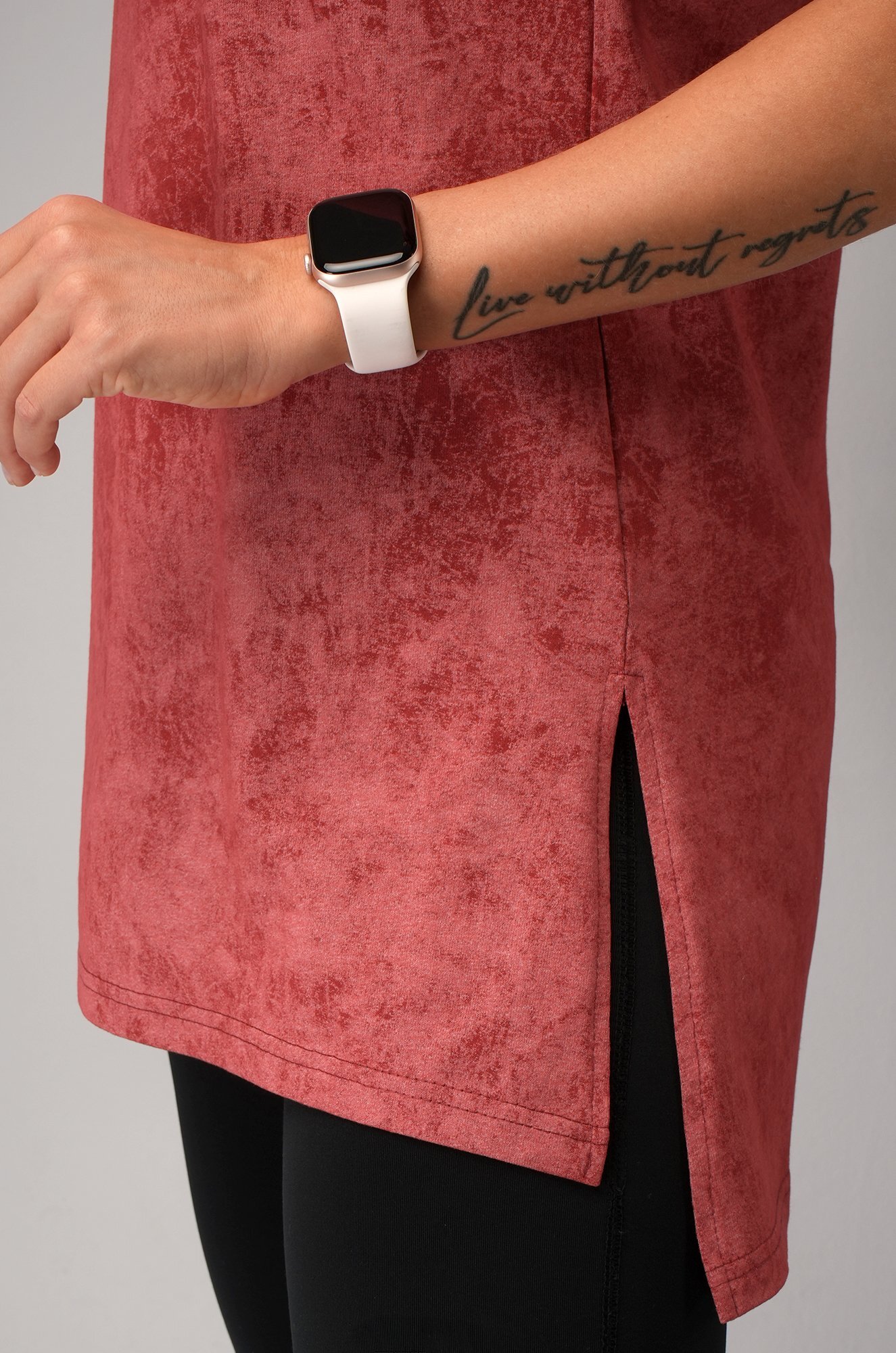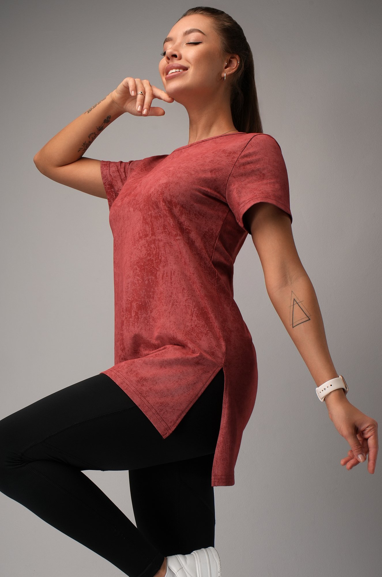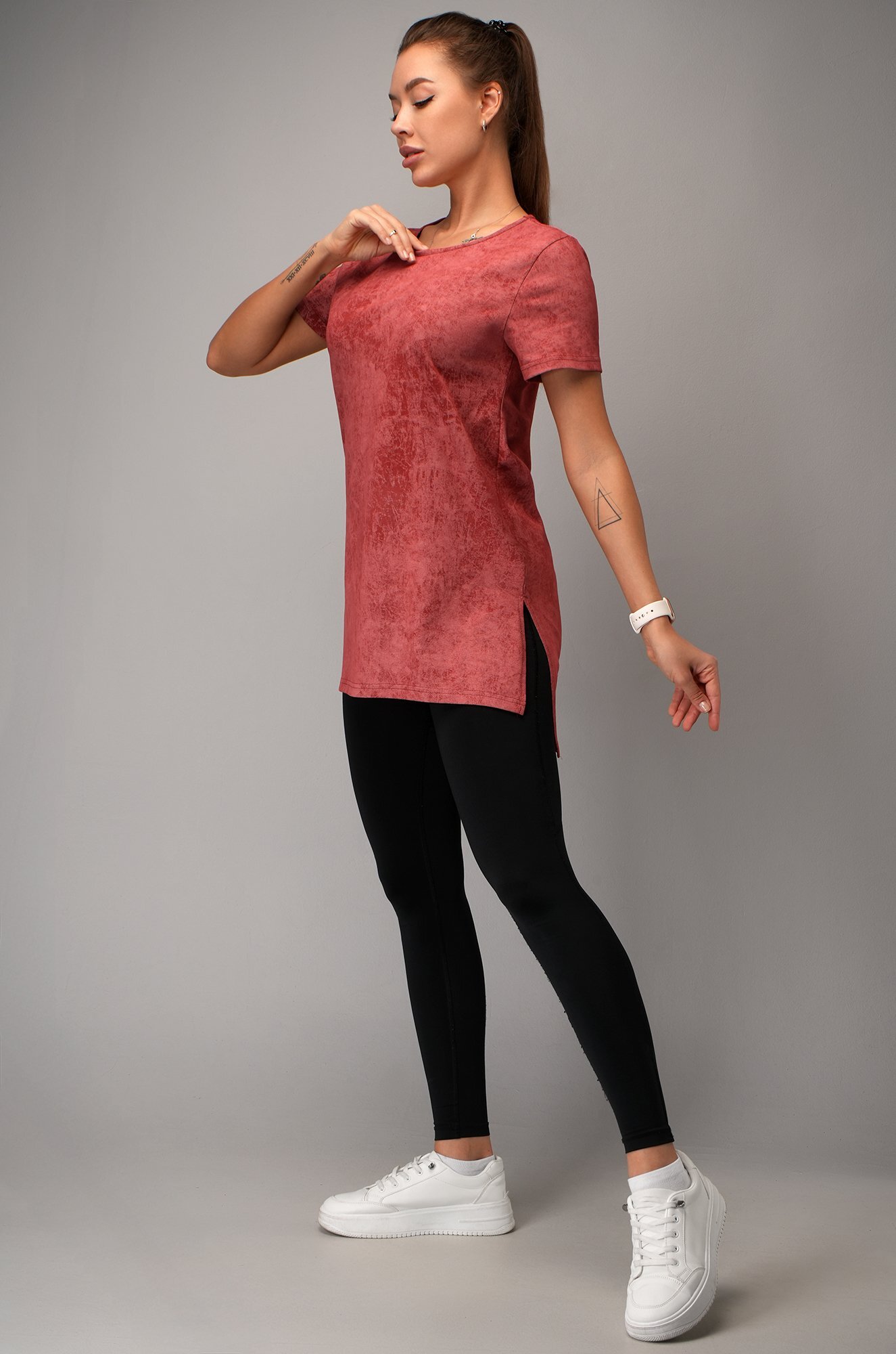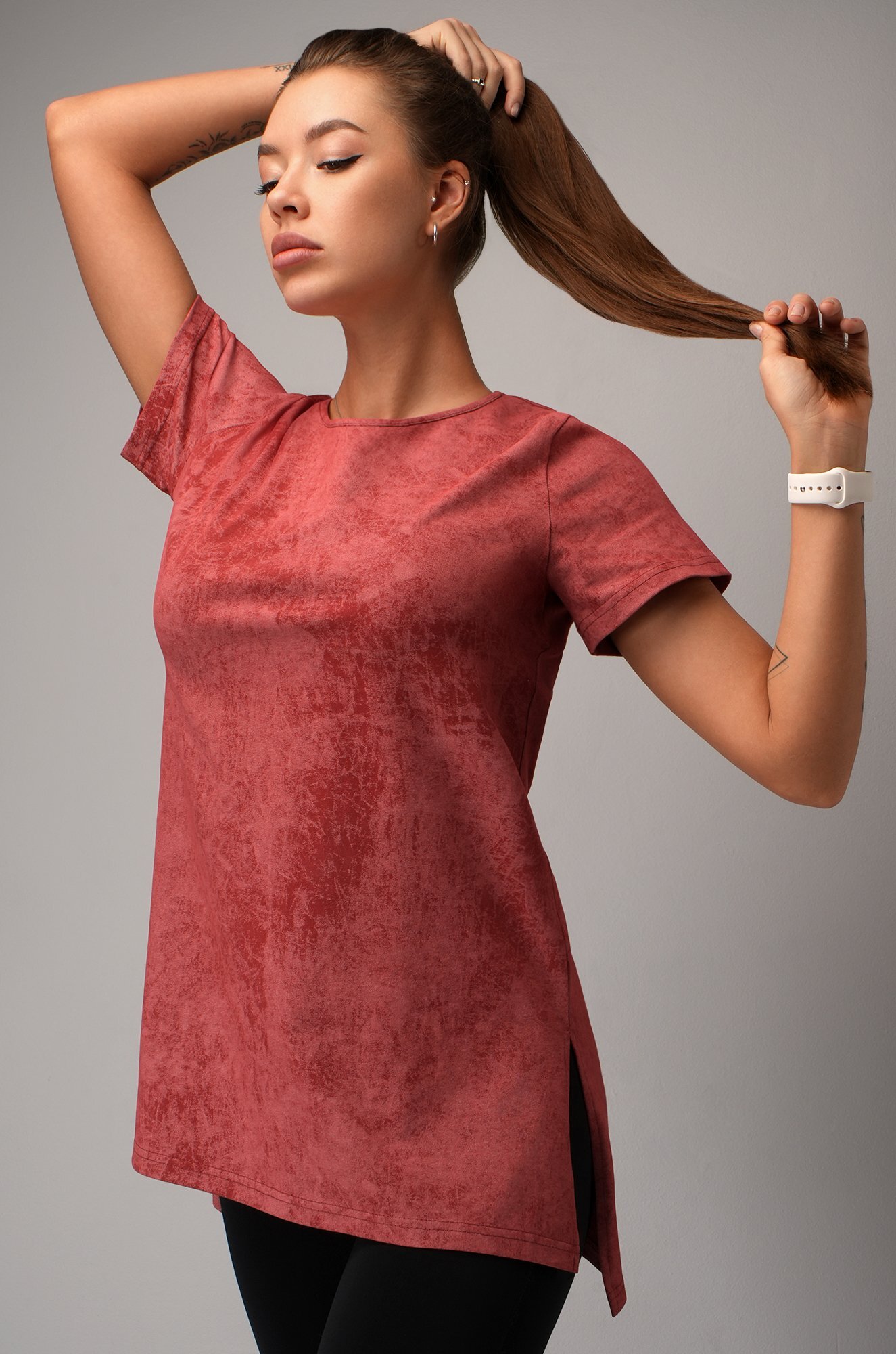 Женская футболка красного цвета с винтажным эффектом создана, чтобы дарить уют каждый день. Длинная и слегка приталенная модель подчеркивает фигуру и дарит комфортную посадку. Хлопковая туника станет любимицей как для дома, так и для прогулок.