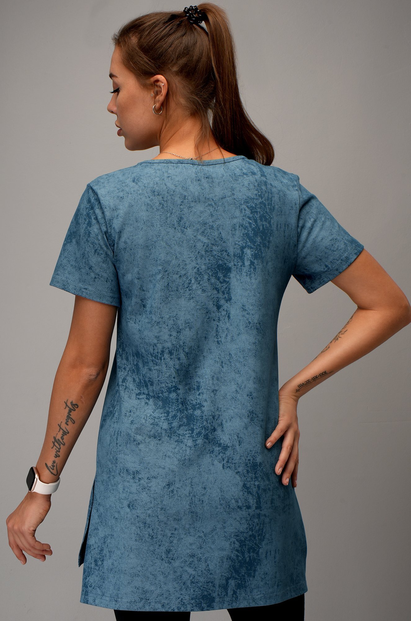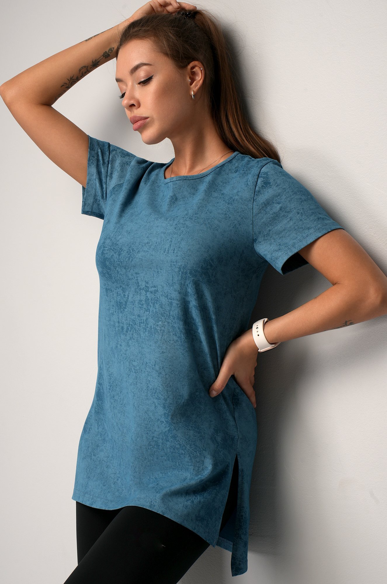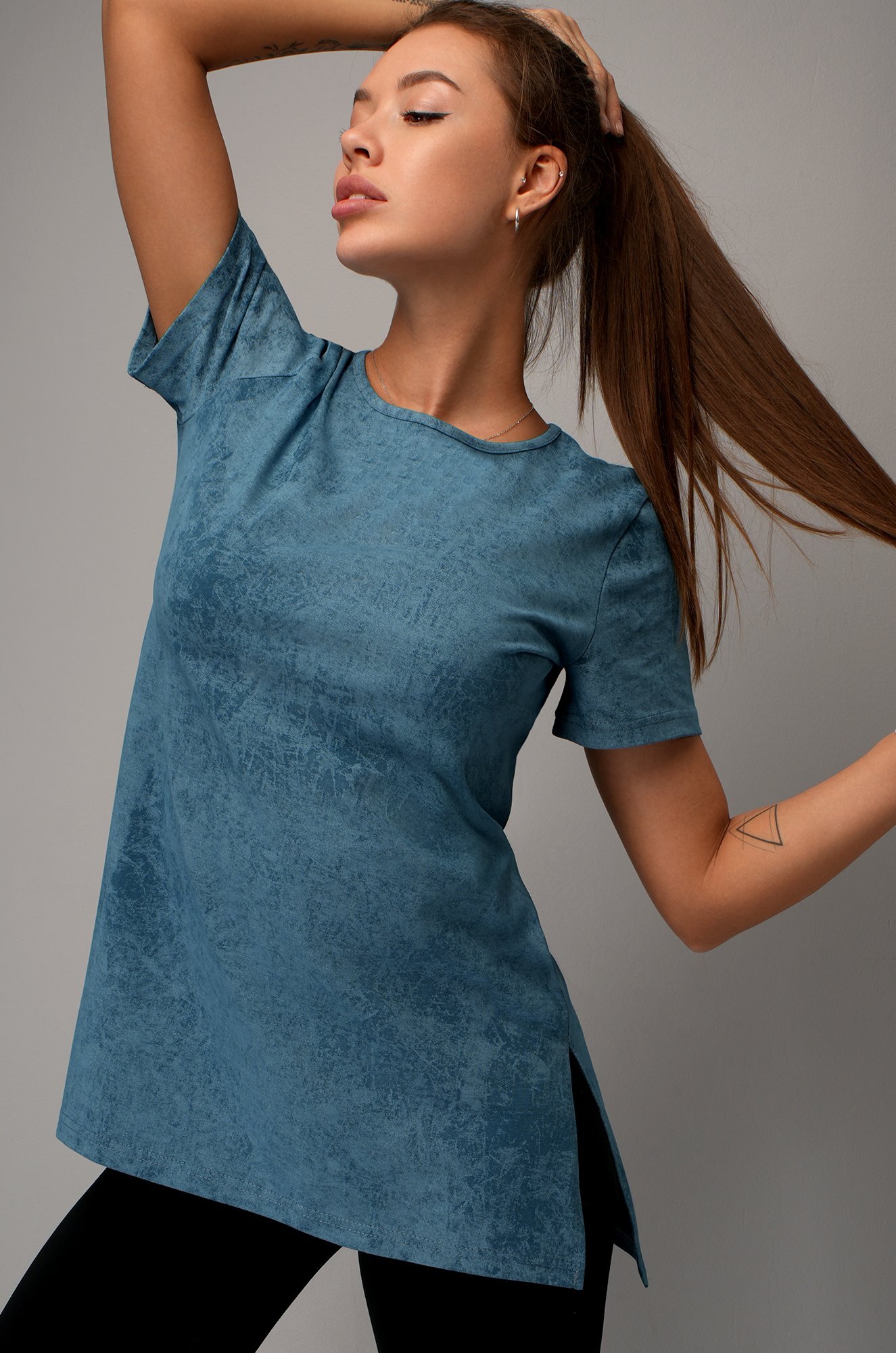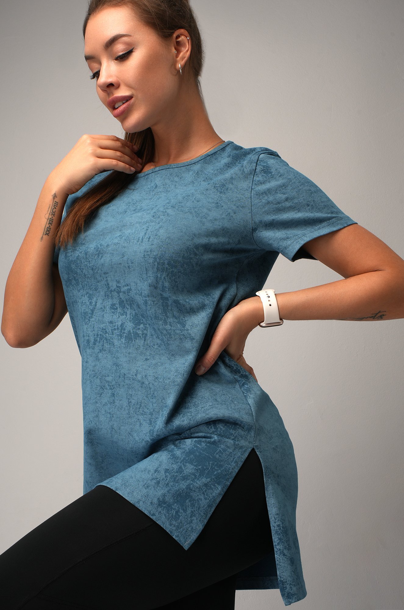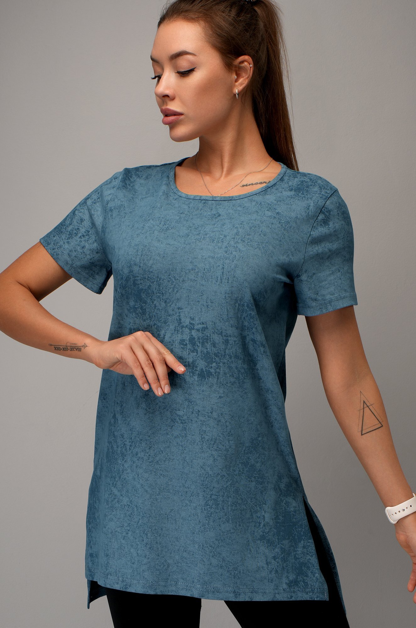 Женская футболка лазурного цвета с винтажным эффектом создана, чтобы дарить уют каждый день. Длинная и слегка приталенная модель подчеркивает фигуру и дарит комфортную посадку. Хлопковая туника станет любимицей как для дома, так и для прогулок.