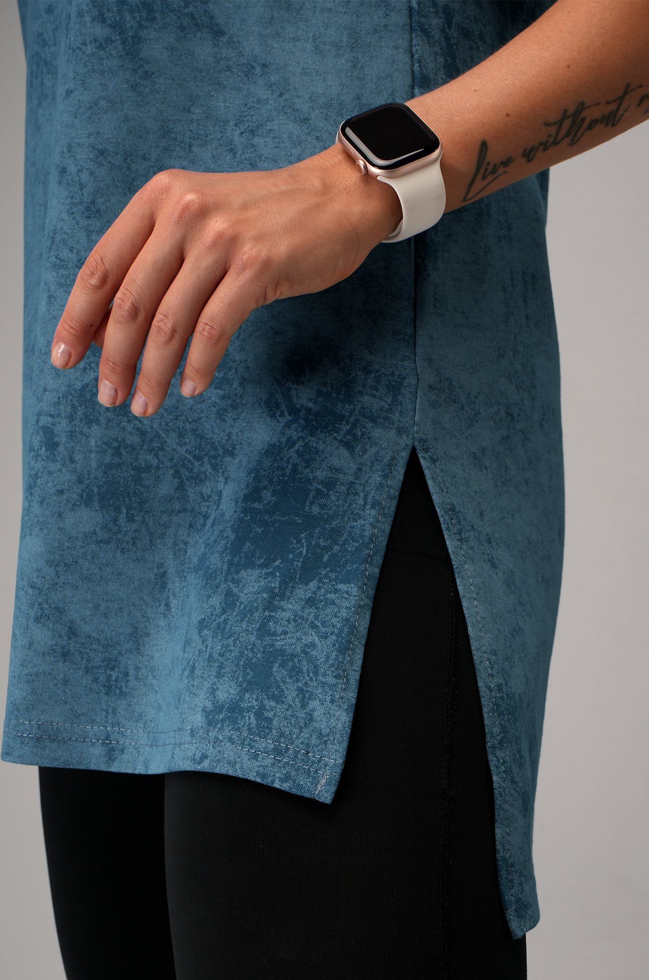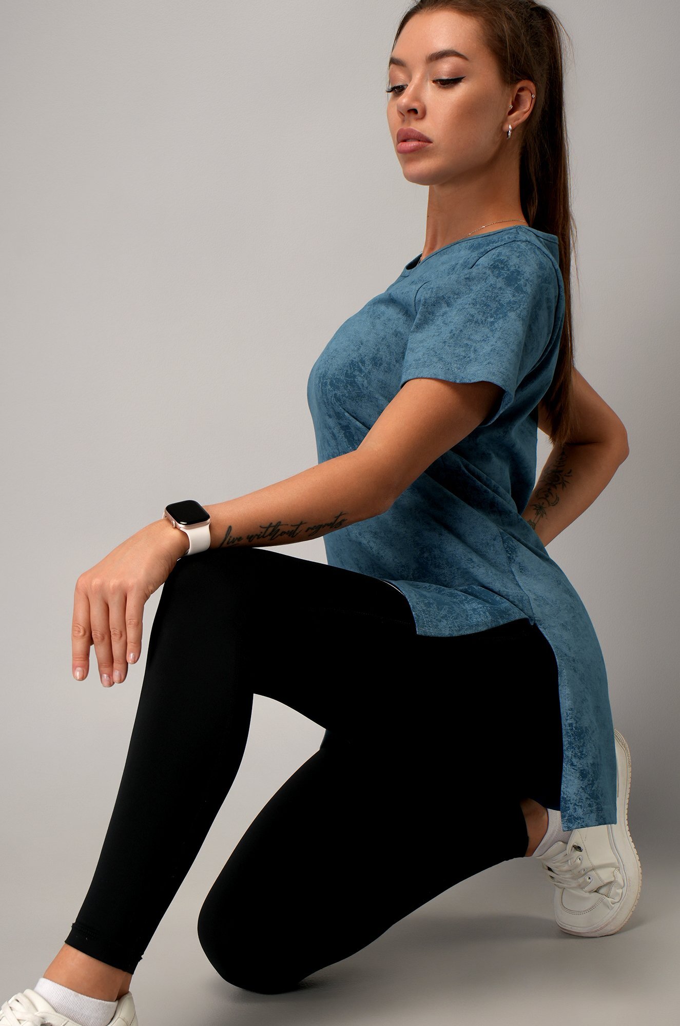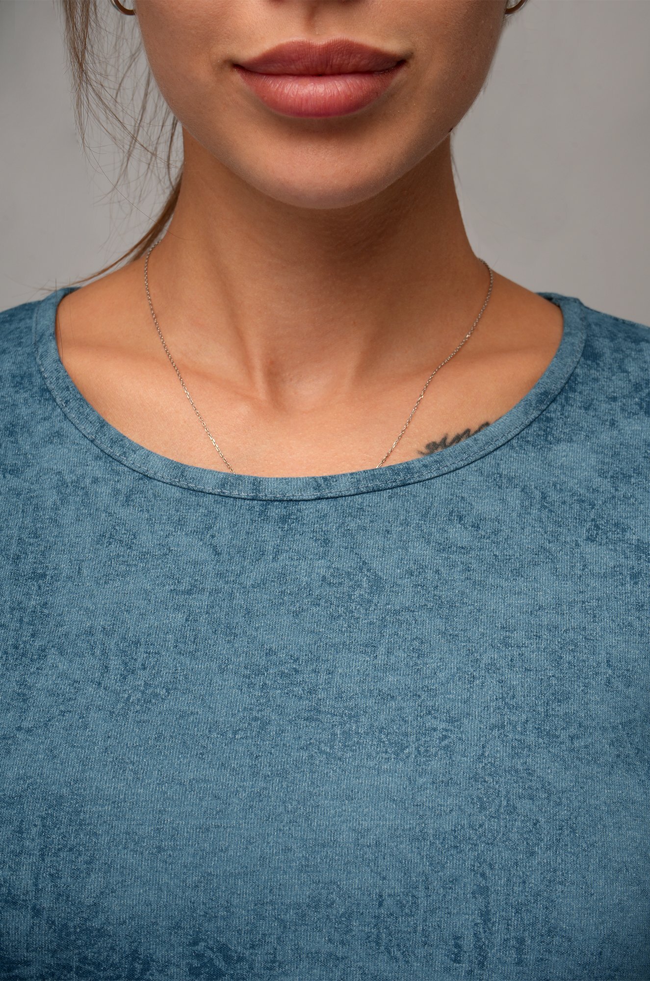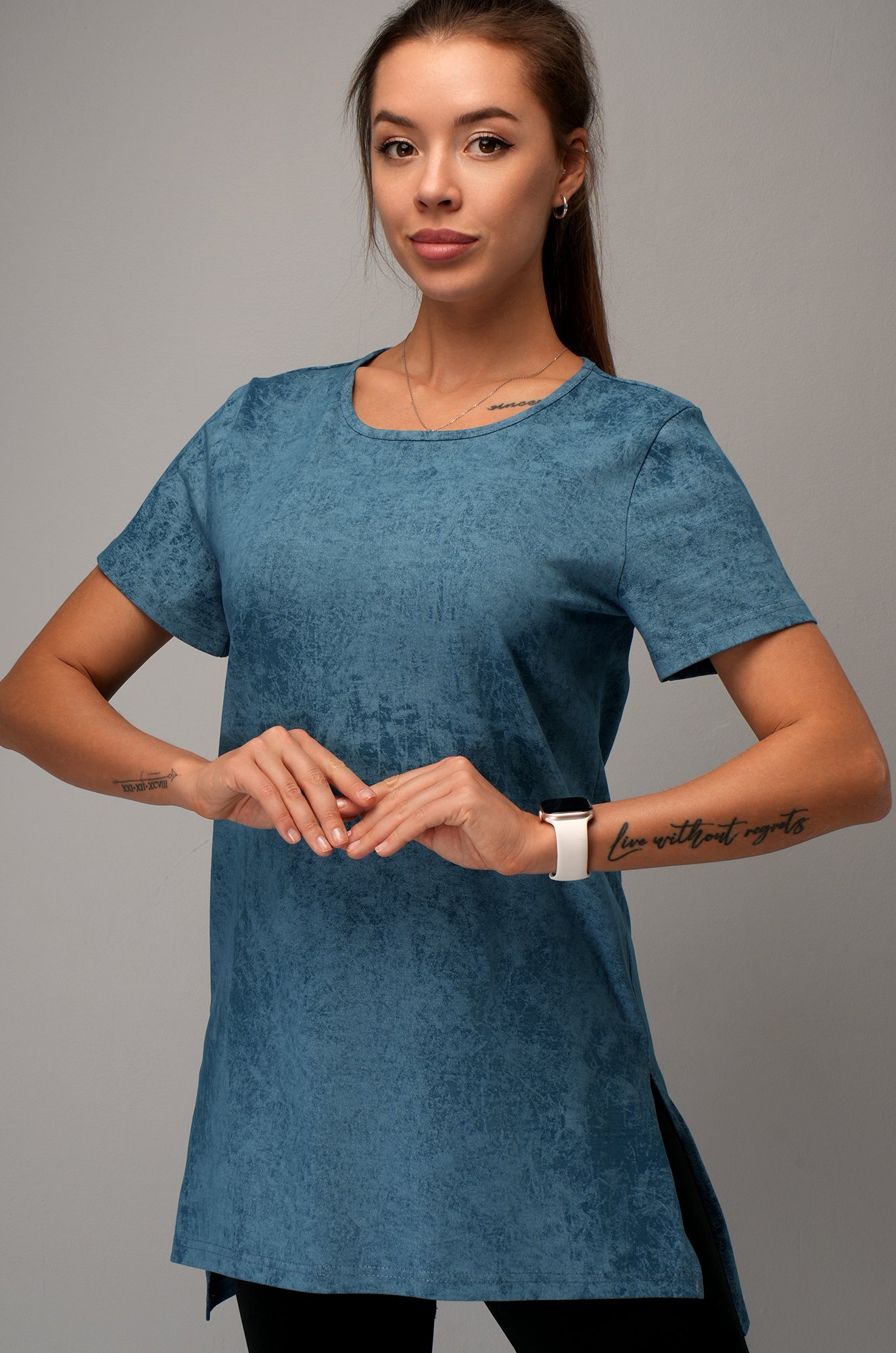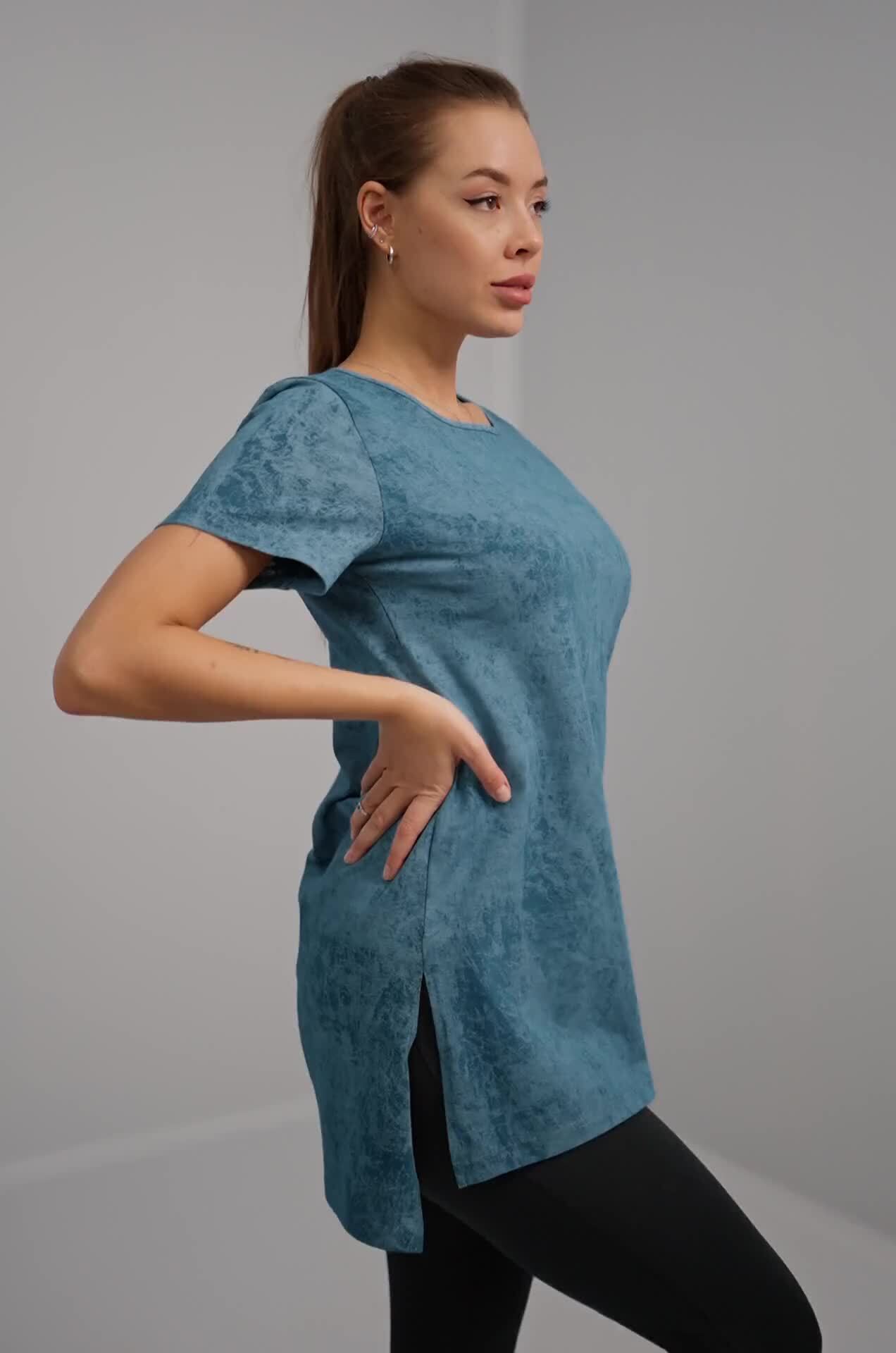 Женская футболка лазурного цвета с винтажным эффектом создана, чтобы дарить уют каждый день. Длинная и слегка приталенная модель подчеркивает фигуру и дарит комфортную посадку. Хлопковая туника станет любимицей как для дома, так и для прогулок.