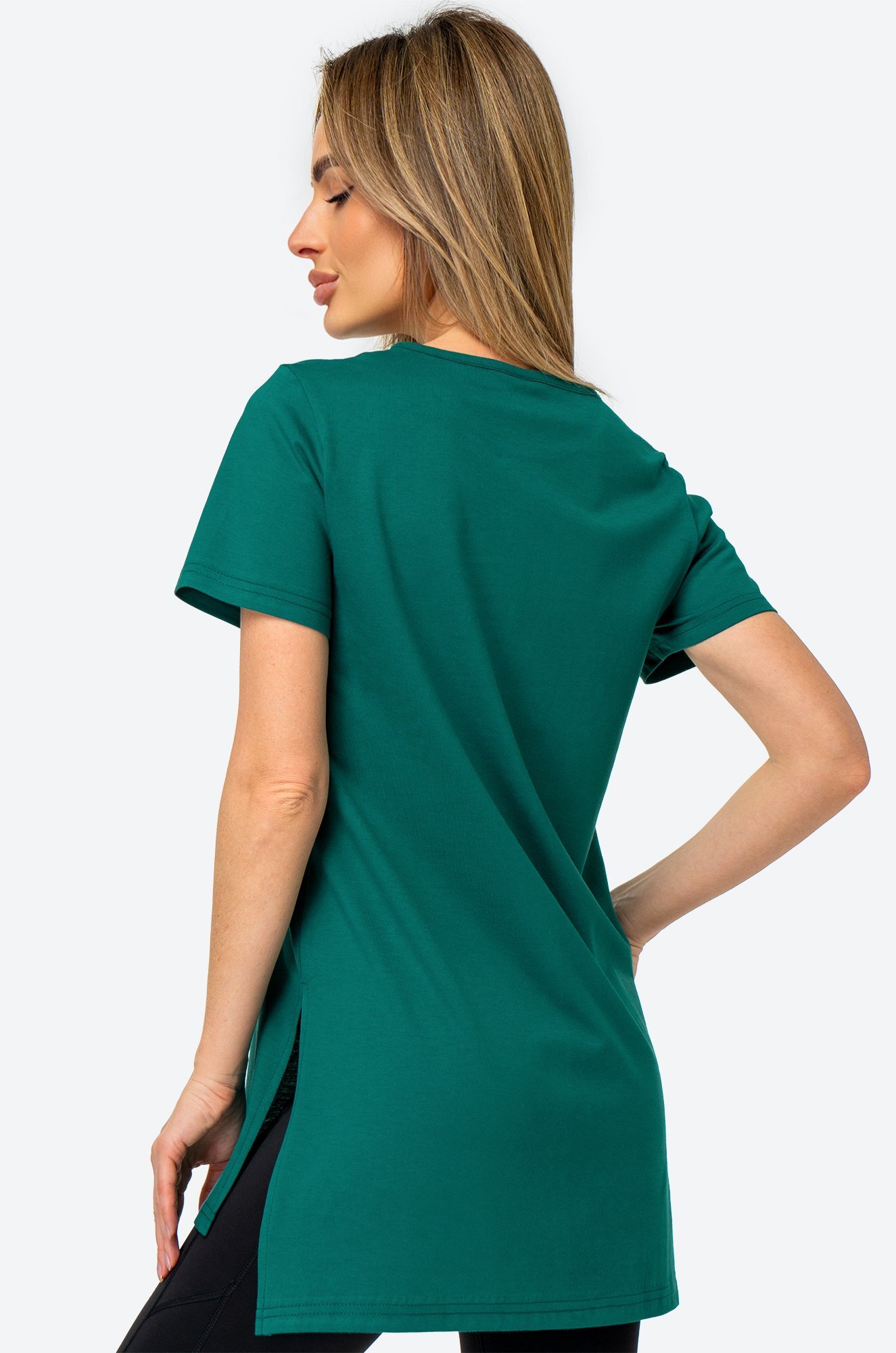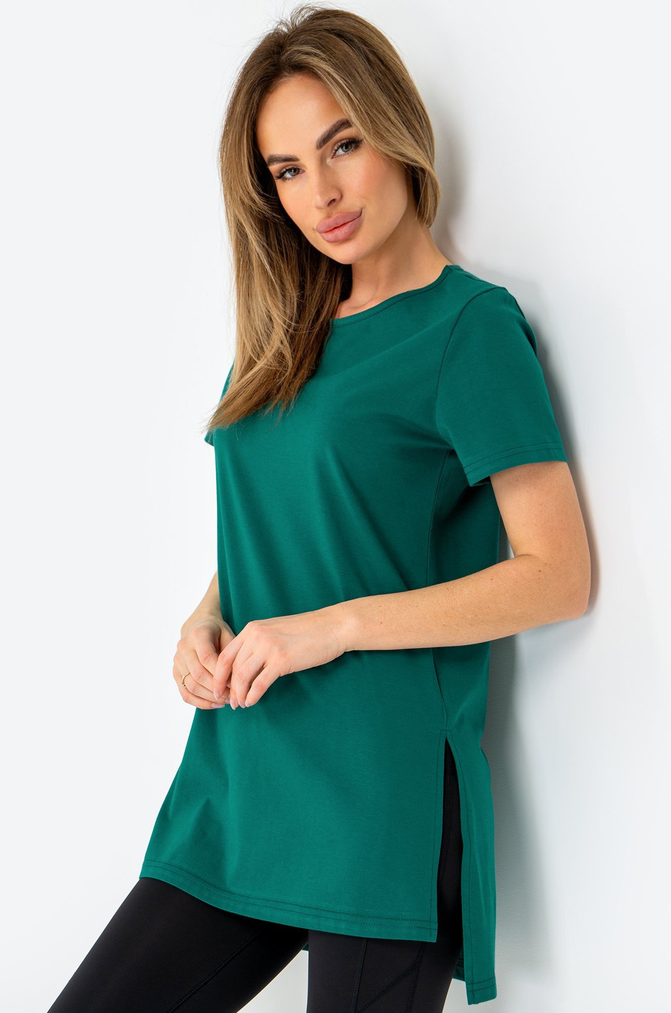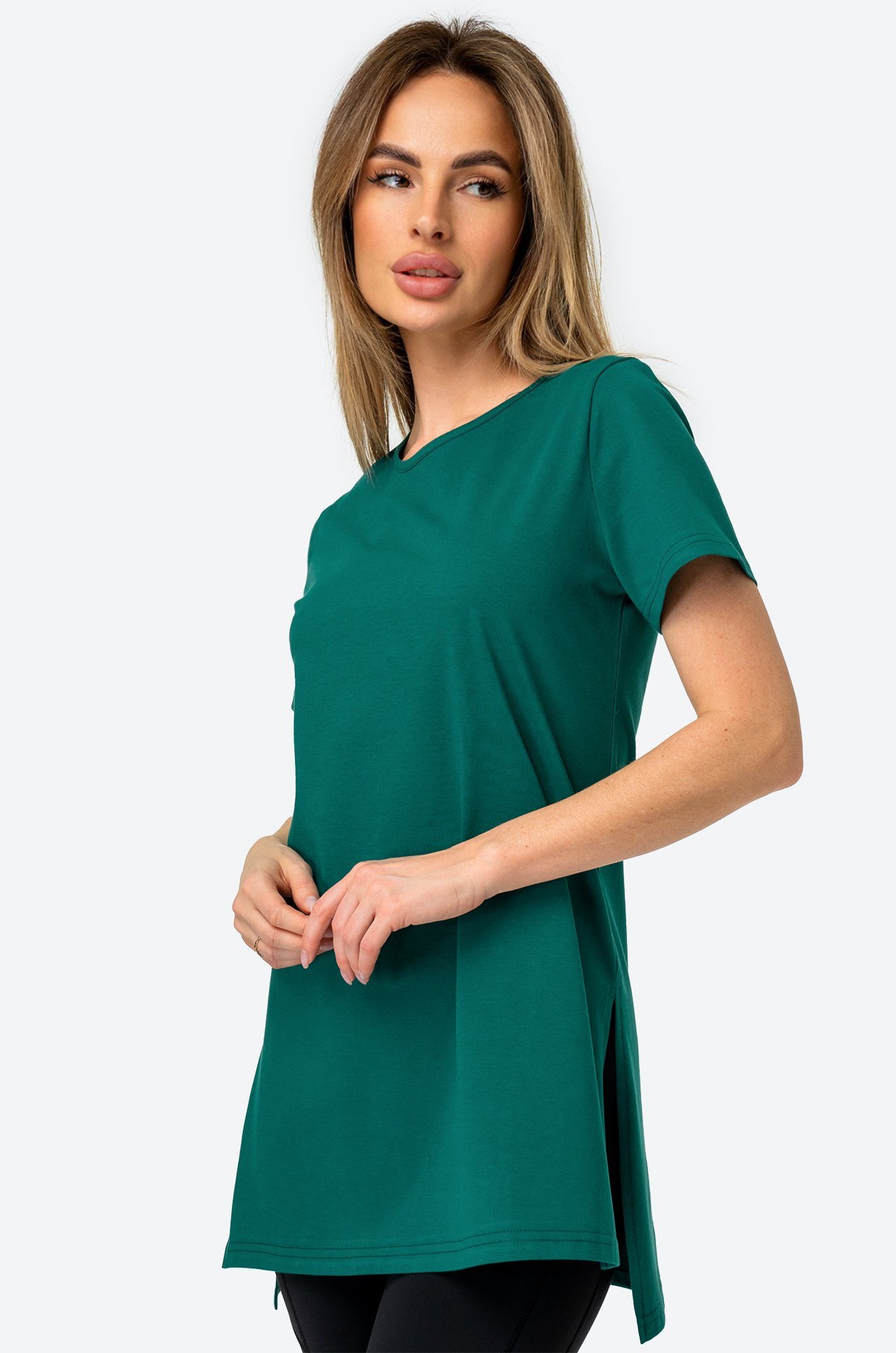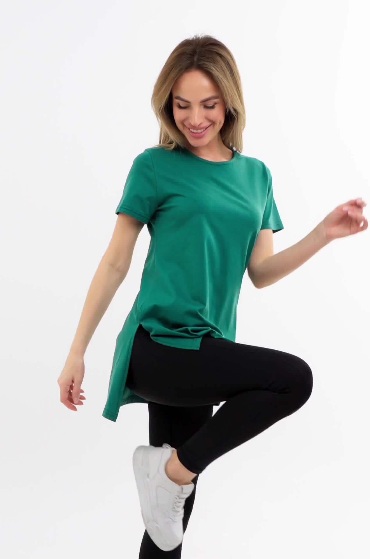 Женская футболка изумрудного цвета создана, чтобы дарить уют каждый день. Длинная и слегка приталенная модель подчеркивает фигуру и дарит комфортную посадку. Хлопковая туника станет любимицей как для дома, так и для прогулок.