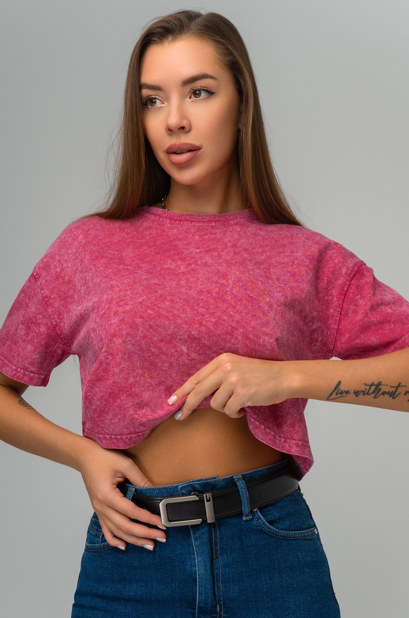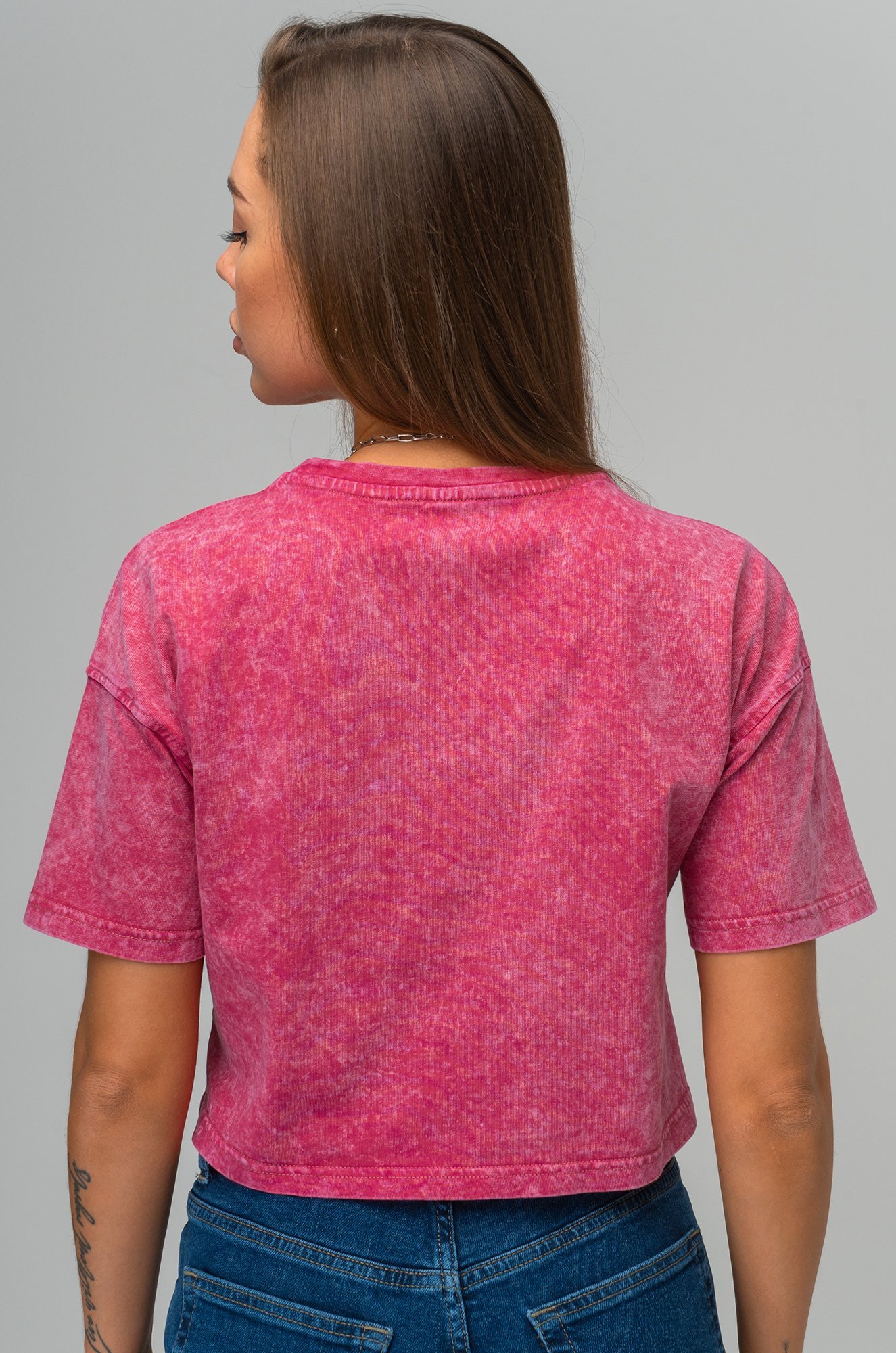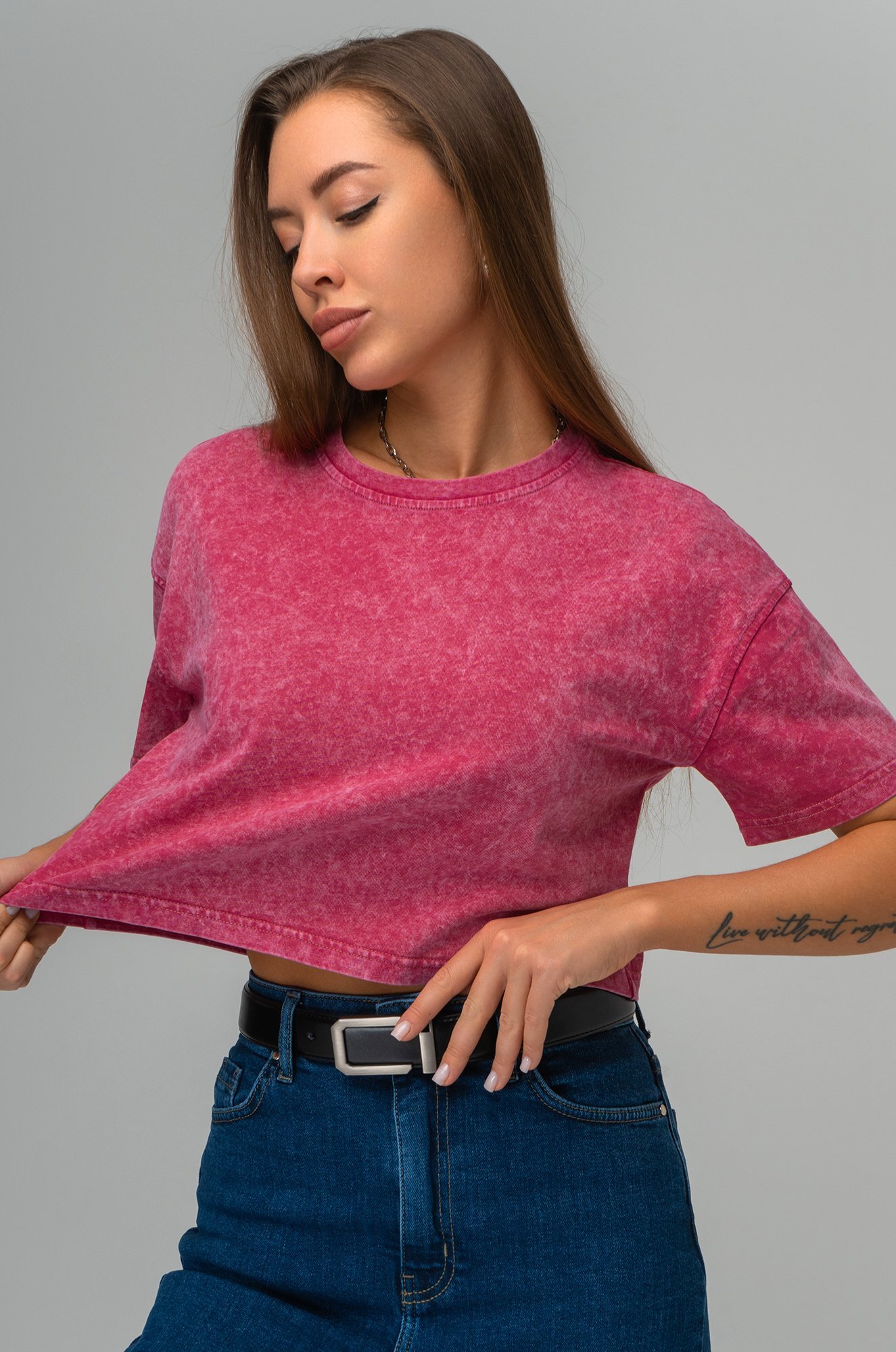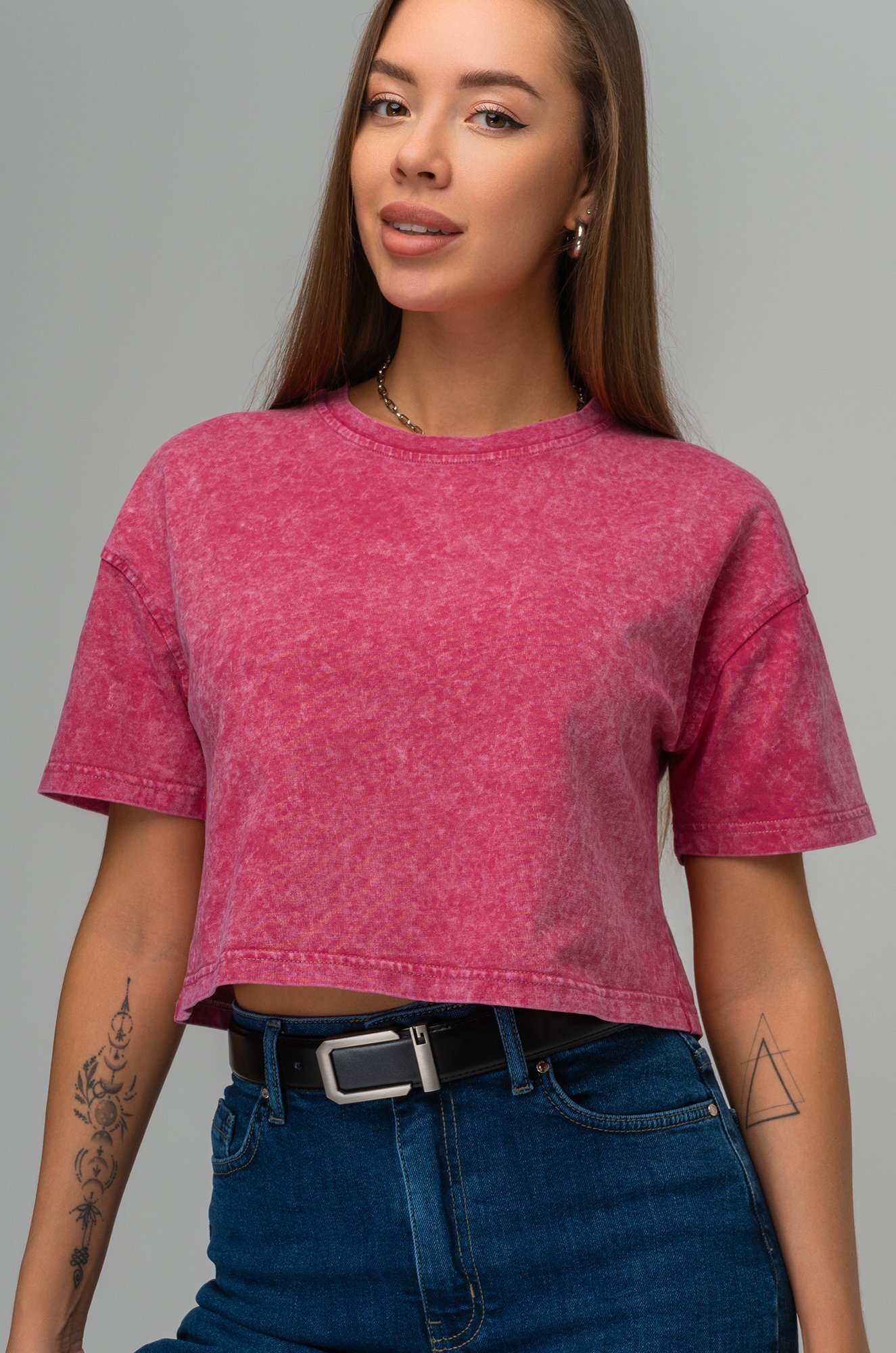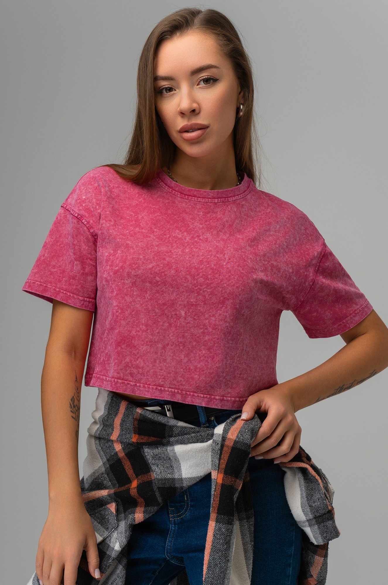 Укороченная женская футболка розового цвета – идеальный вариант в кэжуал стиле. Круглый вырез горловины, короткий рукав и силуэт оверсайз окунут в мир свободы и комфорта и сделают футболку для женщин и девушек максимально удобной!