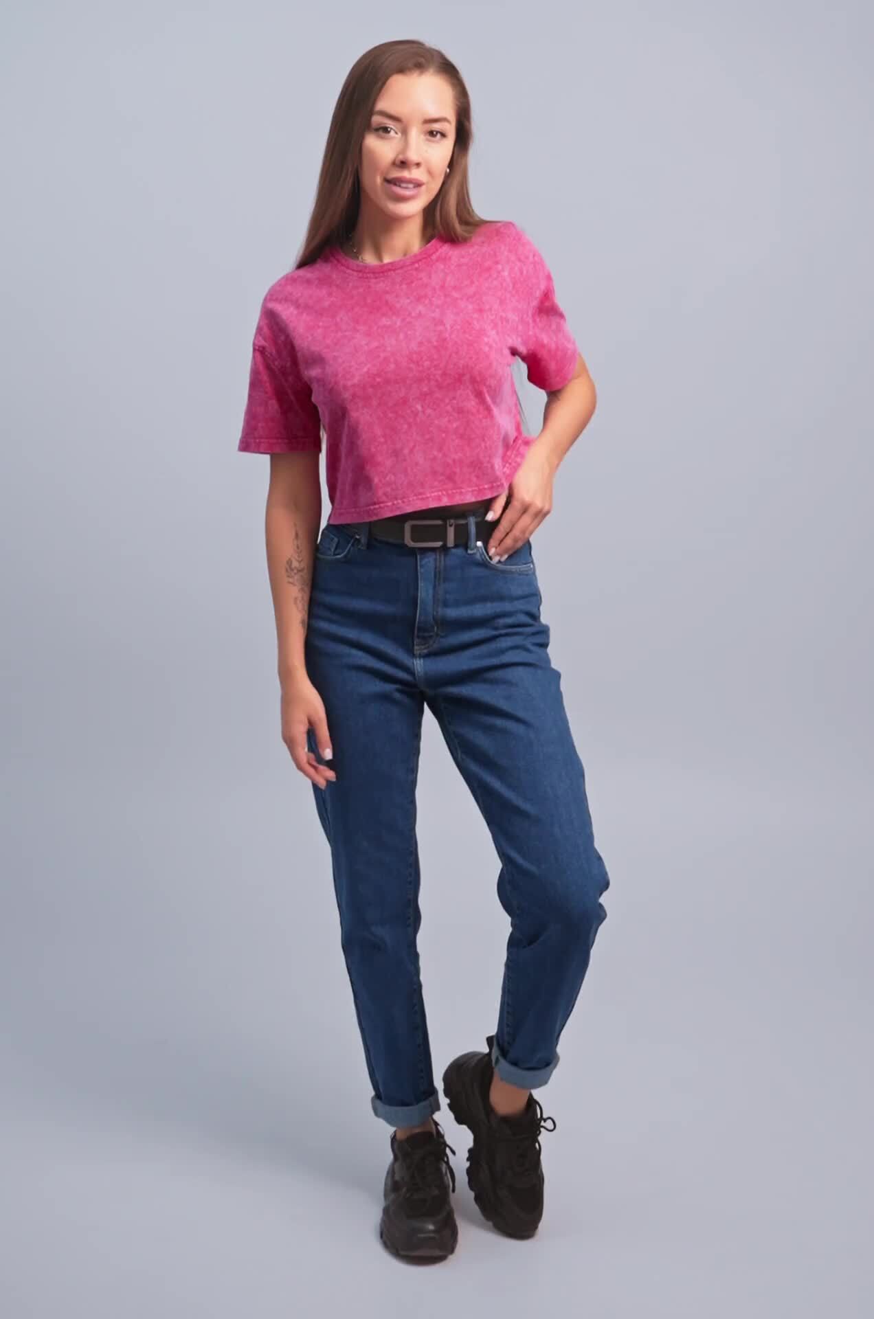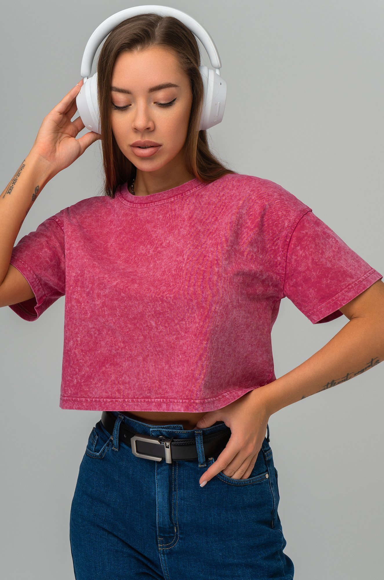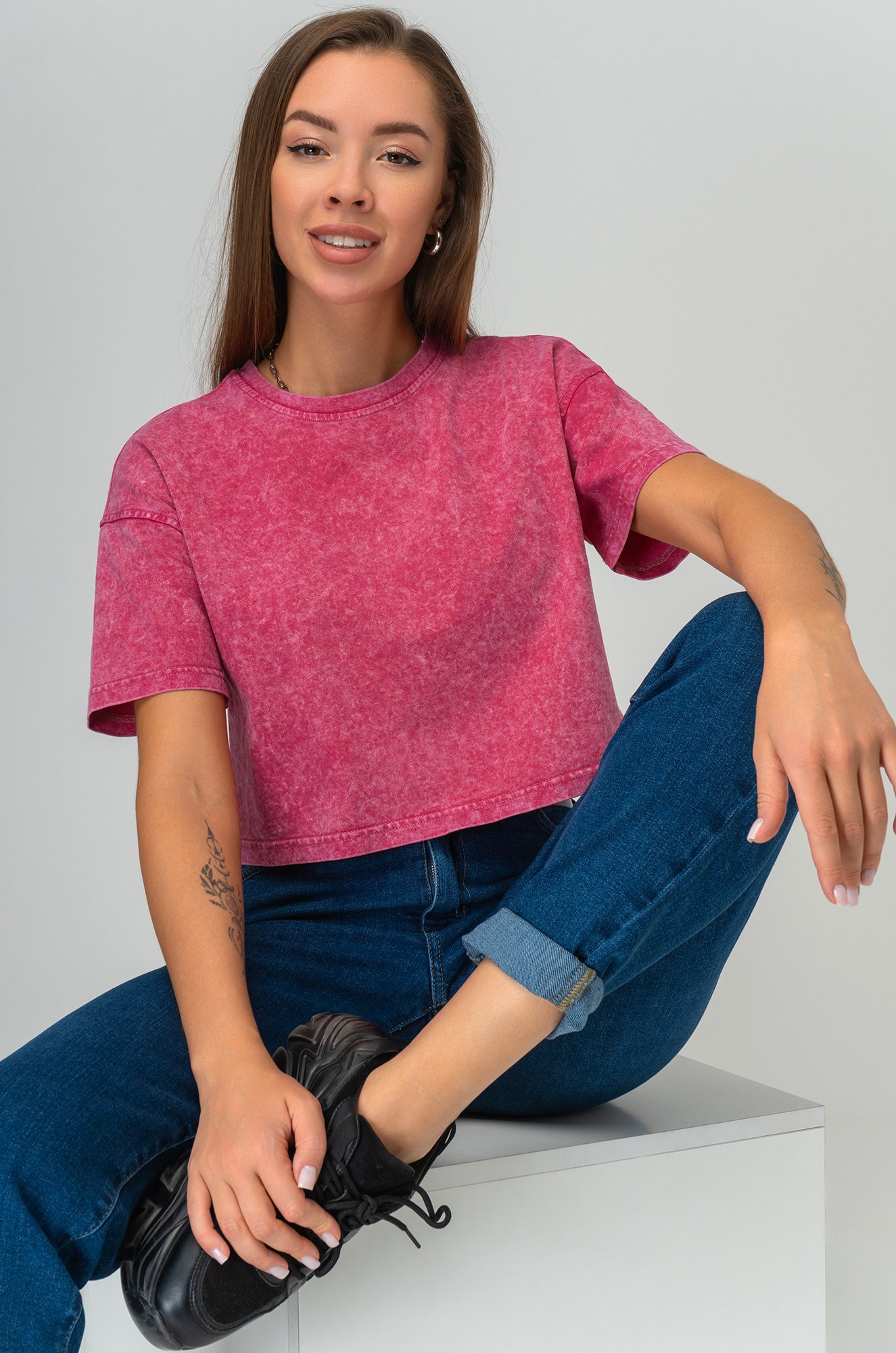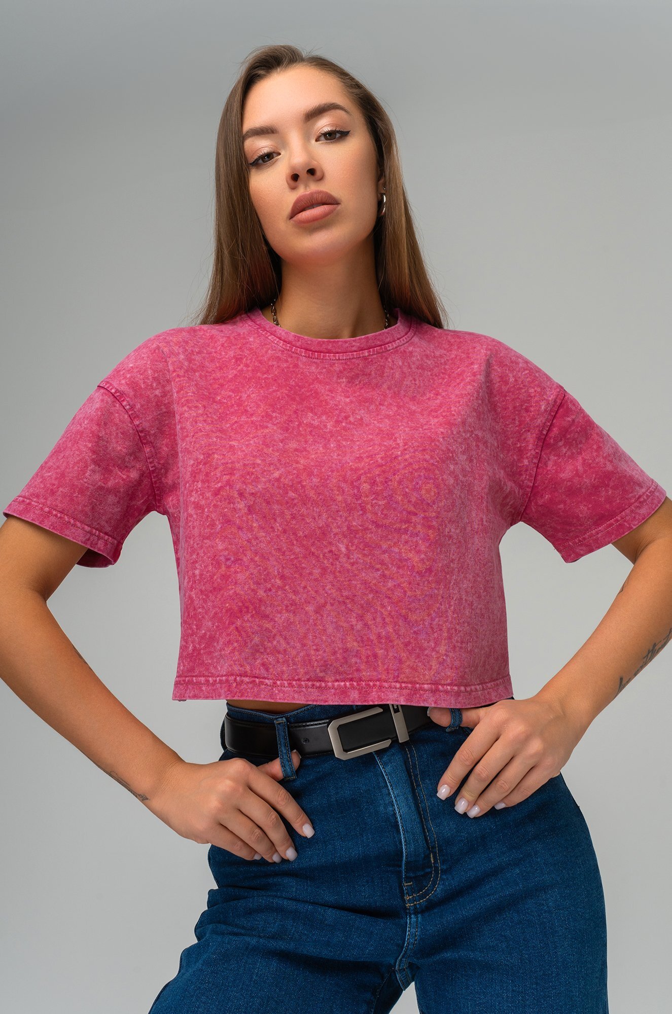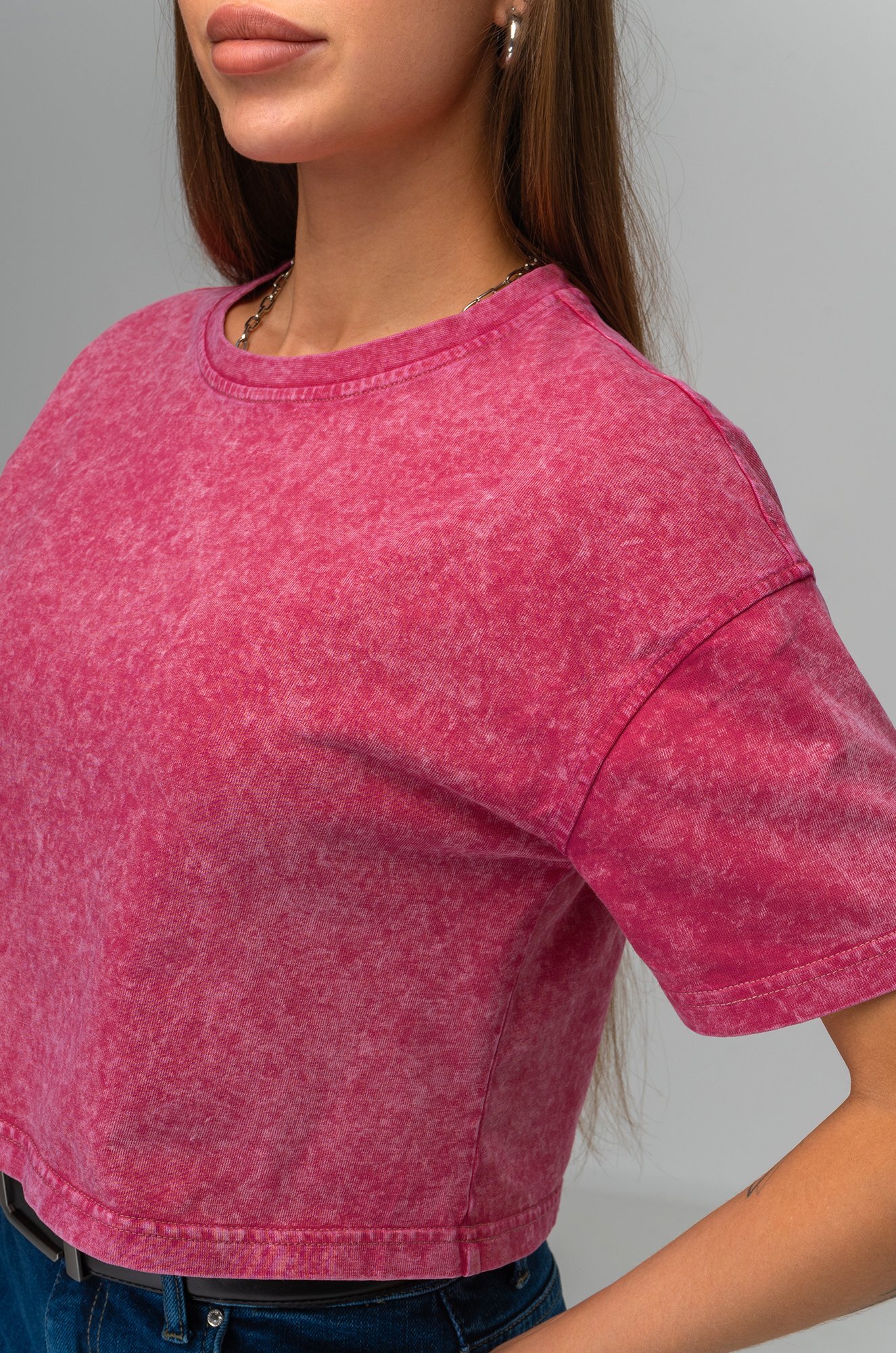 Укороченная женская футболка розового цвета – идеальный вариант в кэжуал стиле. Круглый вырез горловины, короткий рукав и силуэт оверсайз окунут в мир свободы и комфорта и сделают футболку для женщин и девушек максимально удобной!