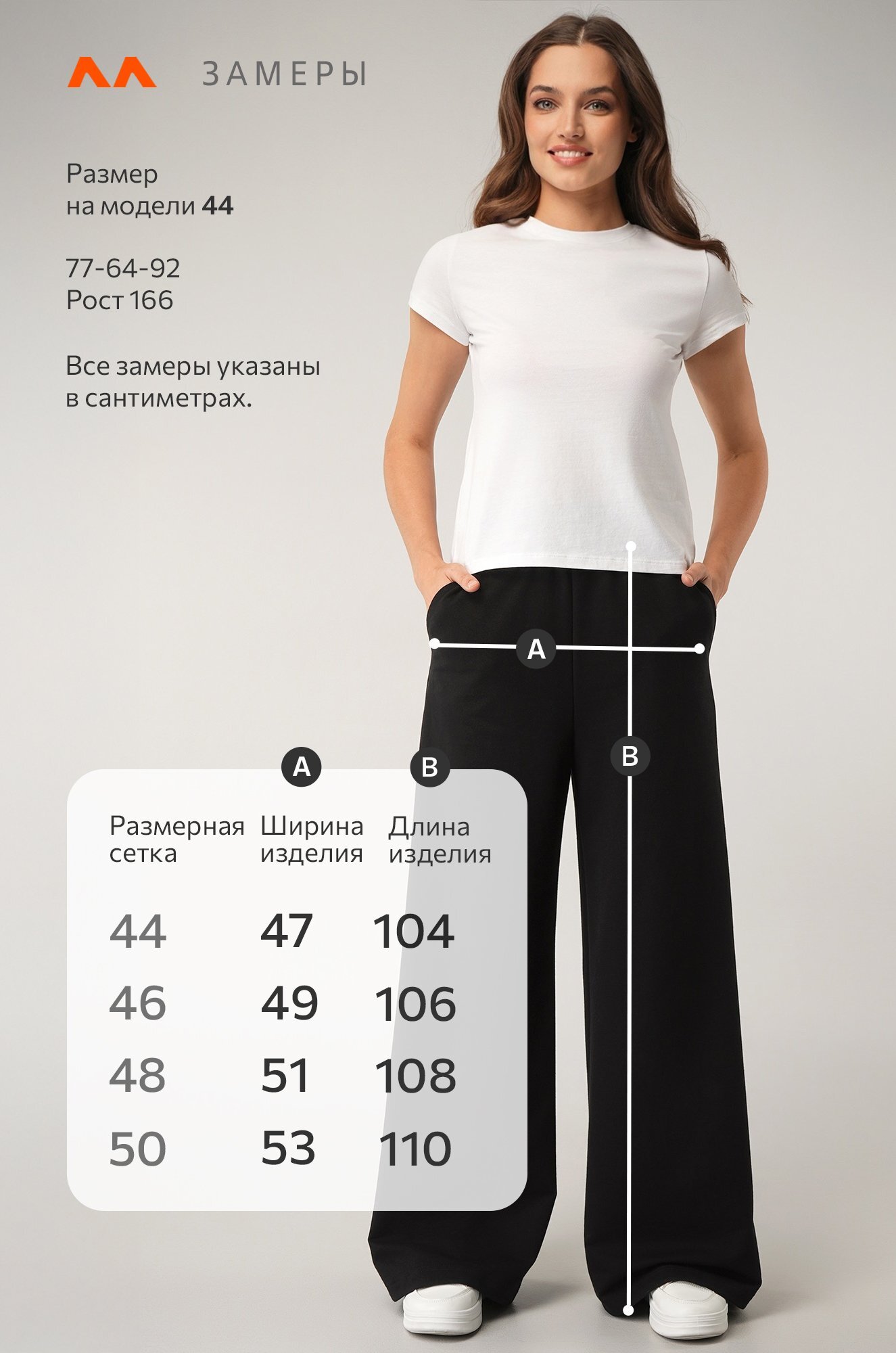 Размер 50: длина внешн.шва:110 см; длина внутр.шва:75 см; ширина по бедрам:53 см.