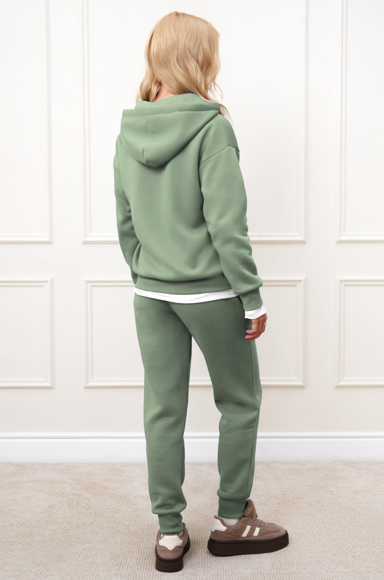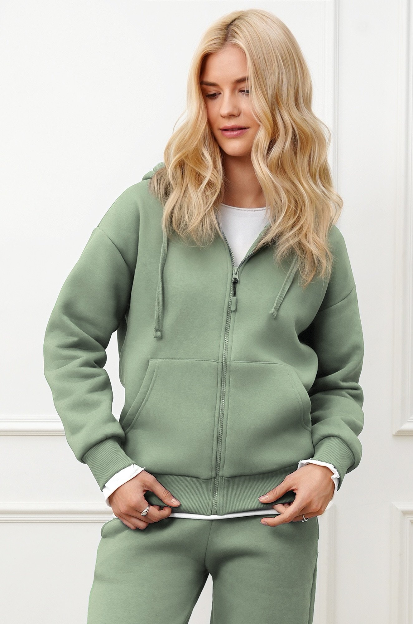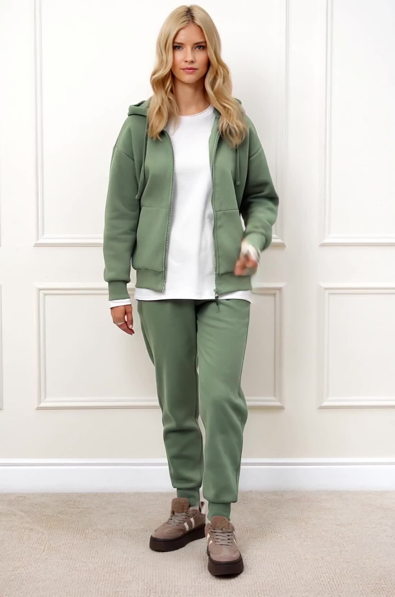 Женский теплый костюм с начесом — стильное и практичное решение для холодного времени года. В набор входят худи на молнии с капюшоном и удобные брюки-джоггеры.