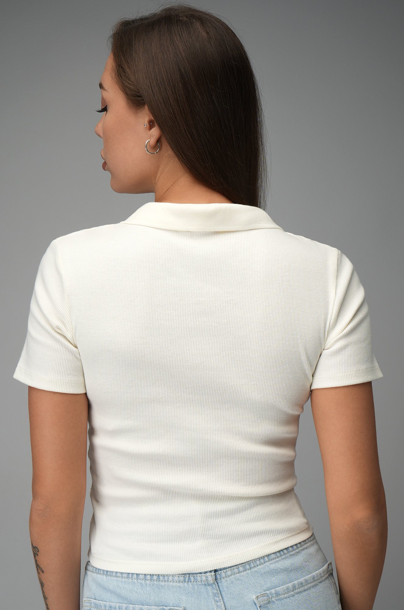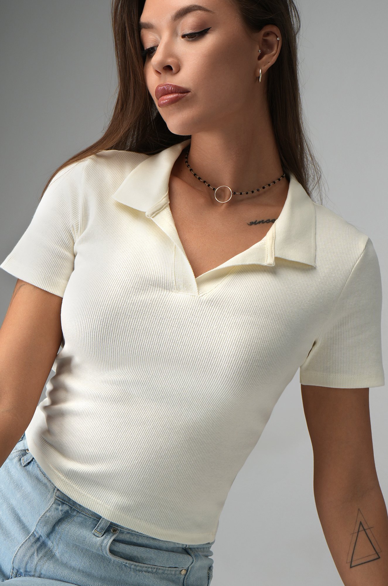 Женская футболка-поло в рубчик выполнена из нежного трикотажа кашкорсе. Базовая модель поможет создать крутой кэжуал образ. Молочная футболка для женщин приковывает взгляды благодаря эффектному сочетанию V-образного выреза и лаконичного отложного воротника!