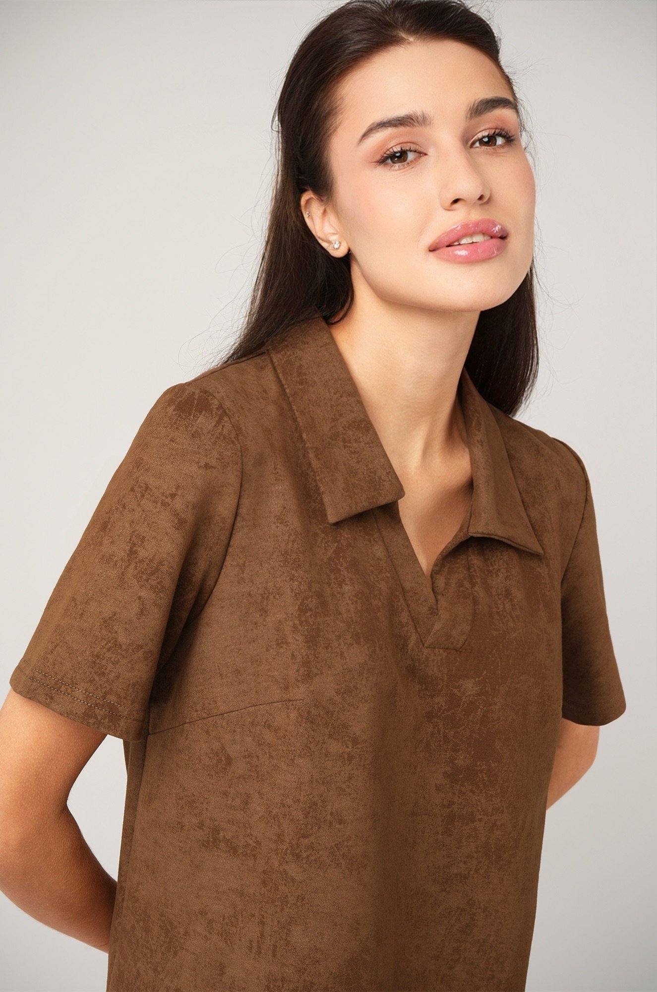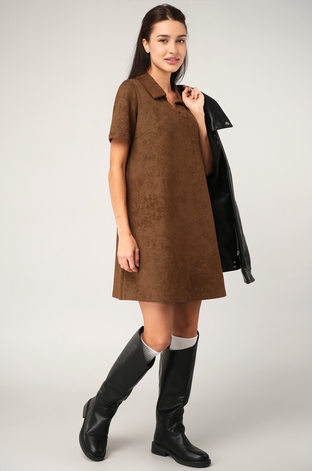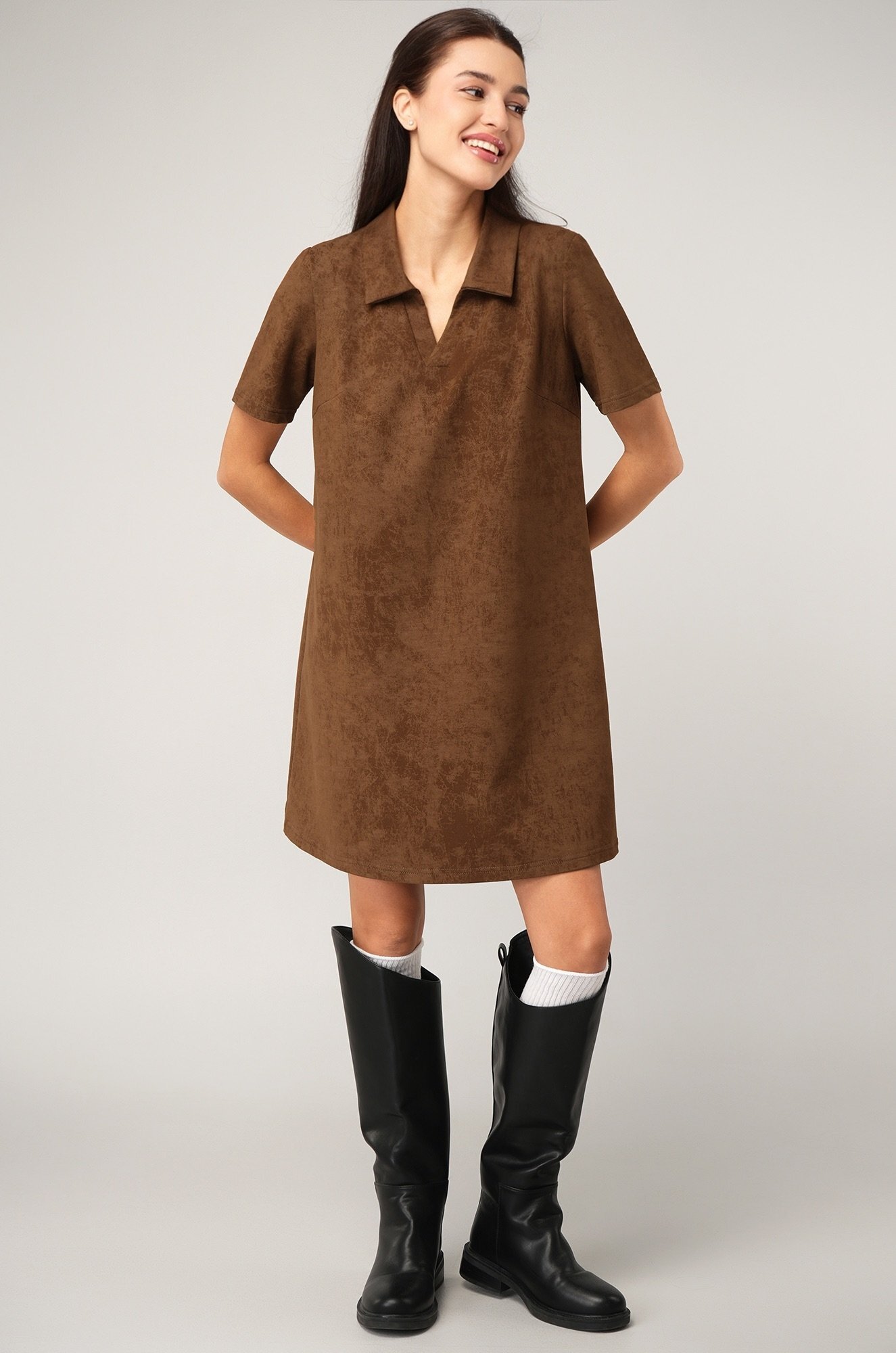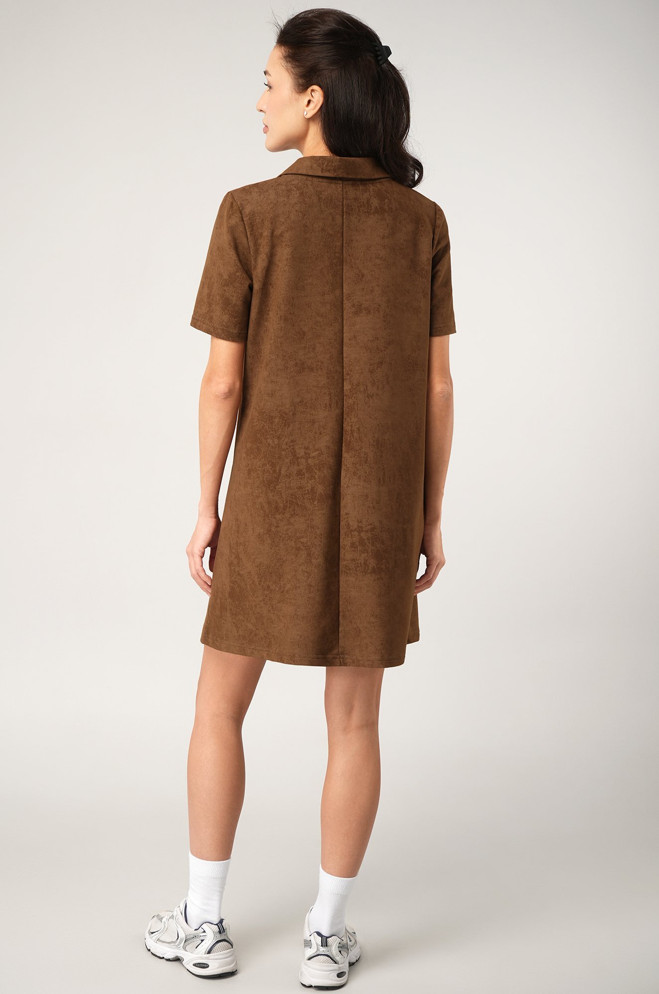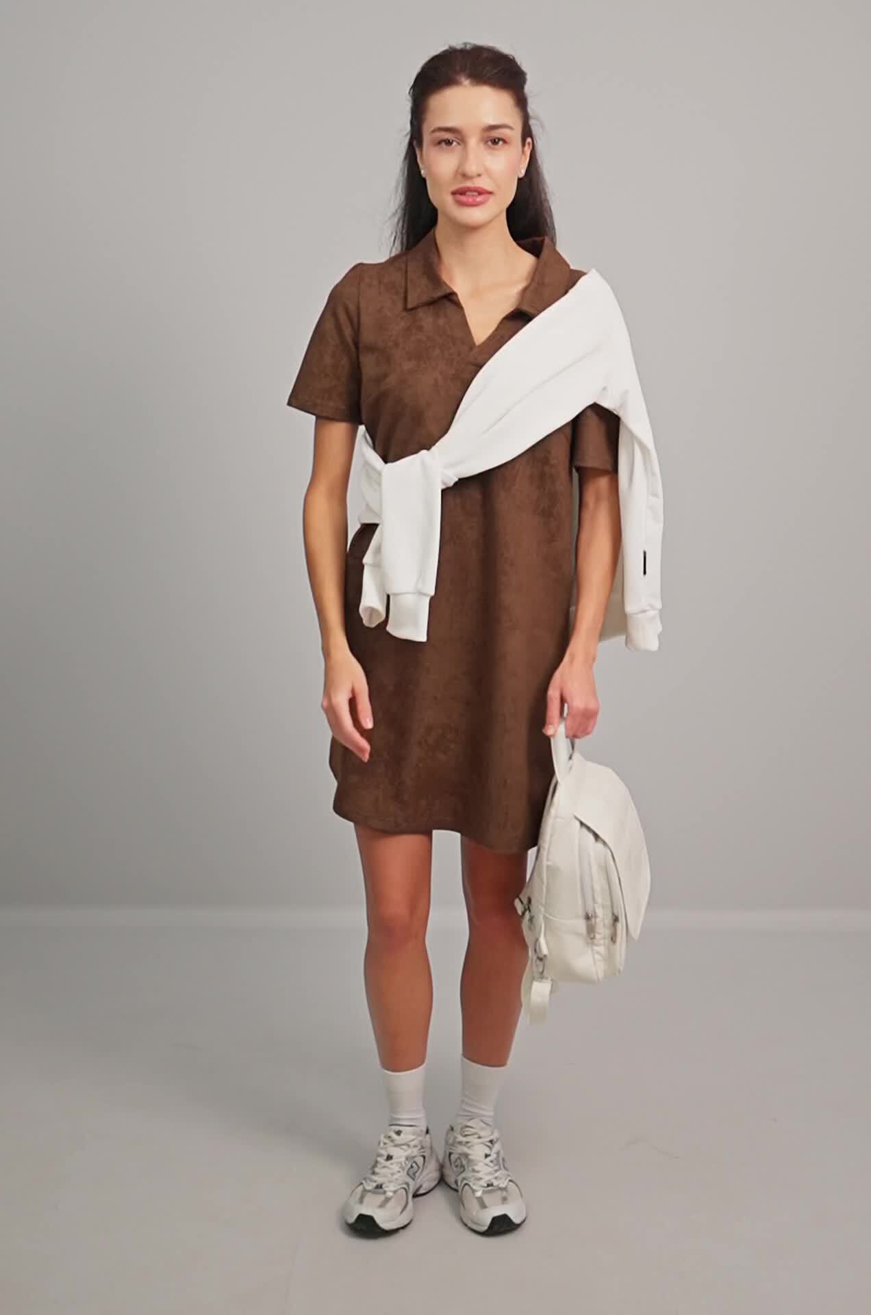 Коричневое платье — прекрасное решение для образов в спортивном стиле.