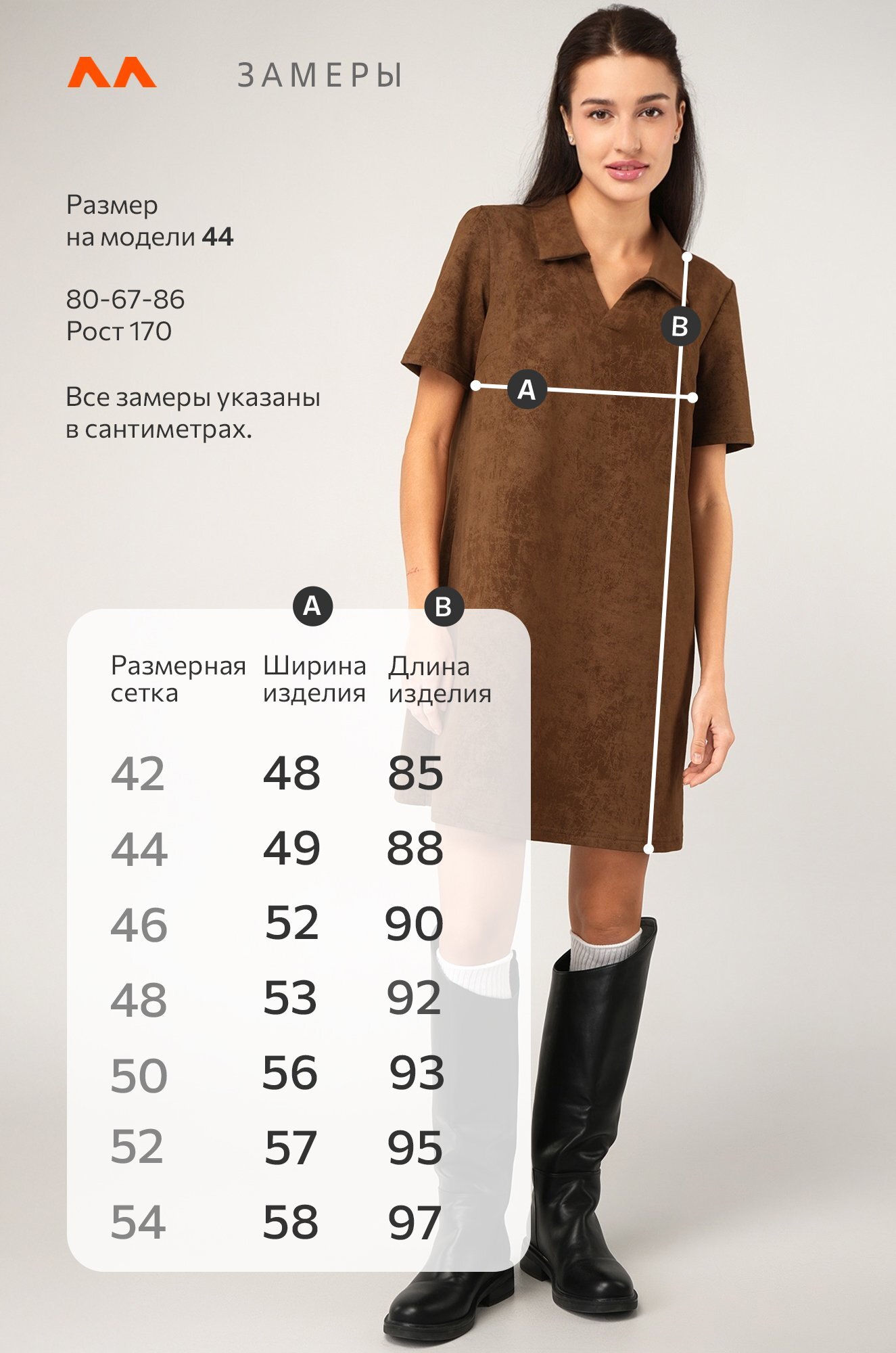 Размер 44: длина:88 см; ширина:49 см.